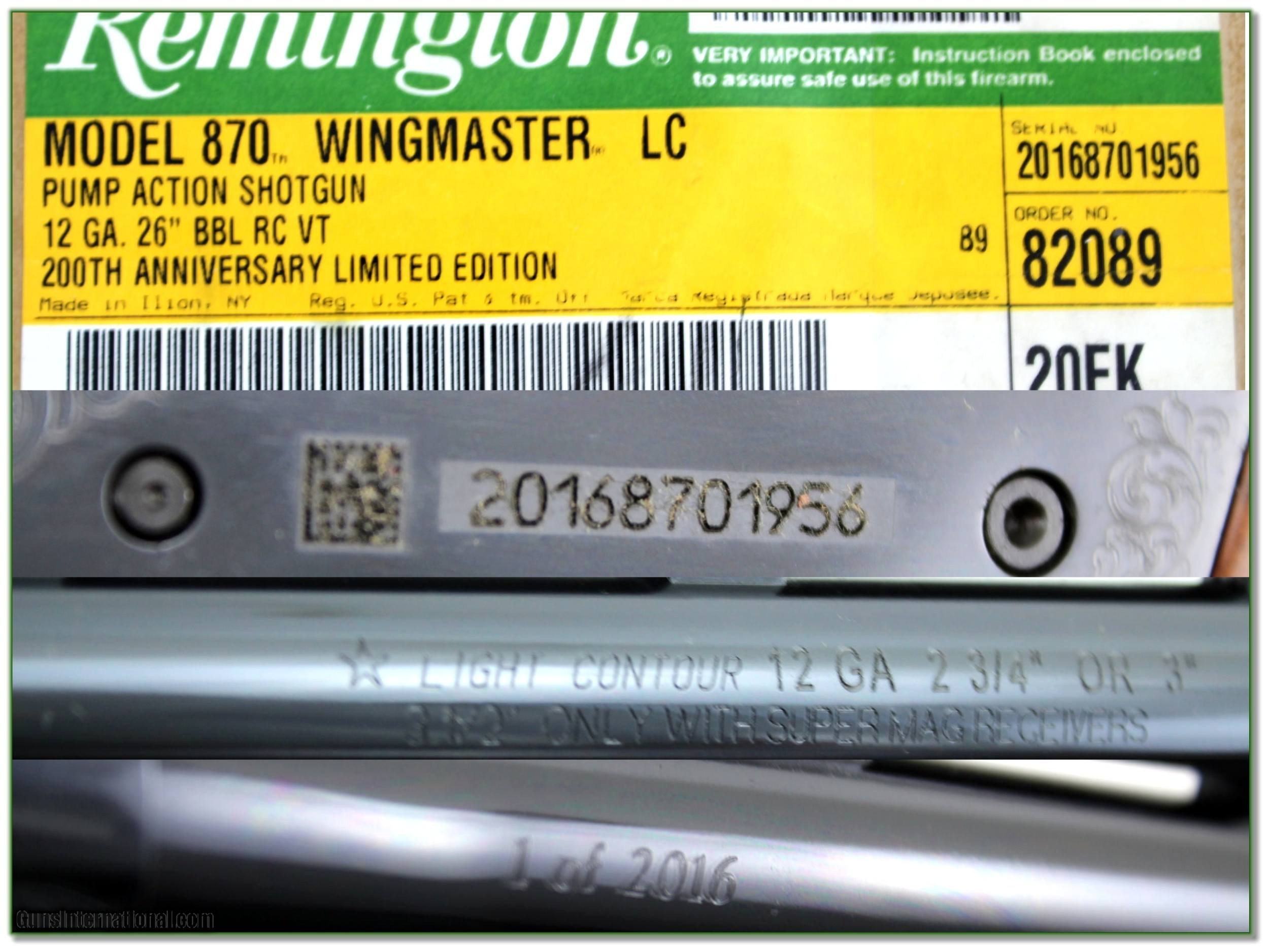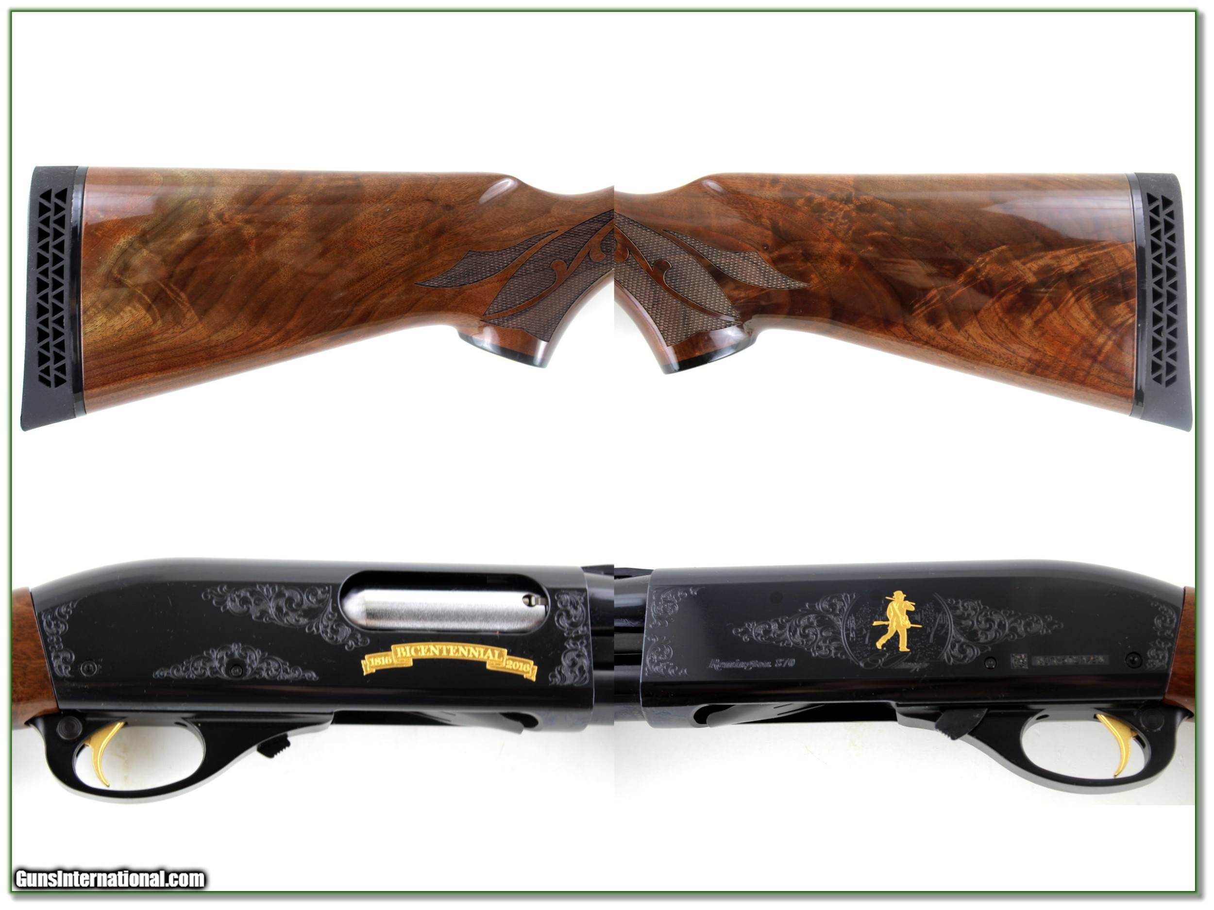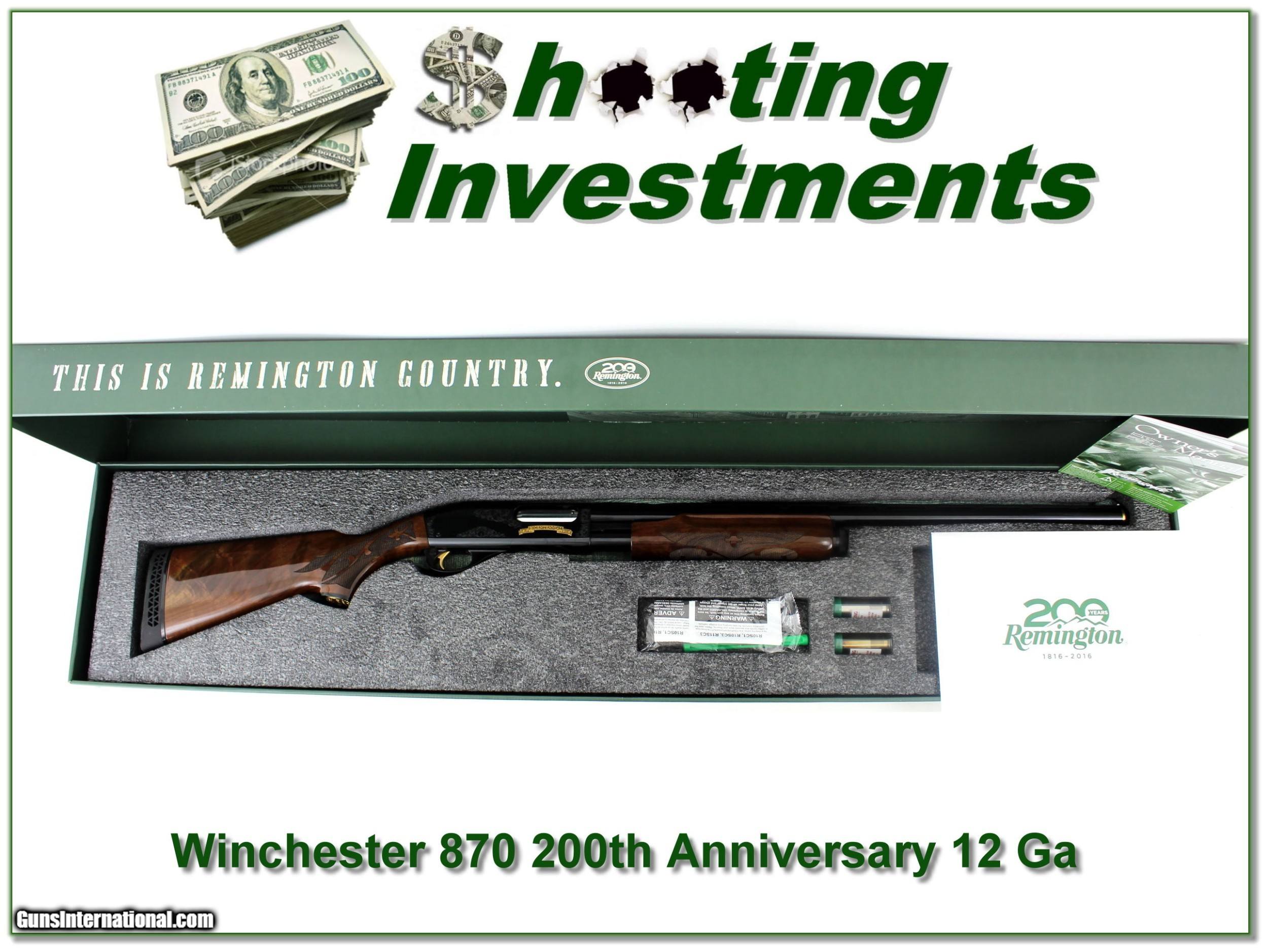 Description: This is a beautiful Remington 870 Wingmaster High Grade 200th Anniversary 12 Gauge. It comes as seen new, unfired in original box with papers and shipping box. I am selling this one on consignment and as such lay-a-way can’t be used. It does of course have the standard 3-day inspection. Shipping with insurance is $49. Please email me with any questions or larger pictures. (Consign your quality firearms with Shooting Investments for only 12%! Let me know if you have any you would like to sell!) 19-1301 Payment: Payment is by Money Order, Cashiers Check or Personal Check. I can now also accept Credit Cards (MasterCard, Visa, Discover & American Express) with a 3% convenience fee. PayPal can be used for some items but never for firearms. Shipping: The shipping charge will be listed in each description. It is $39 for most firearms. Some heavy guns or those insured for over $2000 will be higher. Shipments to Alaska and Hawaii are higher because air shipment is required. Most firearms are shipped on Tuesday and Thursday and usually in 5 days of receipt of payment. We package all shipments carefully and insure them. Optics are shipped Priority Mail and most other non-firearm shipments are shipped First Class. Returns: Our return policy is simple. If for any reason you are not pleased with your purchase, you may return your item for a full refund of purchase price. Ammunition cannot be returned. It is important to us that you are happy. Guns cannot be fired or dissembled before returning them and they must be returned in the same condition as received. Notification of a return must occur with-in 3 days of receipt at your dealer. Shipping, convenience and dealer fees are not refundable and are the responsibility of the buyer. Lay-a-way: If needed, we offer a 60 day lay-a-way option on most firearms. It is 1/3 now, 1/3 in 30 days and 1/3 in 60 days. Lay-a-way firearm sales are final and if not completed the first payment cannot be returned. Consigning your firearms with Shooting Investments: We will help you get top dollar for your firearms. While most local guns shops charge 20% or more, our fee is only 12% with a minimum of $75. At your local gun shop it might take months to sell. Selling on-line provides instant access to thousands of interested buyers. You won’t find any other on-line dealer willing to sell your firearms for only 12% or listing every gun on 3 separate s. Selling through an House typically costs the seller 15% and the buyer an addition 15% (so 30%) and you have to wait several months to sell and longer to receive funds. If properly priced, we will sell your firearms in a few weeks. Send us an email or give us a call and we’ll explain how easy it is for you to get top dollar. Trading: Trading for use is really just buying your gun to re-sell. If you have a gun you want to trade, please email a picture and we will let you know what we can give or it. You will always get more if we sell it for you on consignment. Help for California Buyers: We are happy to ship to California. It is the buyer’s responsibility to make sure any item you buy is legal in your state. We are also happy to help with your purchase of a firearm from someone other than us. If you see a gun you would like to buy but the seller can’t or won’t ship to California they can ship to use and we’ll then ship it to your California dealer. The cost for this service is only $30 + shipping. Let us know if we can help! SOLD |