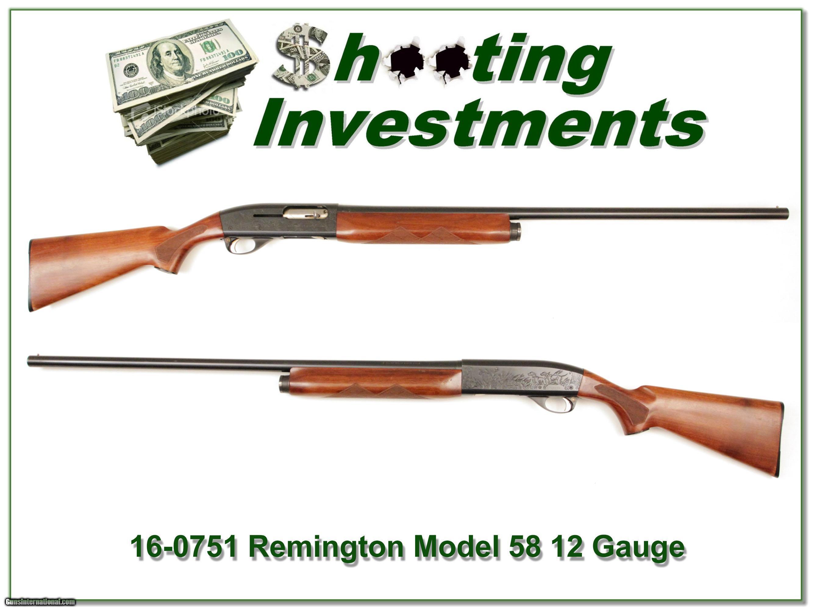 Description: This is a nice example of a Remington Model 58. It is a 12 Gauge with some minor use marks on the wood. The metal is very nice. It has a 30in full barrel. I am selling this one on consignment and as such, lay-a-way can’t be used. It does of course have the standard 3 day inspection. Shipping and insurance is $35 or $15 more if you want it shipped in a new Plano hard case. Please email me with any questions or larger pictures. (I now consign quality firearms only 10%! Let me know if you have any you would like to sell!) [16-0751] Payment: Payment is by Money Order, Cashiers Check or Personal Check. I can now also accept MasterCard and Visa with a 3% convenience fee. PayPal can be used for some items but never firearms. Please let us know if you would like to pay via PayPal. Shipping: The shipping charge will be listed in each description. It is $35 for most guns. Some heavy guns or those insured for over $2000 will be higher. Shipments to Alaska and Hawaii are higher because air shipment is required. Most firearms are shipped within 5 days of receipt of payment. We prefer shipping at the beginning of the week to avoid firearms in transit over weekends. We package all shipments carefully and insure them for the full purchase price, rounded up to the next $100. In the unlikely event that damage occurs, it is important that you save all packaging material for the claims process. Optics are shipped Priority Mail and most other non-firearm shipments are shipped First Class. Returns: Our return policy is simple. If for any reason you are not pleased with your purchase, you may return your item for a refund. The only exception is ammunition, it cannot be returned. It is important to us that you are happy. Guns cannot be fired or dissembled before returning them and must be returned in the same condition as received. Notification of a return must occur with-in 3 days of receipt at your dealer. Shipping, convenience and dealer fees are not refundable and are the responsibility of the buyer. Lay-a-way: If needed, we offer a 60 day lay-a-way option on most firearms. It is 1/3 now, 1/3 in 30 days and 1/3 in 60 days. Lay-a-way firearm sales are final. Consigning your firearms with Shooting Investments: We will help you get top dollar for your firearms. While most local guns shops charge 20% or more, our fee is only 10% with a minimum of $50. At your local gun shop it might take months to sell. Selling on-line provides instant access to thousands of interested buyers. You won’t find any other on-line dealer willing to sell your firearms for only 10% or listing every gun on 4 separate s. Selling through an House typically costs the seller 15% and the buyer an addition 15% (so 30%) and you have to wait several months to sell and longer to receive funds. If properly priced, we will sell your firearms in a week or two. Send us an email or give us a call and we’ll explain how easy it is for you to get top dollar. Trading: We collect guns and usually just trade for guns we want to add to our collections. We often sell guns for others wanting to purchase one of ours. We find this the most fair to both of us. Our Commission is only 10% and we hold the gun you want until yours sells. Please contact us if you want to sell one of yours to buy one of ours. Help for California Buyers: We are happy to ship to California. It is the buyer’s responsibility to make sure any item you buy is legal in your state. We are also happy to help with your purchase of a firearm from someone other than us. If you see a gun you would like to buy but the seller can’t or won’t ship to California we can help. You buy the gun and have it shipped to us. We’ll then ship it to your California dealer. The cost for this service is only $30 + shipping. Let me know if we can help! SOLD |