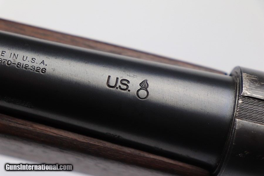 Description: This is an excellent example of a US Military issued Remington Model 11 riot shotgun. The military finish rates at about 95% with minor muzzle wear and a little bit of finish loss on the high edges of the receiver. There is also a small area of patina/wear on the right side of the barrel that seems slightly touched up with cold blue. This example has a crisp duck scene on each side, with 'U.S.' and flaming bomb proofs present on receiver and barrel. The stock is marked with crossed cannons cartouche. Barrel is marked 'cyl' and REP in oval. Stock is in fantastic shape. Minty bore, just needs a quick cleaning. SOLD Curio/Relic: Yes |