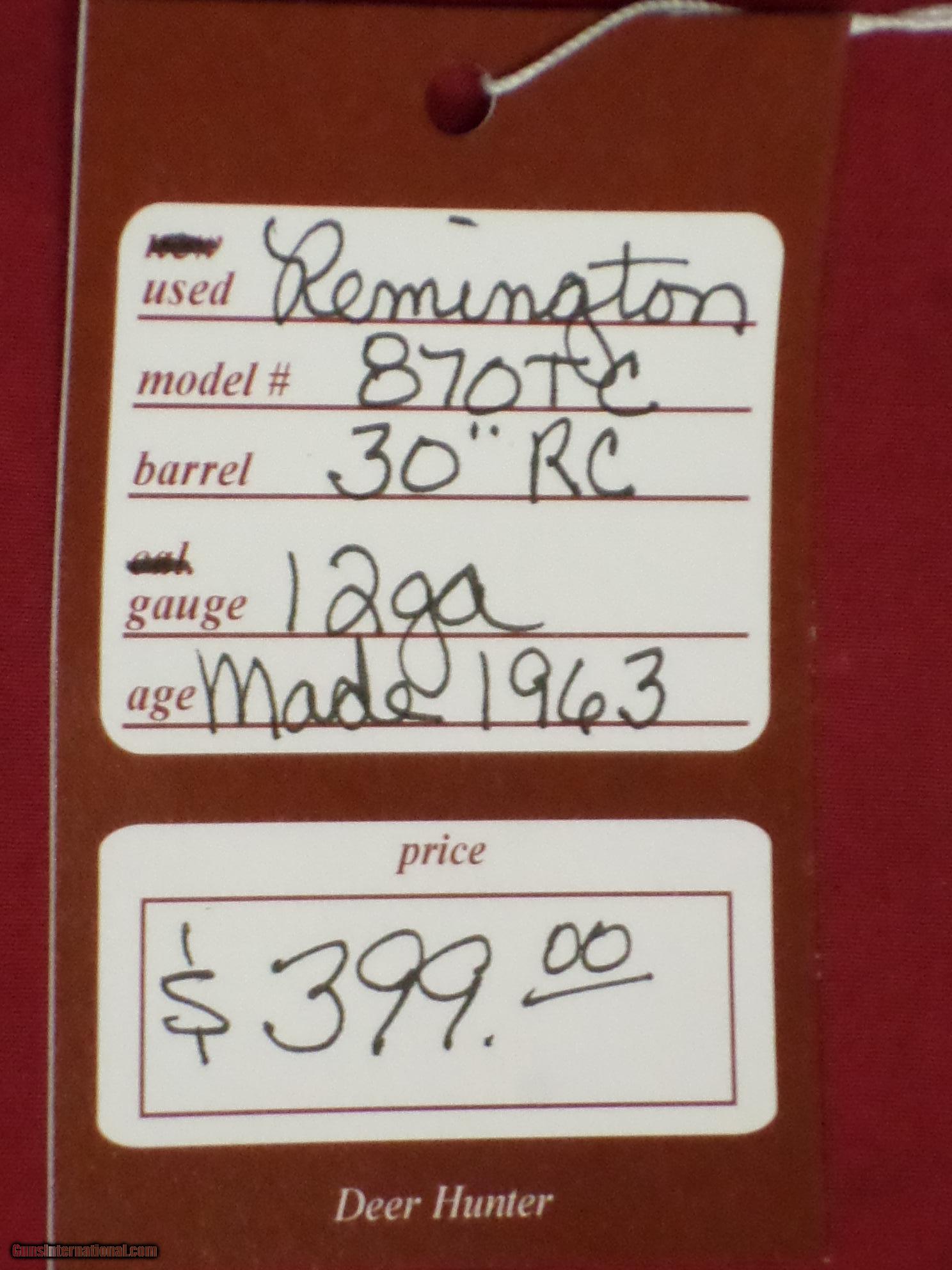 Description: SOLD For sale, Remington 870 TC 12 Ga. 30" Rem Choke bbl. Very good condition, still tight lockup. Circa 1963 To see more of our inventory, visit deerhunterguns,com We accept MC, Visa and Discover, no AmEx. No Sales to California. Like us on Facebook: Deer Hunter Guns SOLD |