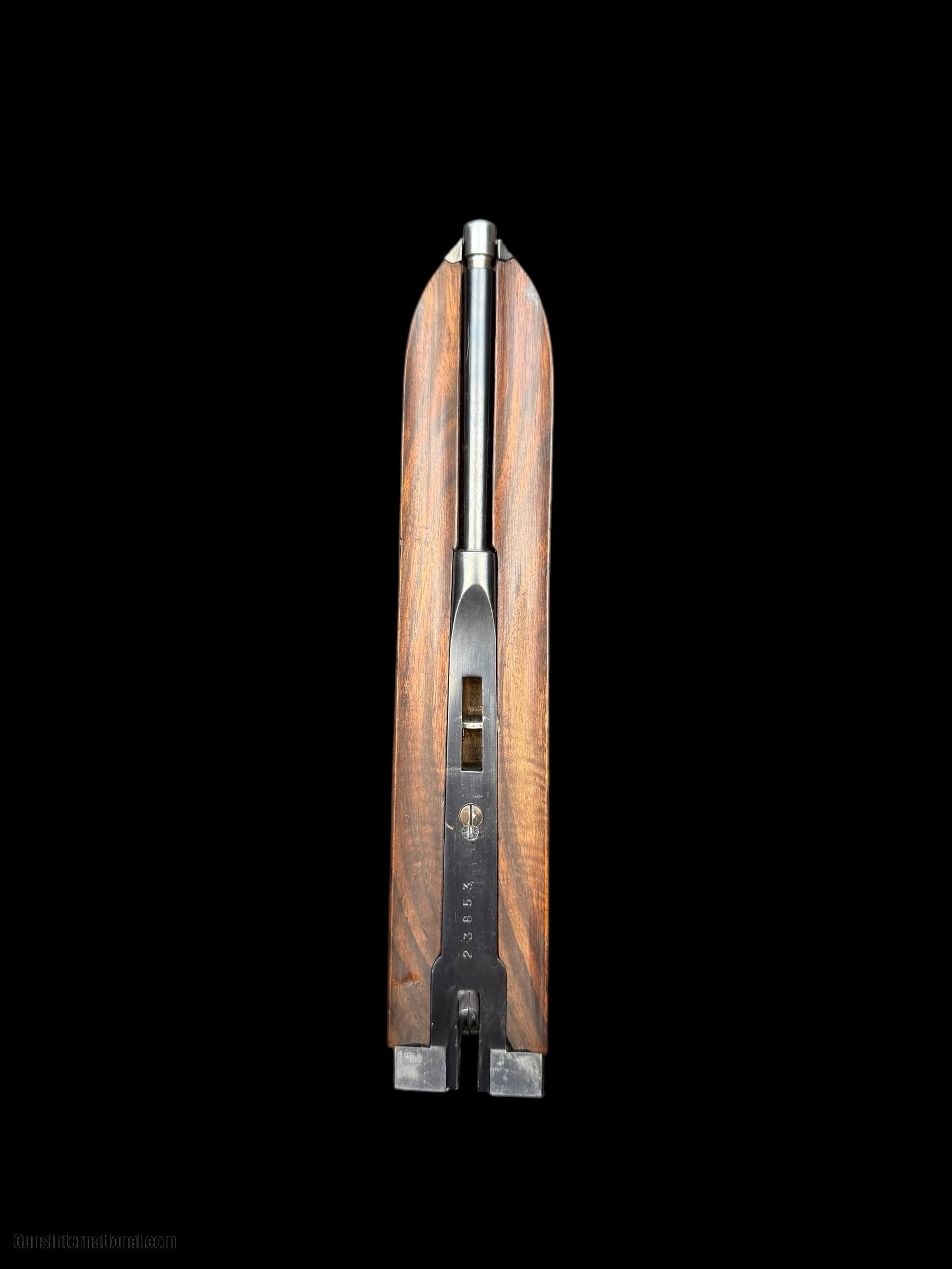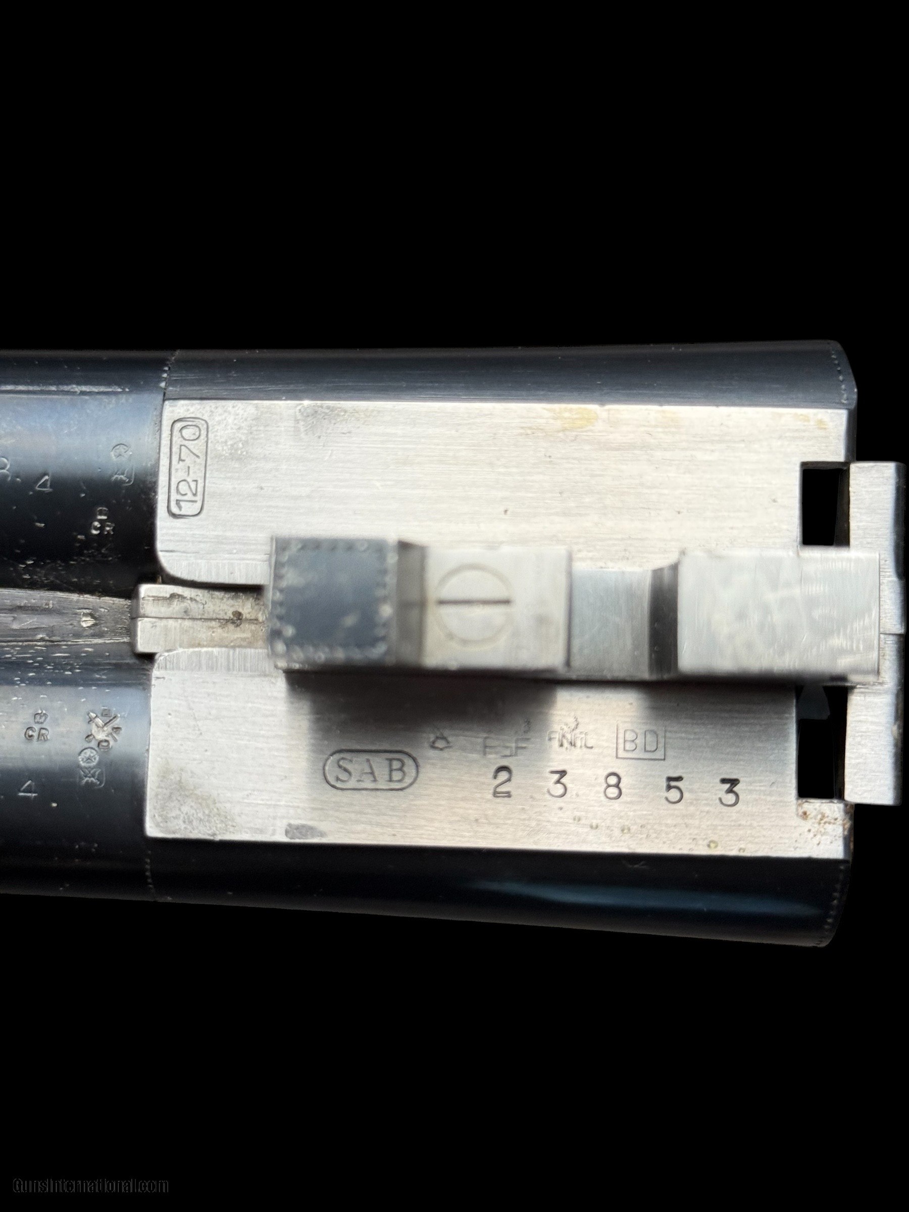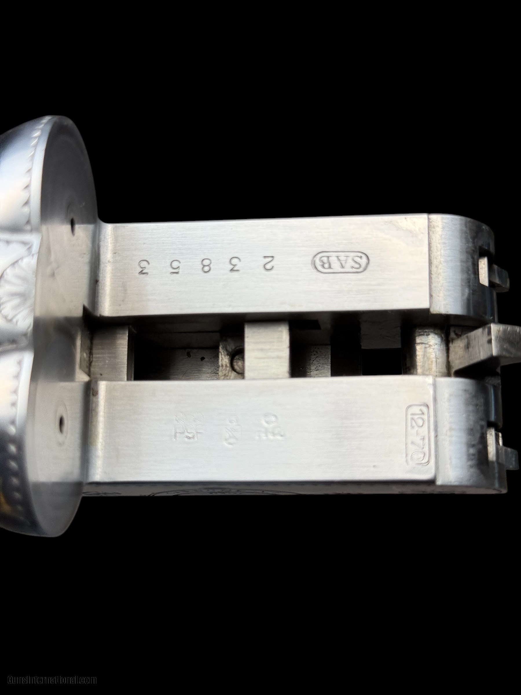 Description: RENATO GAMBA - ITALY MODEL: 624 SxS GAME GUN MFG: 1994 SCALLOPED COIN FINISH BOXLOCK ACTION - LIGHT SCROLL ENGRAVED W/ "RENATO GAMBA" IN BANNERS IN ACTION SIDES - DOUBLE UNDERLUG MONOBLOCK BARRELS W/ HAND FILED RIB PIERCED TOP LEVER W/ DOG PROFILE LONG BOTTOM TRIGGERGUARD 28: BBLS - 2 3/4" CHAMBERS / 70MM CHOKES: .010 / .015 TEAGUE THIN WALL CHOKES SINGLE TRIGGER NON-AUTO SAFETY TURKISH WALNUT STOCK W/ POINT PATTERN CHECKERING AND DOUBLE MULLERED EDGE - BLACK RUBBER PAD DIMS: LOP: 14 3/4" | DAC: 1 9/16" | DAH: 2 1/8" WEIGHT: 7LBS 1 OZ CONDITION: GUN IS IN BEAUTIFUL OVERALL CONDITION SHOWING LITTLE AND LIGHT FIELD USE. ACTION TIGHT. BORES CLEAR. EJECTORS STRONG AND IN-TIME. TRIGGER CRISP. WOOD FINISH EXCELLENT W/ SCANT AND LIGHT IMPRESSIONS. BLUE EXCELLENT. GENTLEMEN, THIS IS A GEAUTIFUL GAME GUN FROM GAMBA. EASY POINTING AND A PLEASURE TO HOLD. GAMBA RANKS AMONG THE BETTER ITALIAN MAKERS LIKE BERETTA, RIZZINI, FAUSTI, AND OTHERS. YOU WILL BE PLEASED WITH THIS GUN! PLEASE CALL NOW! FFL REQUIRED FKAT $50 S/H/I CARD FEE APPLIES SOLD Shotgun Gauge: 12 Gauge Manufacturer: RENATO GAMBA Model: 624 SXS Serial Number: 23853 Barrel Length: 28 Chambers: 2.75 OR 70MM Ejectors: YES Condition: EXC Metal Condition: EXC Wood Condition: EXC Bore Condition: EXC Action: BLE Triggers: SINGLE Proof:Nitro: YES |