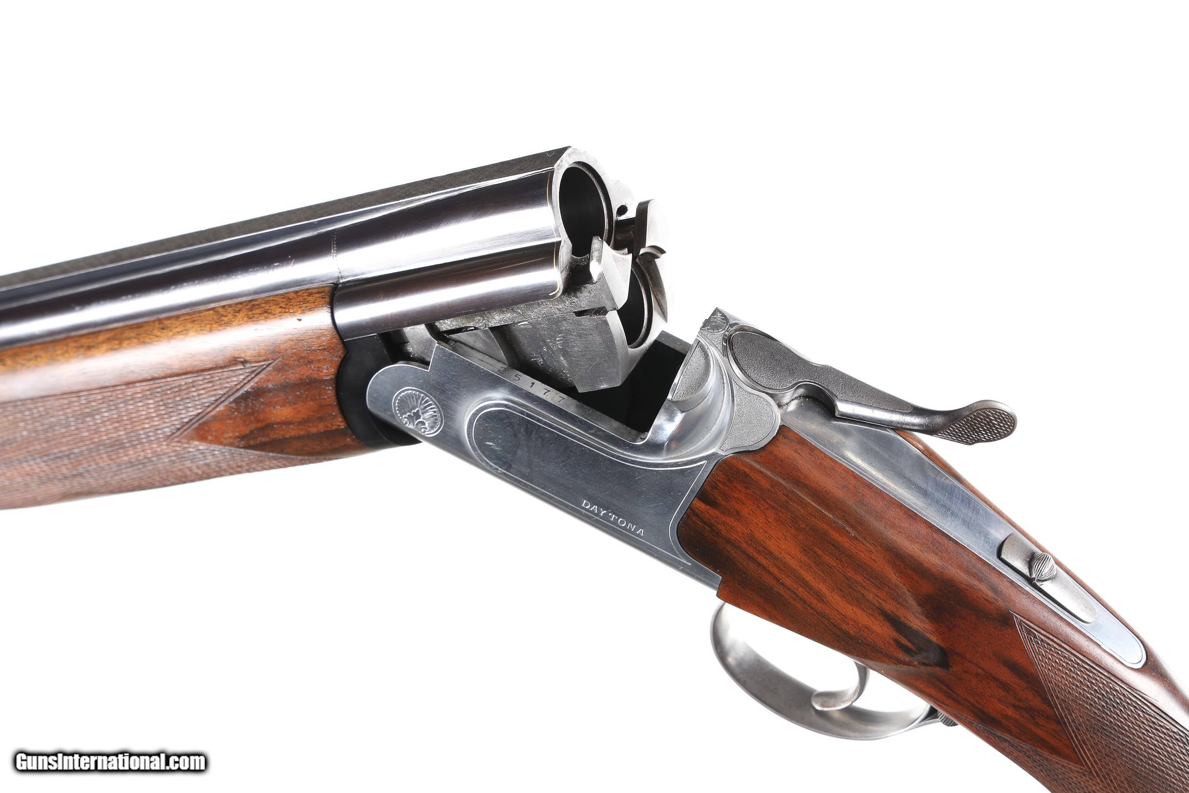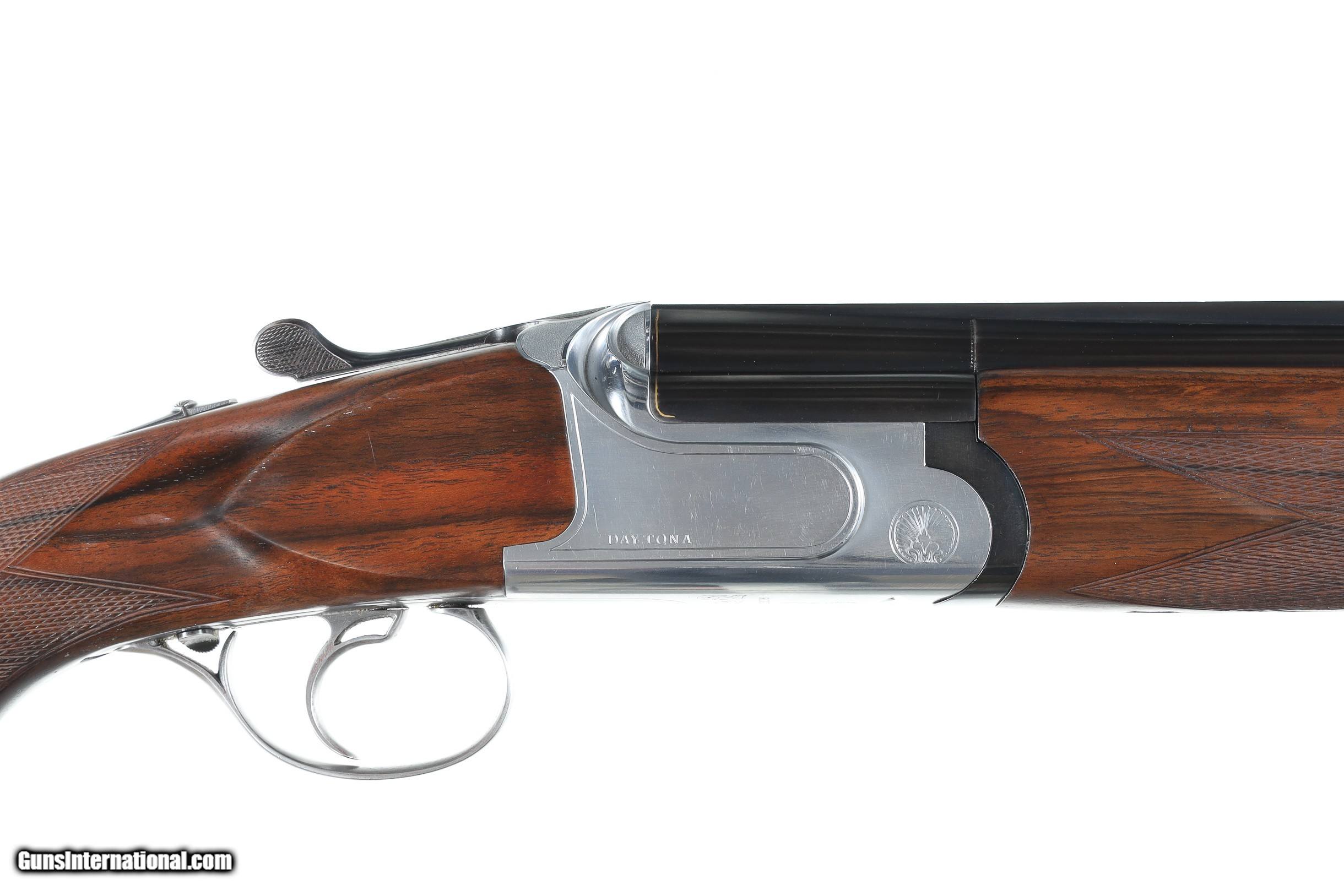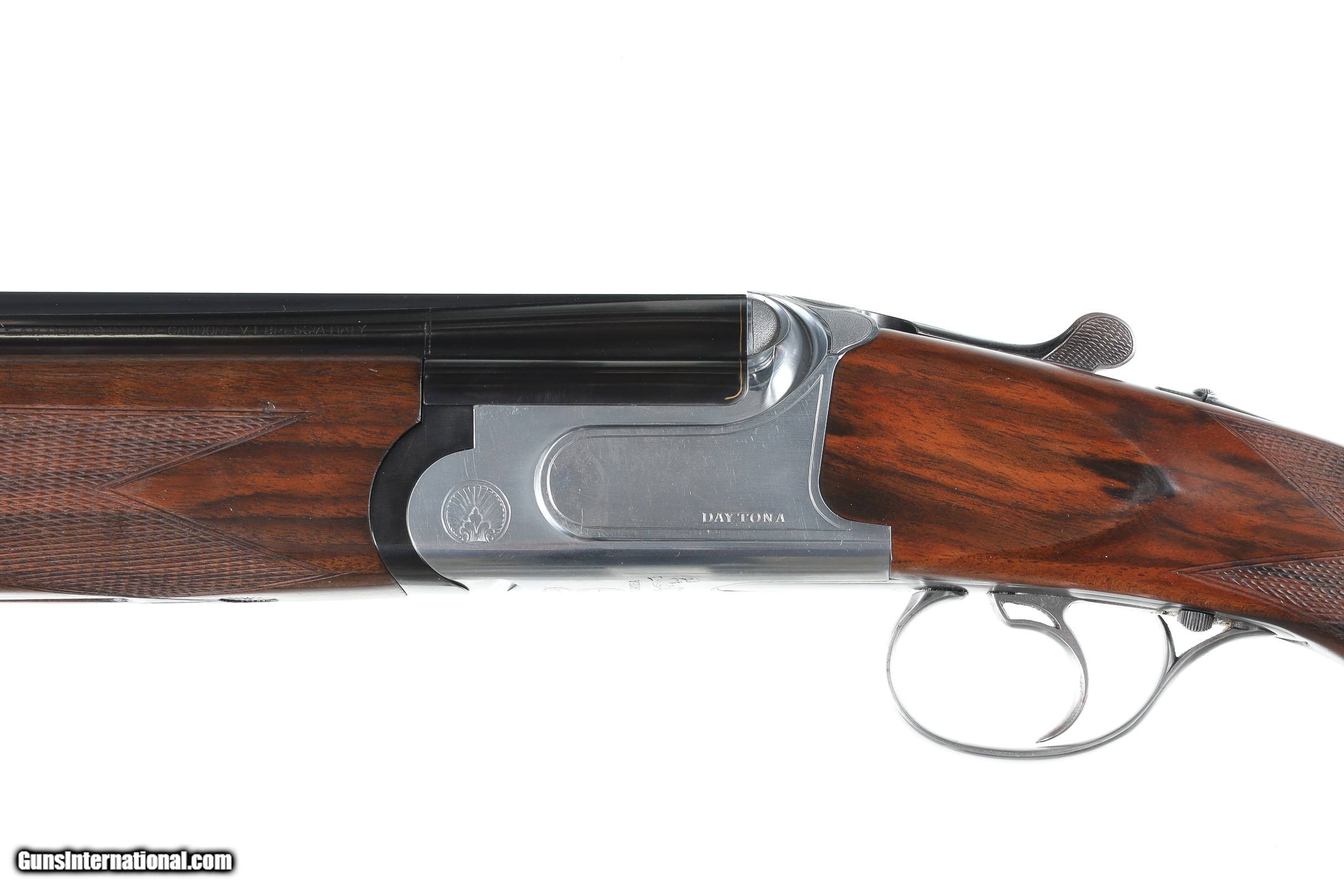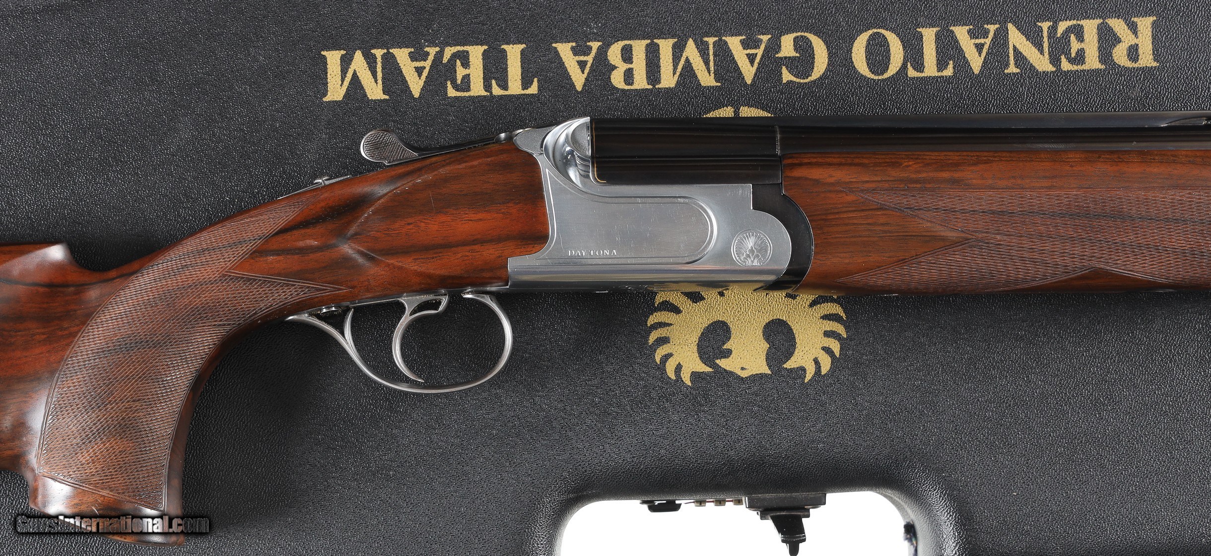 Description: Renato Gamba Daytona over under 12ga Drop Lock with single selective trigger and ejectors. Blue finished bbl's with a full compliment of 8 Teaque chokes and wrench. Varnished, checkered, highly figured, walnut, pistol grip stock with palm swell. Comes in factory travel case with instructions and spare butt pad. Condition: Very fine as used with bright bores and retains over 98% blue on bbl's. Mechanically excellent, action operates smoothly, lever remains to the right of center. Stocks are very fine with some handling marks and impressions. LOP 14-1/2", DAC 1-1/2", DAH 1-7/8". 8 lbs 7 oz • Free Shipping, No Credit Card Fees. • Lay-a-way available for this firearm. • 1/3 Down, a 1/3 in 30 Days, 1/3 in 60 Days. SOLD Manufacturer: Gamba Model: Daytona Serial Number: 25177 Barrel Length: 31 |