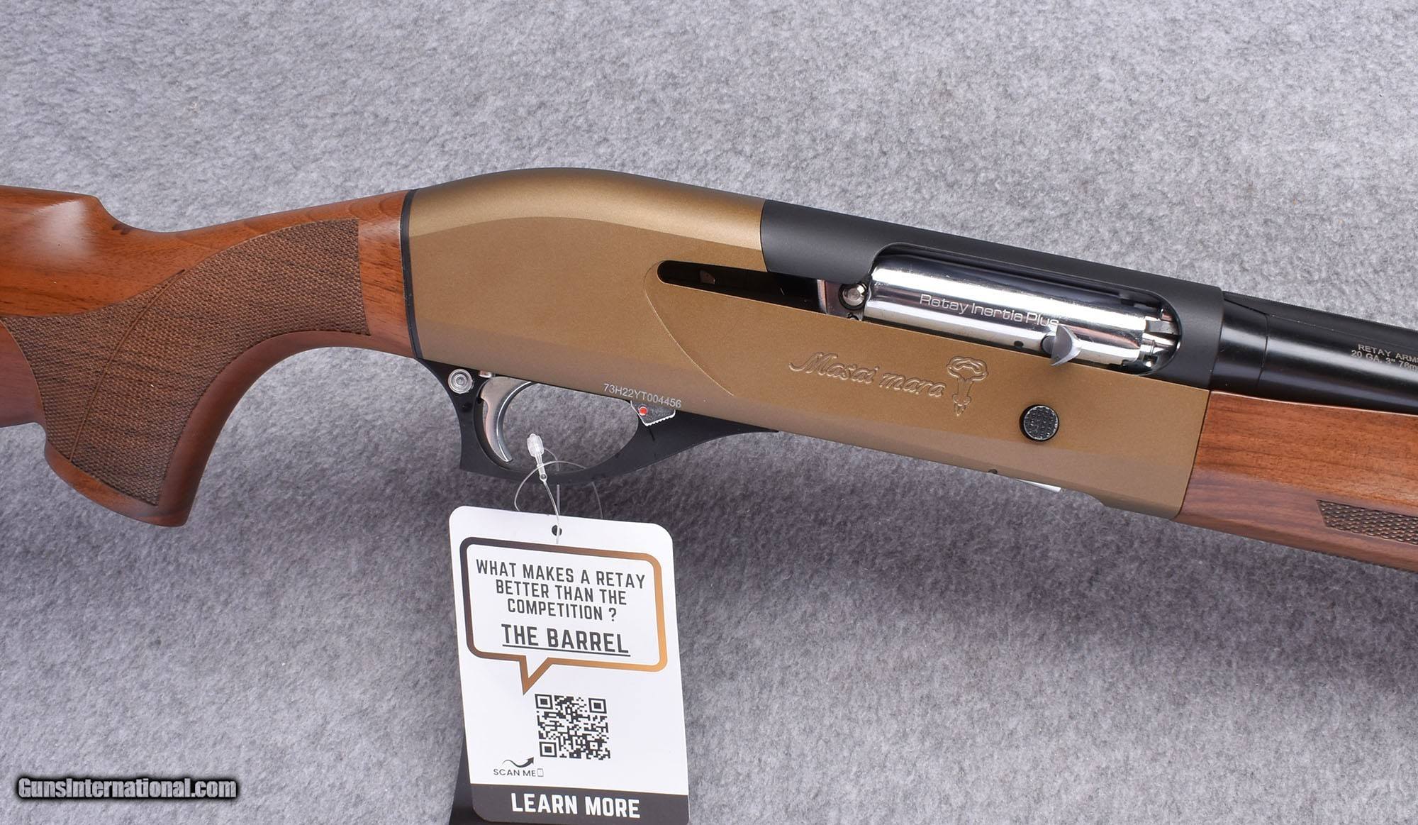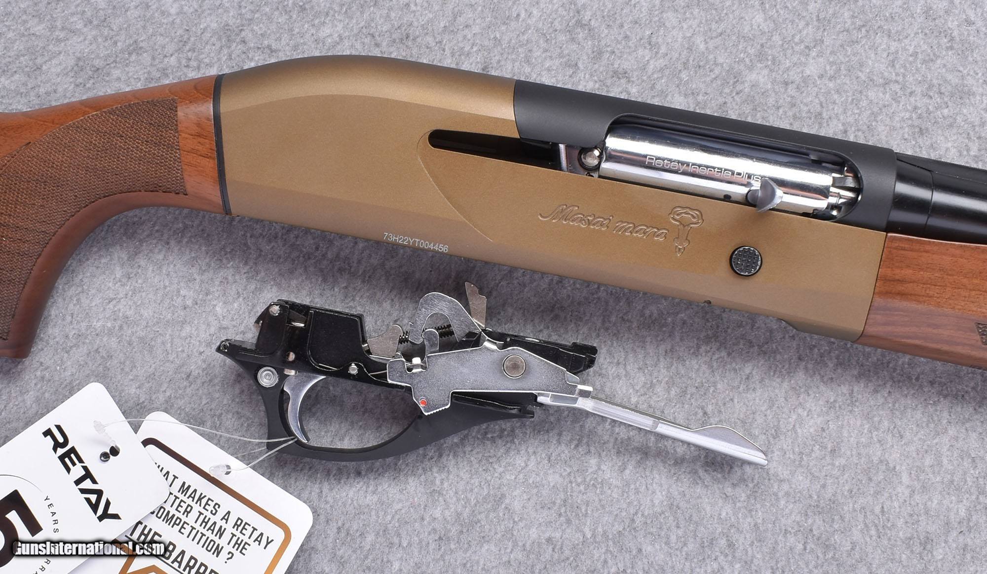 Description: Retay Masai Mara semi-auto shotgun features Retay's Straight Line Inertia Transfer System paired with the Inertia Plus bolt/rollover Torsion Spring Action to insure reliability. Alloy lower receiver, Monoblock milled Bohler steel upper. Grade 2 walnut stock with adjustable fit plate and shim system. Trigger assembly easily removed with the press of a button. New in Factory Box, Dove Season Special Pricing. SOLD Shotgun Gauge: 20 Gauge Manufacturer: Retay Arms Model: Masai Mara Bronze Metal Condition: Blued barrel, Bronze Cerakote receiver Wood Condition: Grade 2 Oiled Walnut Bore Condition: New LOP: 14 1/4 Weight: 7 lbs. 1 oz.. Sights: Vent Rib, Red Fiber Front |