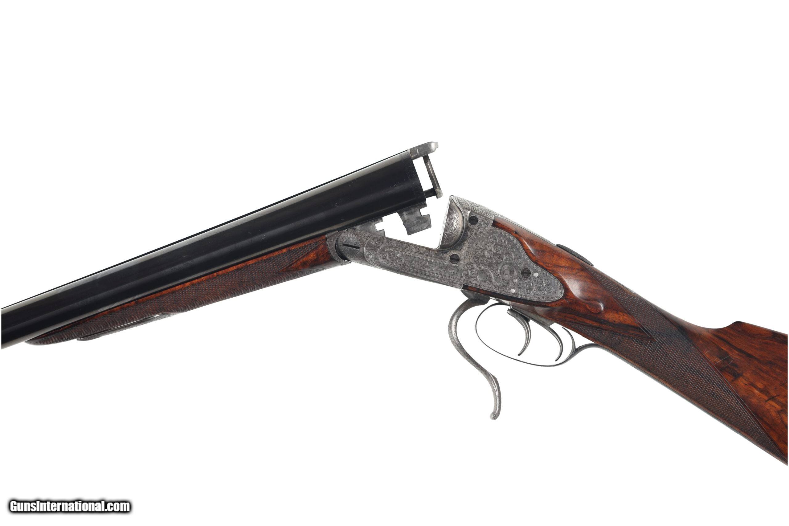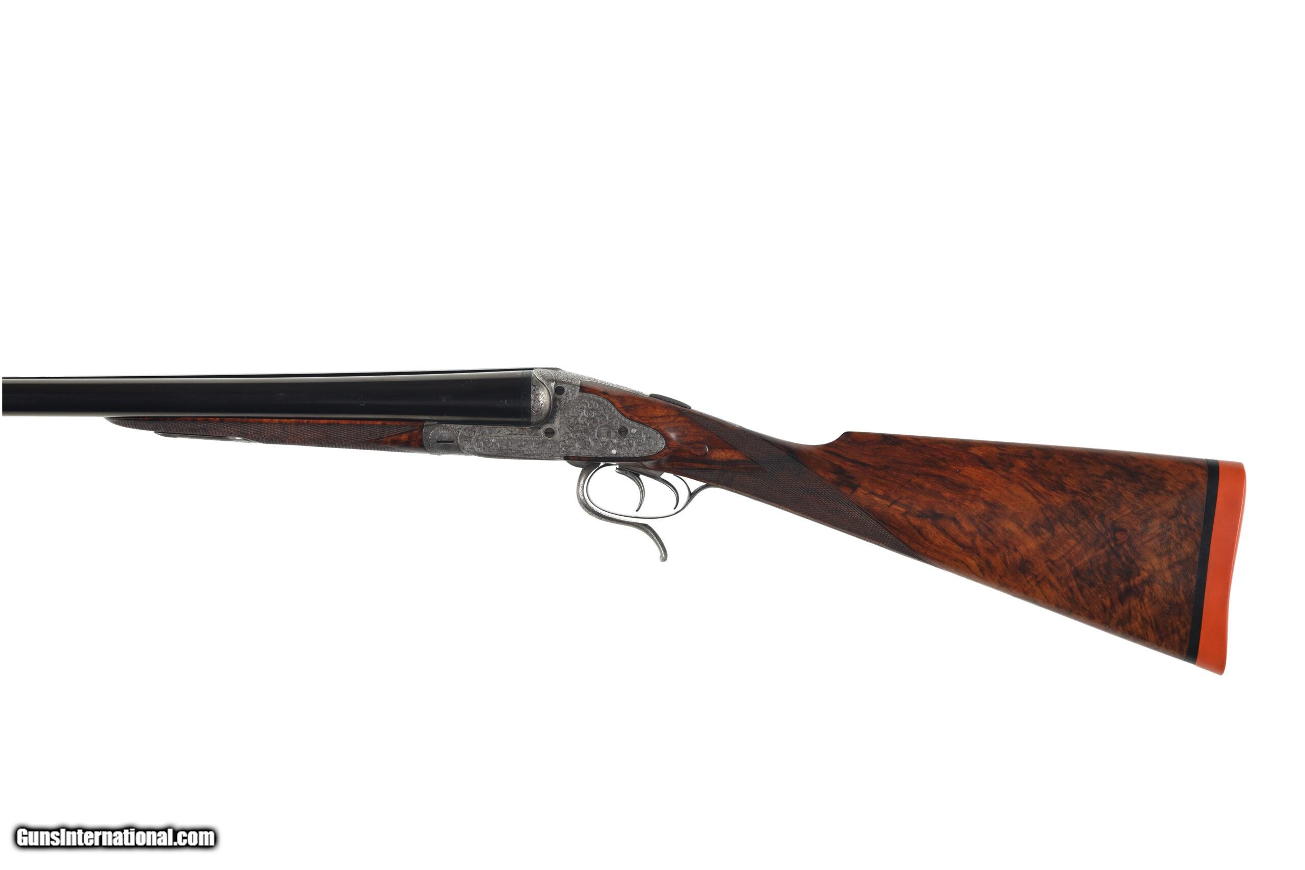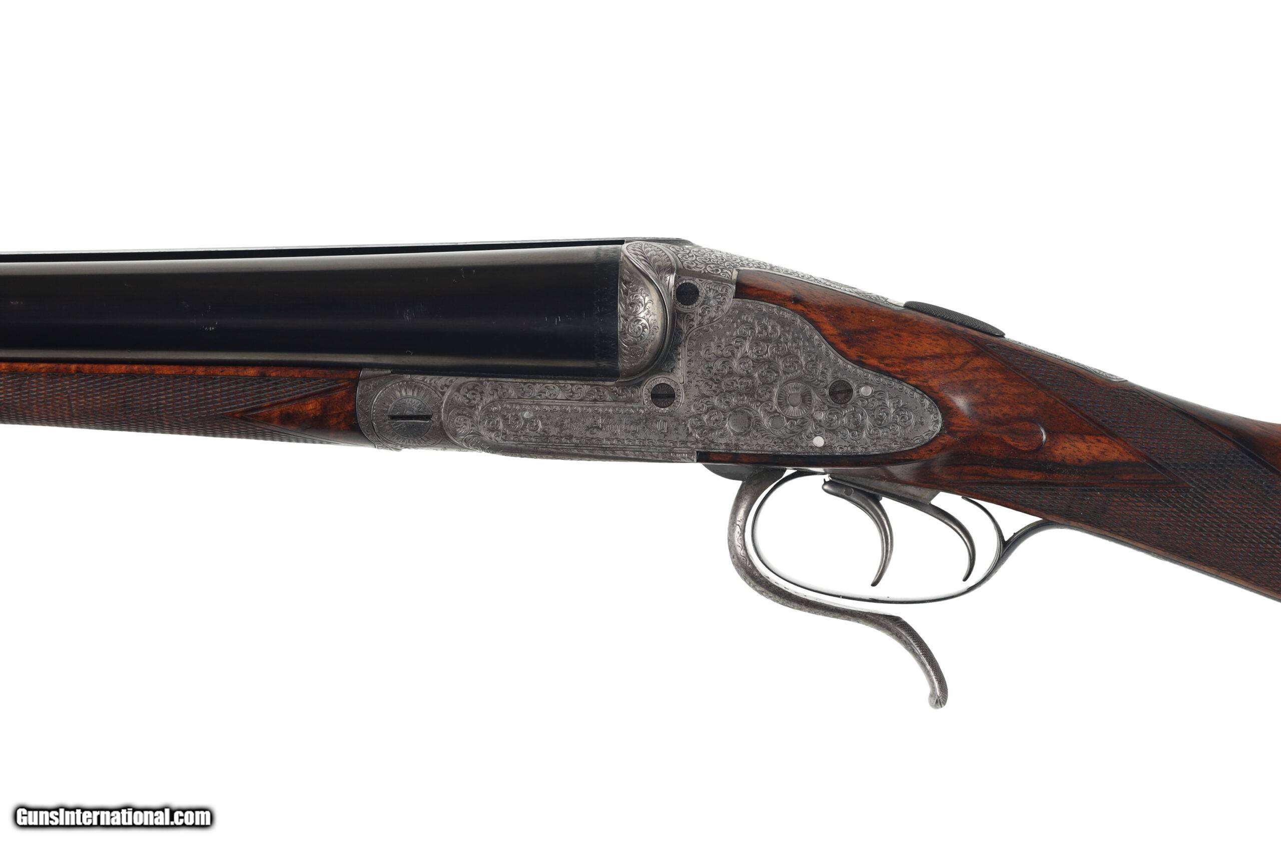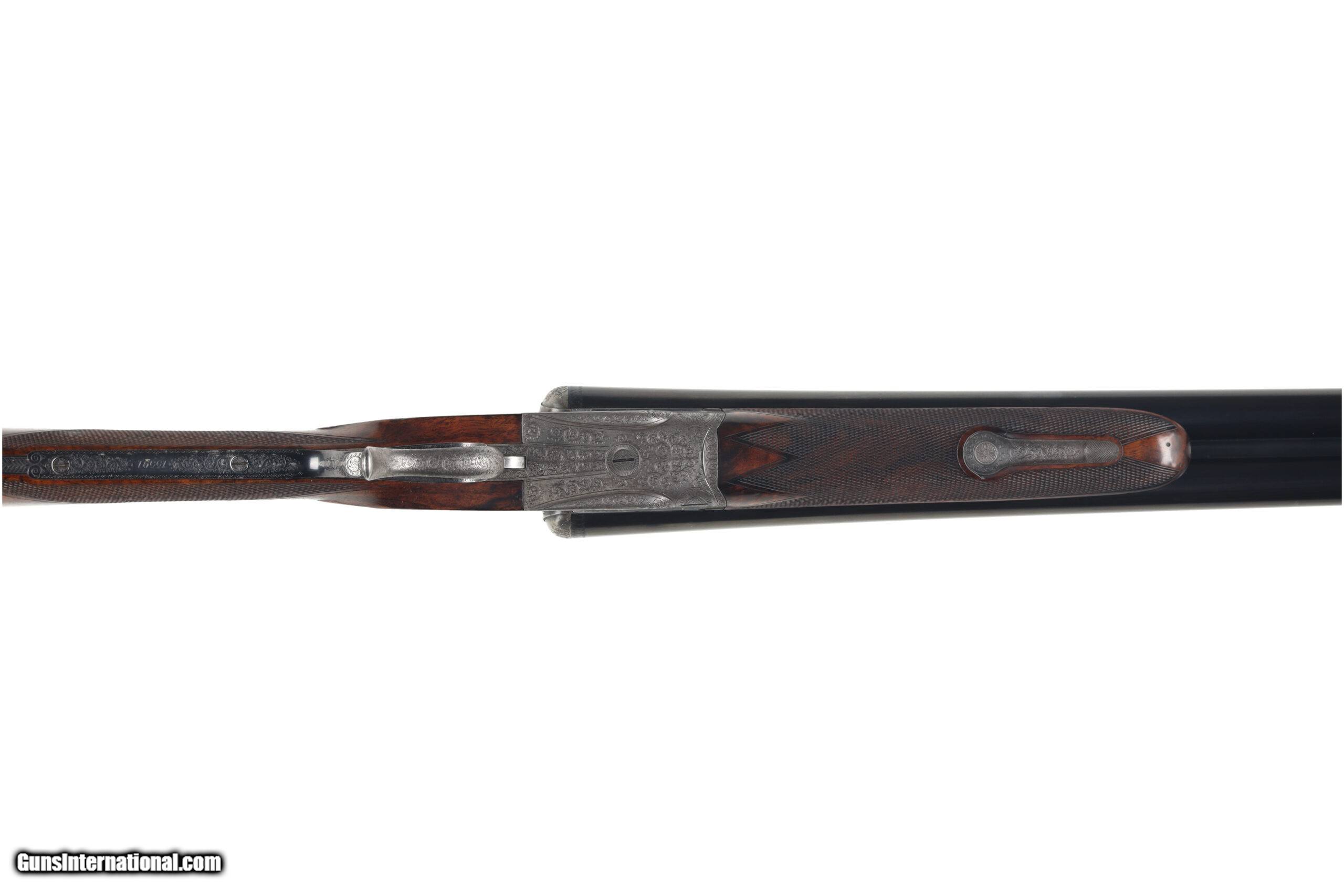 Description: The Rigby Rising Bite action has long been renowned for its strength and excellence in design, having been used in both shotguns and their exceptional double rifles. This shotgun is made even more interesting by the fact that it is not only of the rising bite design, but also made with the so called "Snap Action" underlever, which both unlocks the breech and resets the hammer's with the same movement to save effort on opening the barrels. This example of a somewhat earlier Rising Bite, made in the 1880's before the adoption of nitro powder, is in excellent overall condition, being very well taken care of. The stocks are of an exceptional grade of walnut and show only slight wear from over a century of use and a faint crack forming behind the left lock. The barrels still shine brightly and have only a few faint scratches and nicks to show their age. Though the chokes measure to be quite open, it is reamed for Jug style chokes, making it pattern quite well. it must be noted again that this shotgun was made before the adoption of nitro powders and has not been re proofed for nitro. Manufactured in: England Hand: Right Hand Action Finish: Engraved Metal Finish: Original Barrel Length: 30" Barrel Condition: Very Good Stock Finish: Original Stock Condition: Very Good Type of Butt: Silvers Pad Pad Thickness: 1" Grip: Straight Grip Forend: Checkered Splinter Cast Amount: 1/8" SOLD Manufacturer: Rigby Model: Rising Bite Chambers: 3 Ejectors: Extractors Condition: Preowned Metal Condition: Very Good Action: Side by Side Triggers: Front Articulated Double Gauge Info: 10 Gauge Stock Comb: 1 9/16 Stock Heel: 2 1/4 Stock Cast: Off Fore End: Checkered Splinter Butt Pad: 1 LOP: 13 7/8 Rib: Game Finish: Original Weight: 8 lbs Chokes: Skeet Choke Case: NONE |