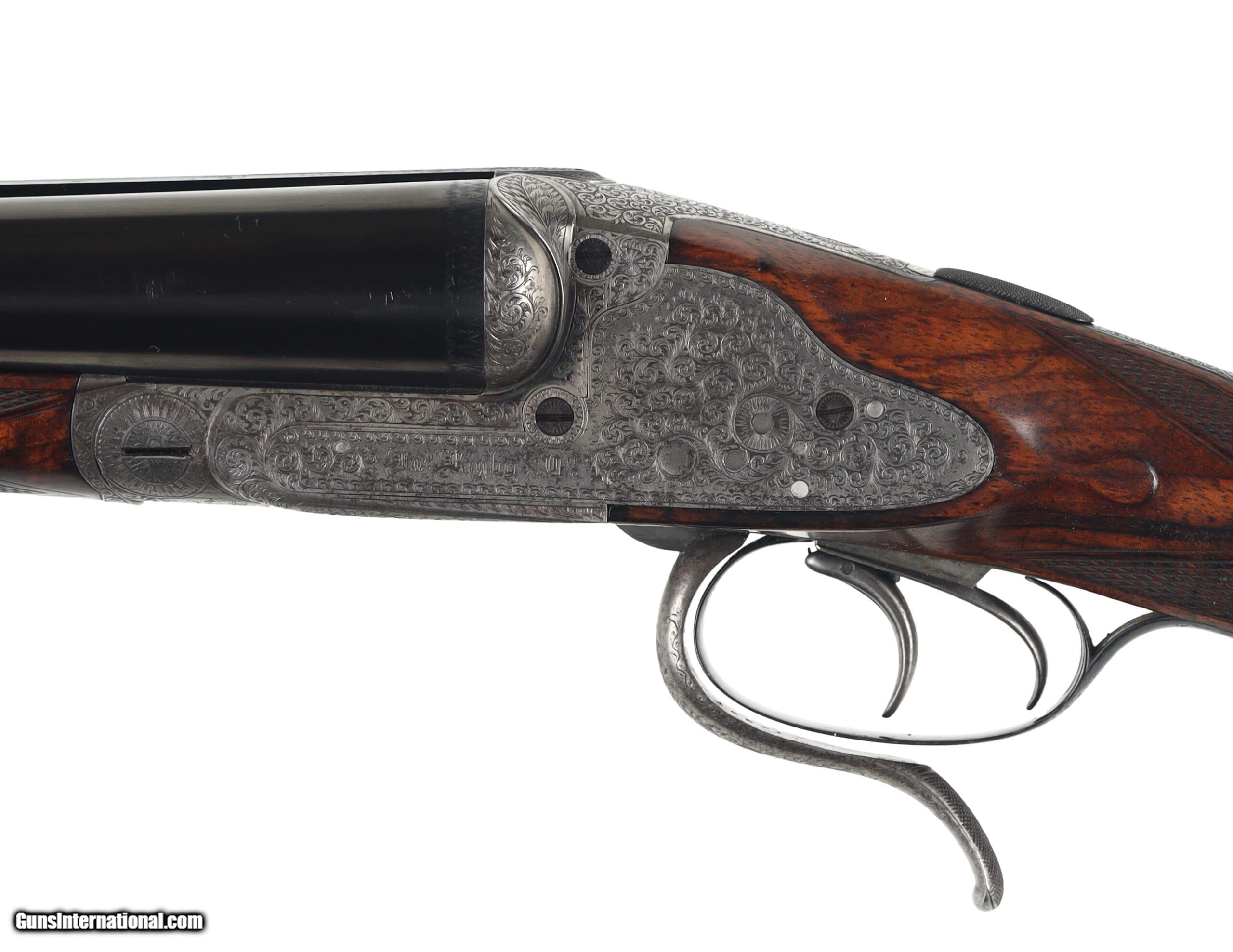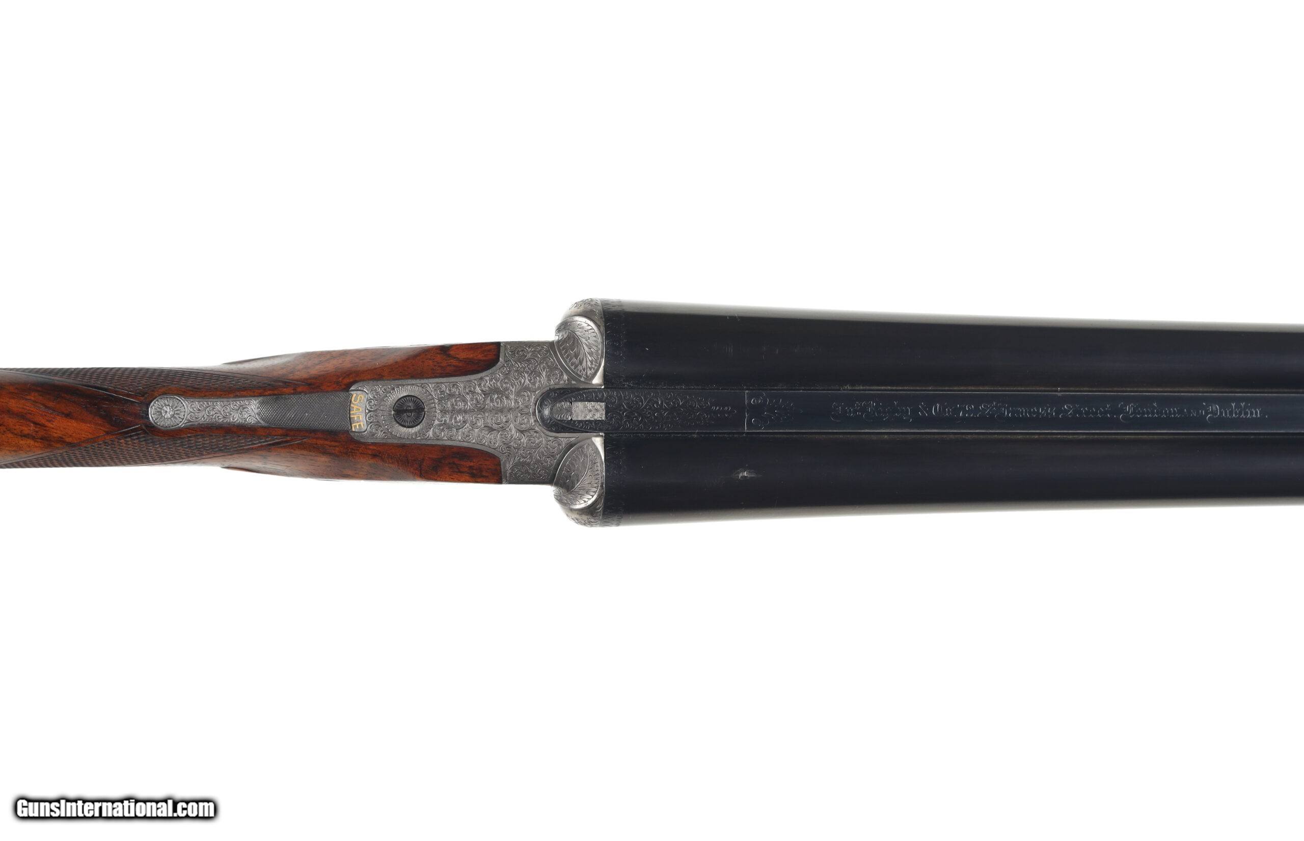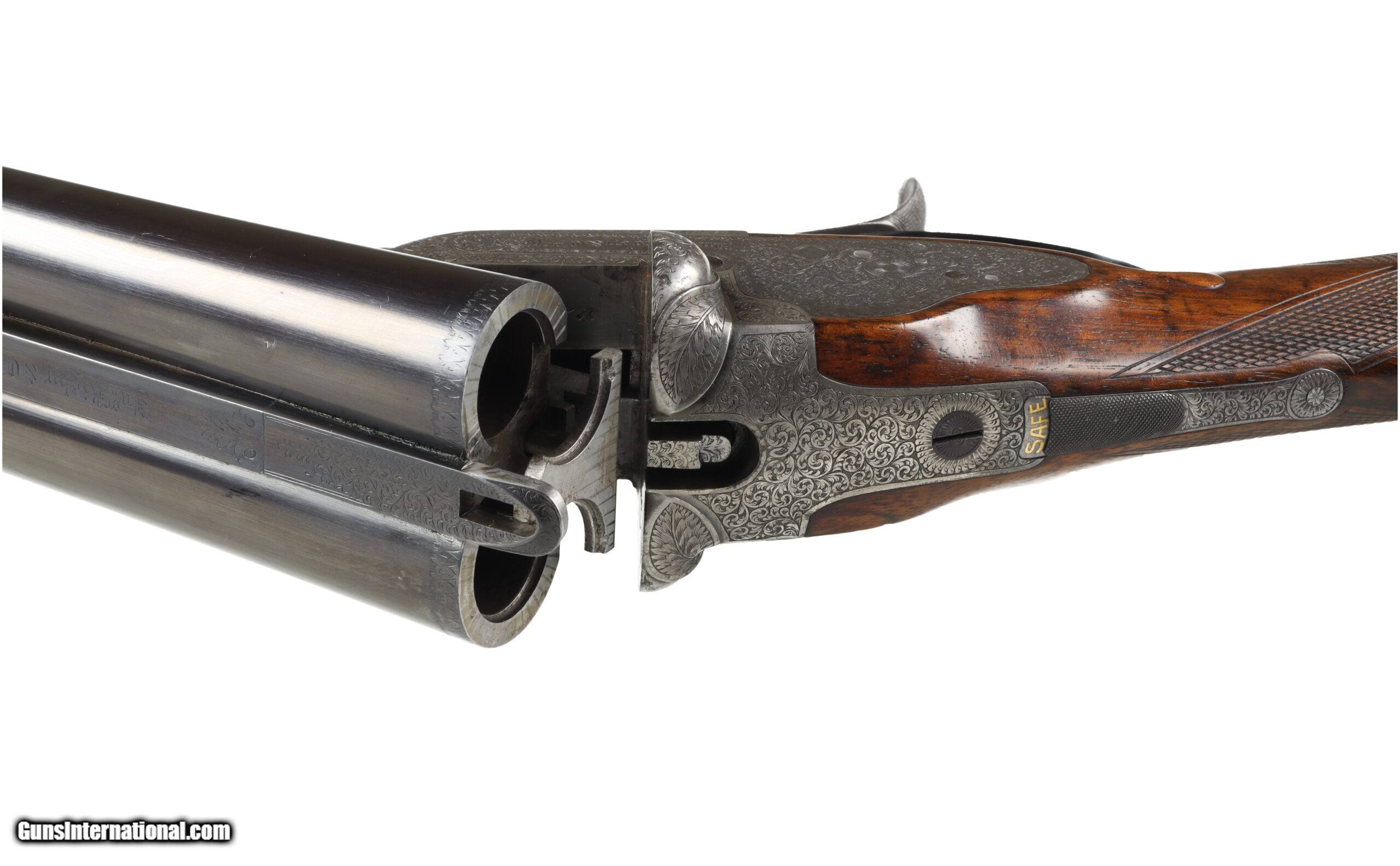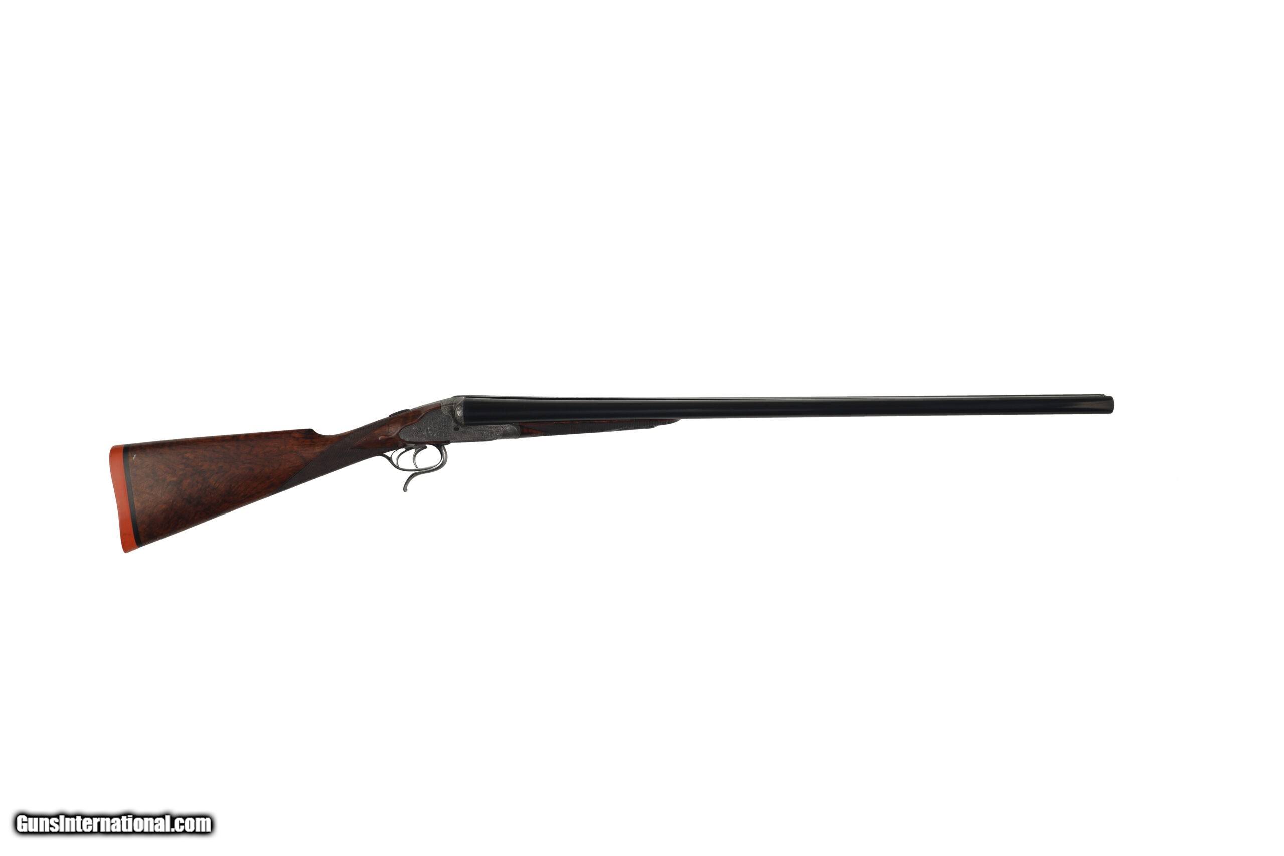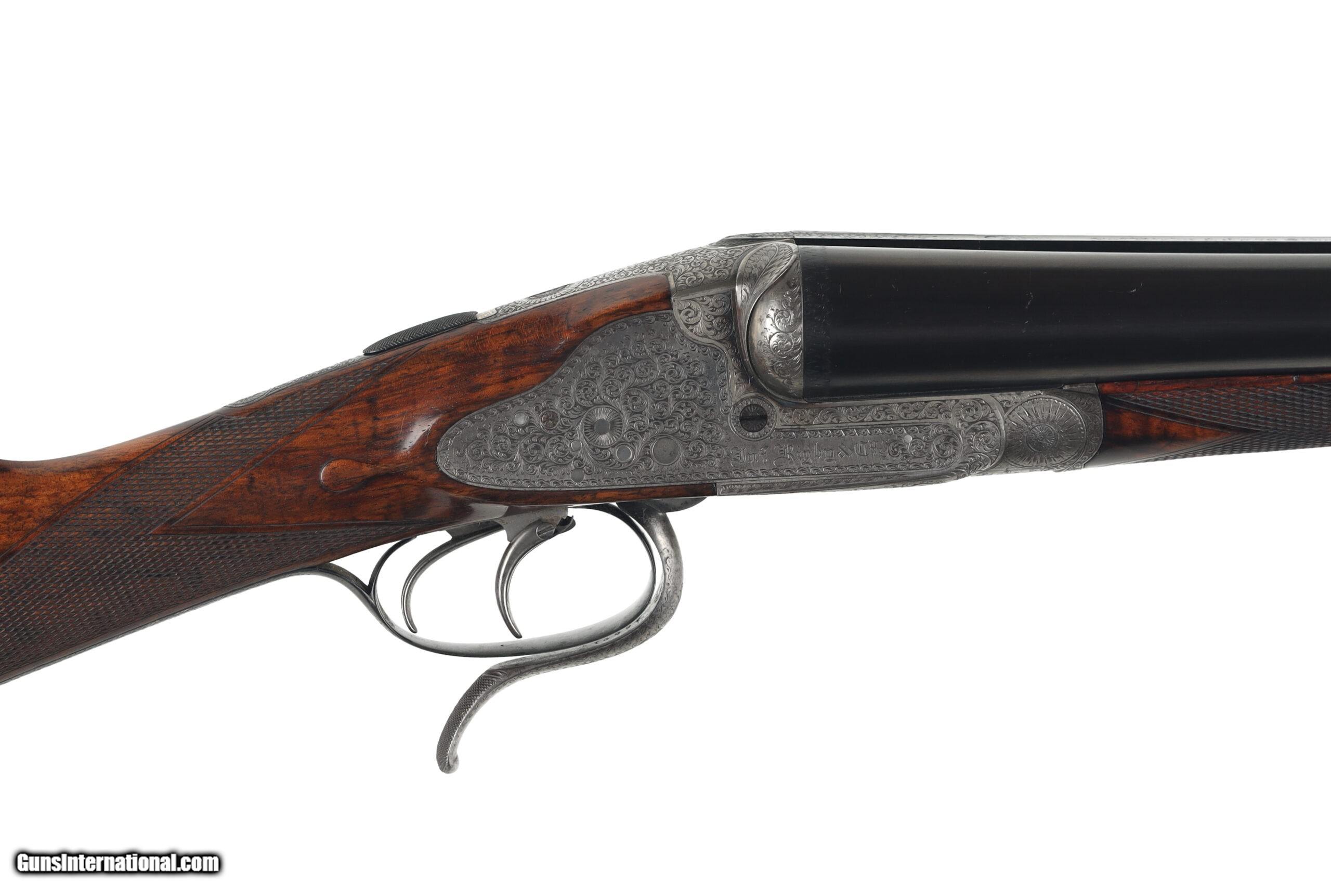 Description: The Rigby Rising Bite action has long been renowned for its strength and excellence in design, having been used in both shotguns and their exceptional double rifles. This shotgun is made even more interesting by the fact that it is not only of the rising bite design, but also made with the so called "Snap Action" underlever, which both unlocks the breech and resets the hammer's with the same movement to save effort on opening the barrels. This example of a somewhat earlier Rising Bite, made in the 1880's before the adoption of nitro powder, is in excellent overall condition, being very well taken care of. The stocks are of an exceptional grade of walnut and show only slight wear from over a century of use and a faint crack forming behind the left lock. The barrels still shine brightly and have only a few faint scratches and nicks to show their age. Though the chokes measure to be quite open, it is reamed for Jug style chokes, making it pattern quite well. it must be noted again that this shotgun was made before the adoption of nitro powders and has not been re proofed for nitro. Manufactured in: England Hand: Right Hand Action Finish: Engraved Metal Finish: Original Barrel Length: 30" Barrel Condition: Very Good Stock Finish: Original Stock Condition: Very Good Type of Butt: Silvers Pad Pad Thickness: 1" Grip: Straight Grip Forend: Checkered Splinter Cast Amount: 1/8" SOLD Manufacturer: Rigby Model: Rising Bite Chambers: 3 Ejectors: Extractors Condition: Preowned Metal Condition: Very Good Action: Side by Side Triggers: Front Articulated Double Gauge Info: 10 Gauge Stock Comb: 1 9/16 Stock Heel: 2 1/4 Stock Cast: Off Fore End: Checkered Splinter Butt Pad: 1 LOP: 13 7/8 Rib: Game Finish: Original Weight: 8 lbs Chokes: Skeet Choke Case: NONE |