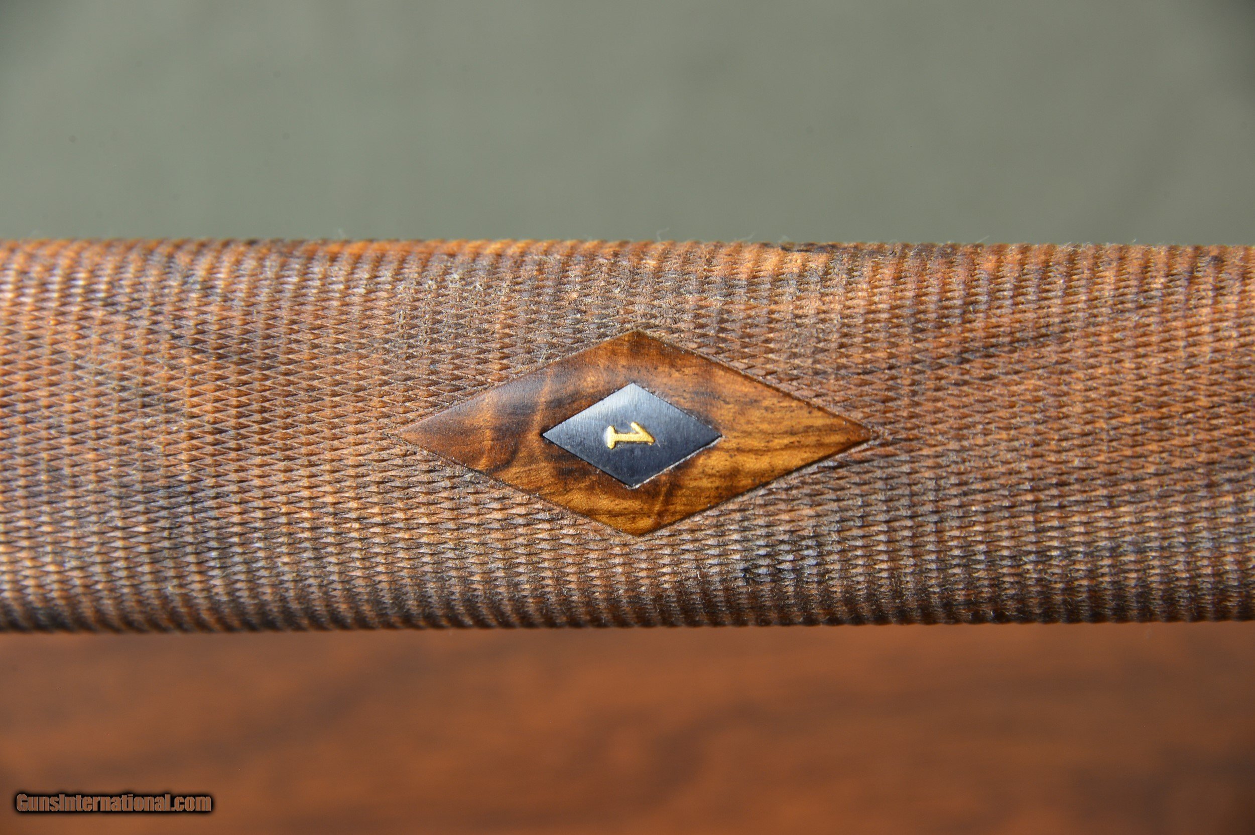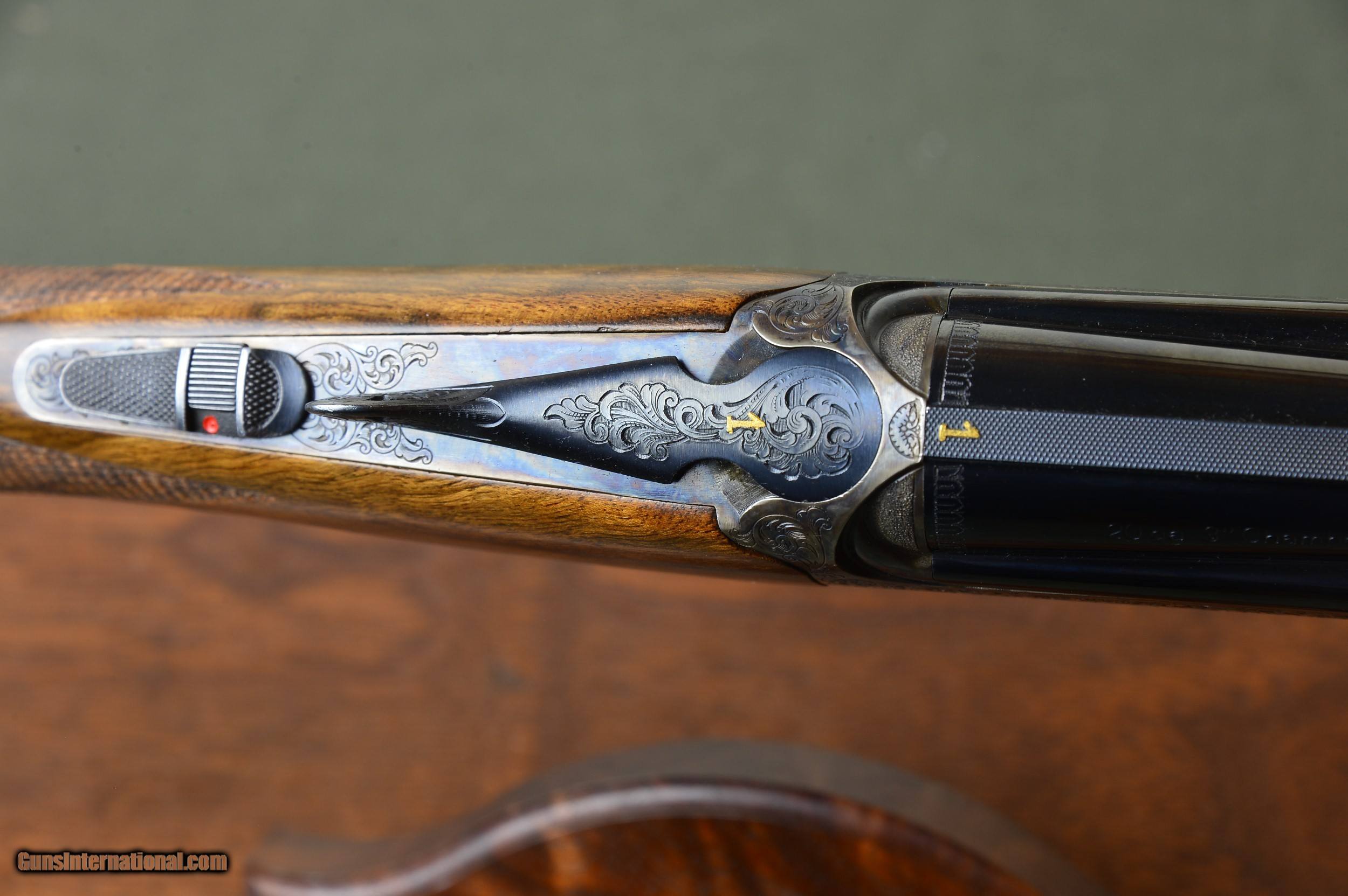 Description: *** SOLD *** Beautiful B. Rizzini 20 gauge Round Body with full coverage engraving, great case coloring, and engraved pierced toplever, and knock-out wood. Marked No. 1 of a pair on the toplever, rib, and forearm iron this sweet handling little O/U has a single selective trigger, multi-chokes, and selective ejectors. It also has long barrels and a long length of pull which are somewhat rare on small bore game guns. Overall weight is 6lb 3oz. Made for J. Roberts & Son in 2005 this gun was originally made for the English gun market. *** The 74cm (29-1/4”) barrels are beautifully blued and are topped by a raised, crosshatched ventilated rib. They are chambered for 2-3/4” and 3” shotshells. The barrels both have a bore diameter of 0.627 and have selective ejectors and multi-chokes. *** The pistol grip stock and semi beavertail forearm are made from highly figured European walnut with a hand rubbed oil finish. Checkering is crisp. Stock dimensions are 15-1/16” to a checkered butt by 1-1/2” by 2-1/4”. Neutral cast on the comb back to the heel. The toe is slightly cast-off for the righthanded shooter's comfort *** This guns in in EXCELLENT mechanical and cosmetic condition. The bluing and case coloring are nearly perfect showing little if any wear. The same is true of the stock and forearm. SPECIAL NOTE: This gun is No. 1 of a pair and can be purchased with its consecutively serial numbered mate in their factory Rizzini ABS double gun case. Please contact me for details and a price. This would be a great gun for upland gunning or for small bore sporting clays. *** I am an FFL and will need a signed copy of your dealer’s FFL license. Not for sale where prohibited by state or local laws. Buyer is responsible for all shipping, insurance, and any other related charges. I give a 3-day non-firing inspection period and will only accept returns at buyer’s expense if the gun is not as described in the listing. SOLD |