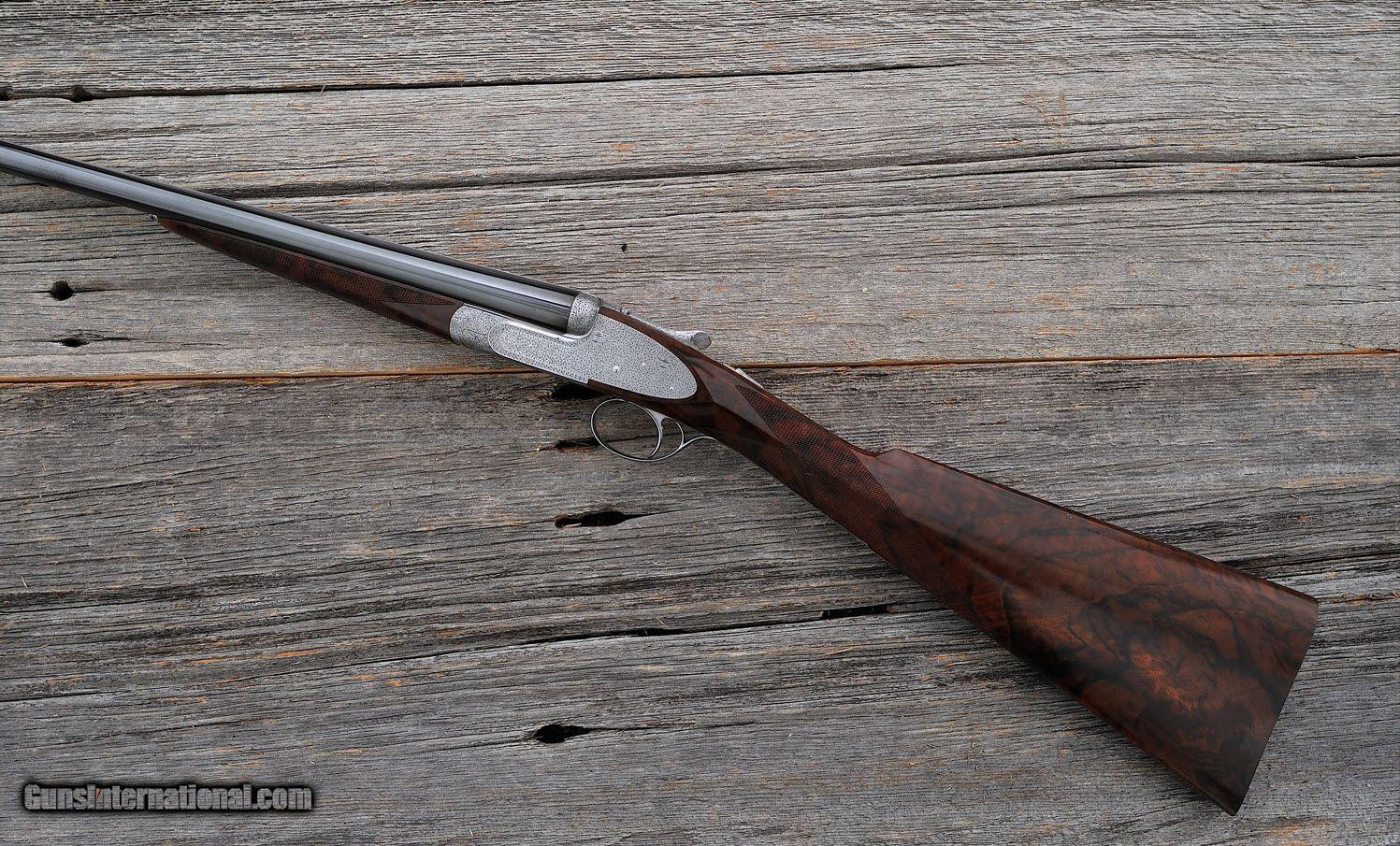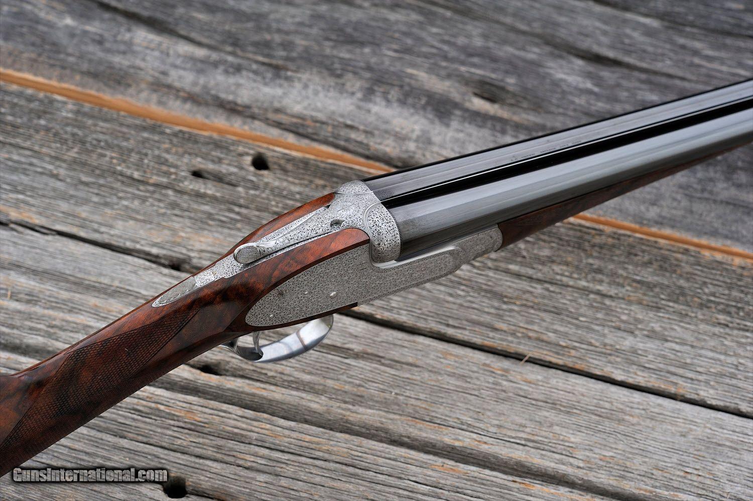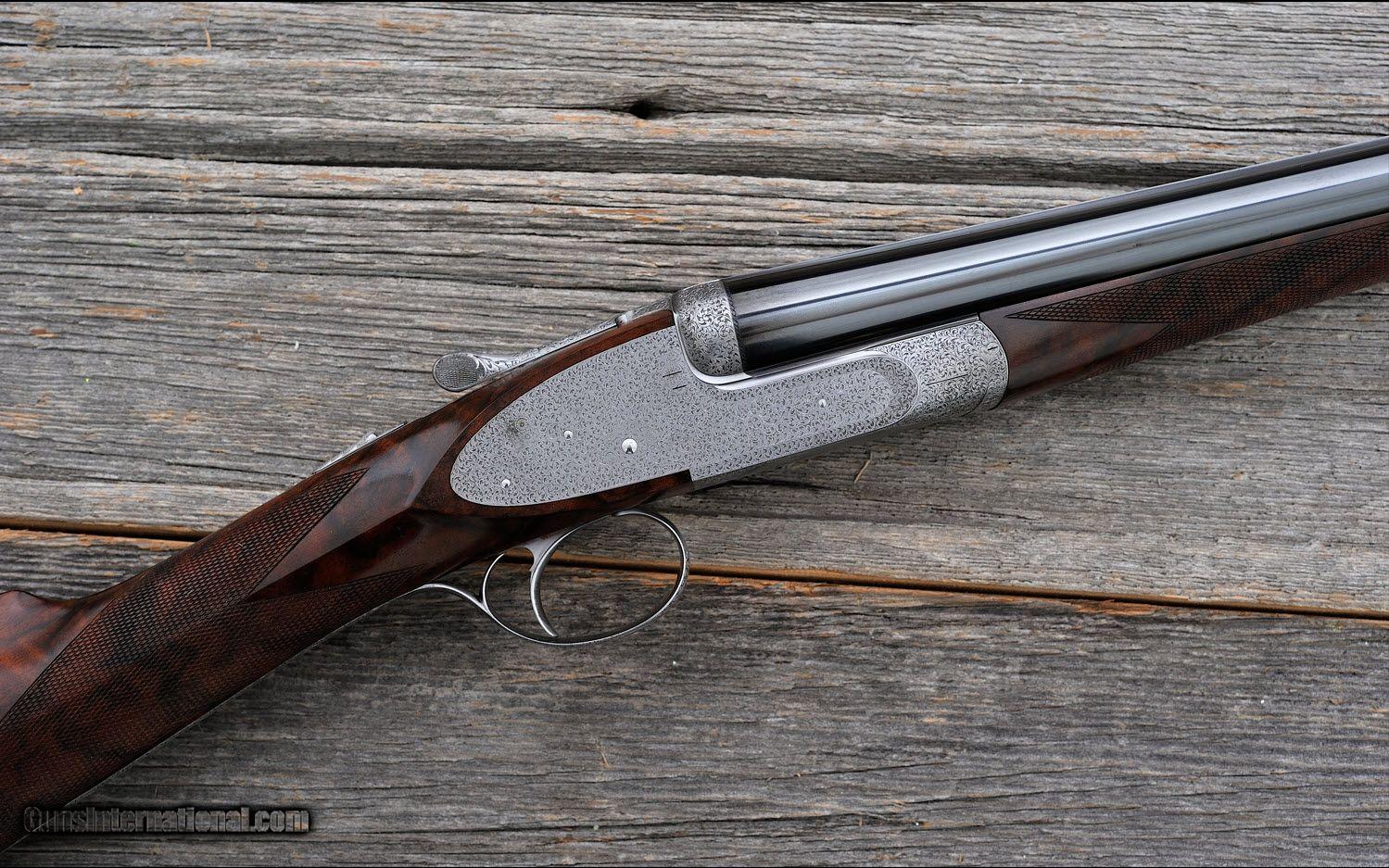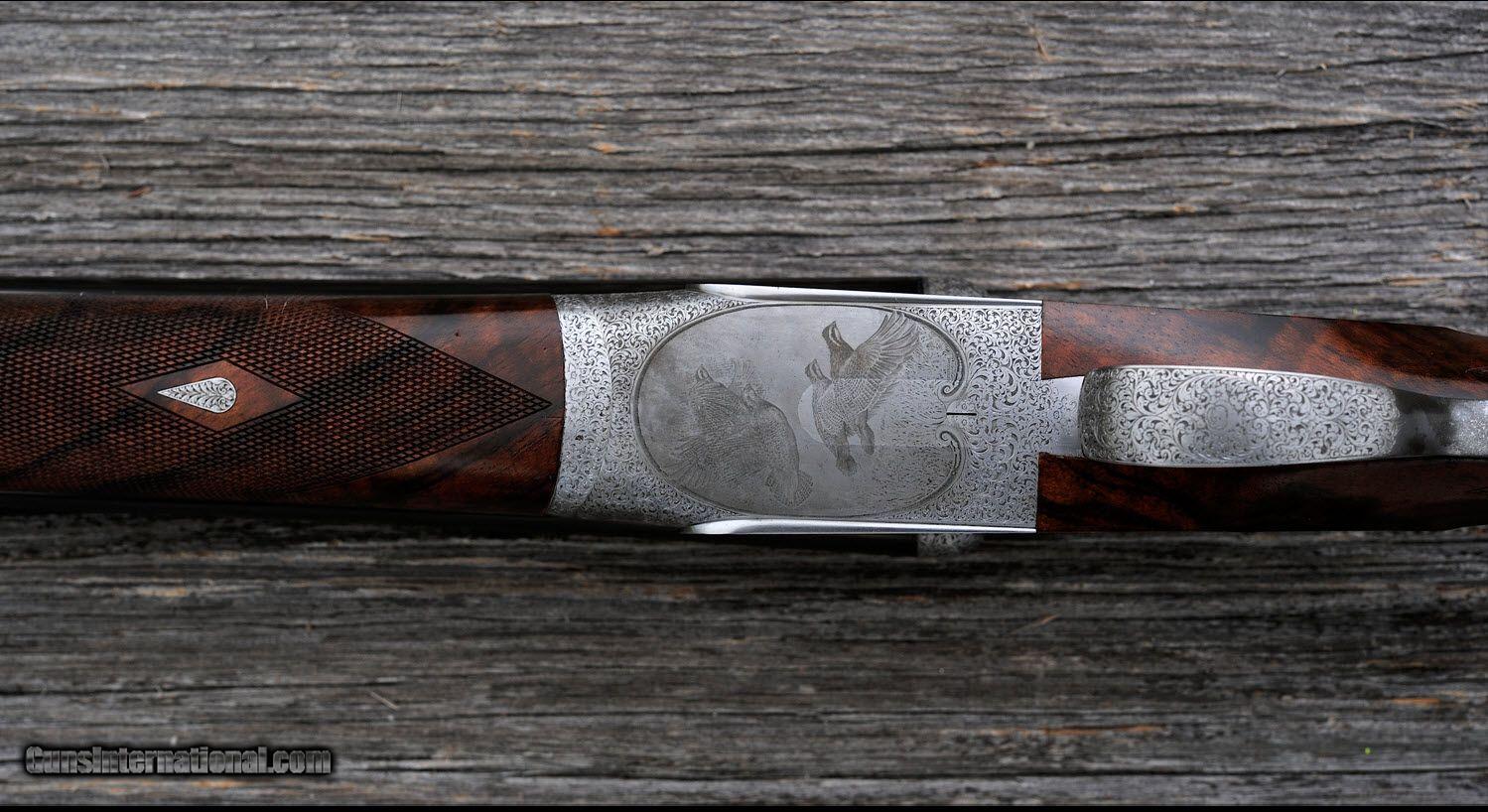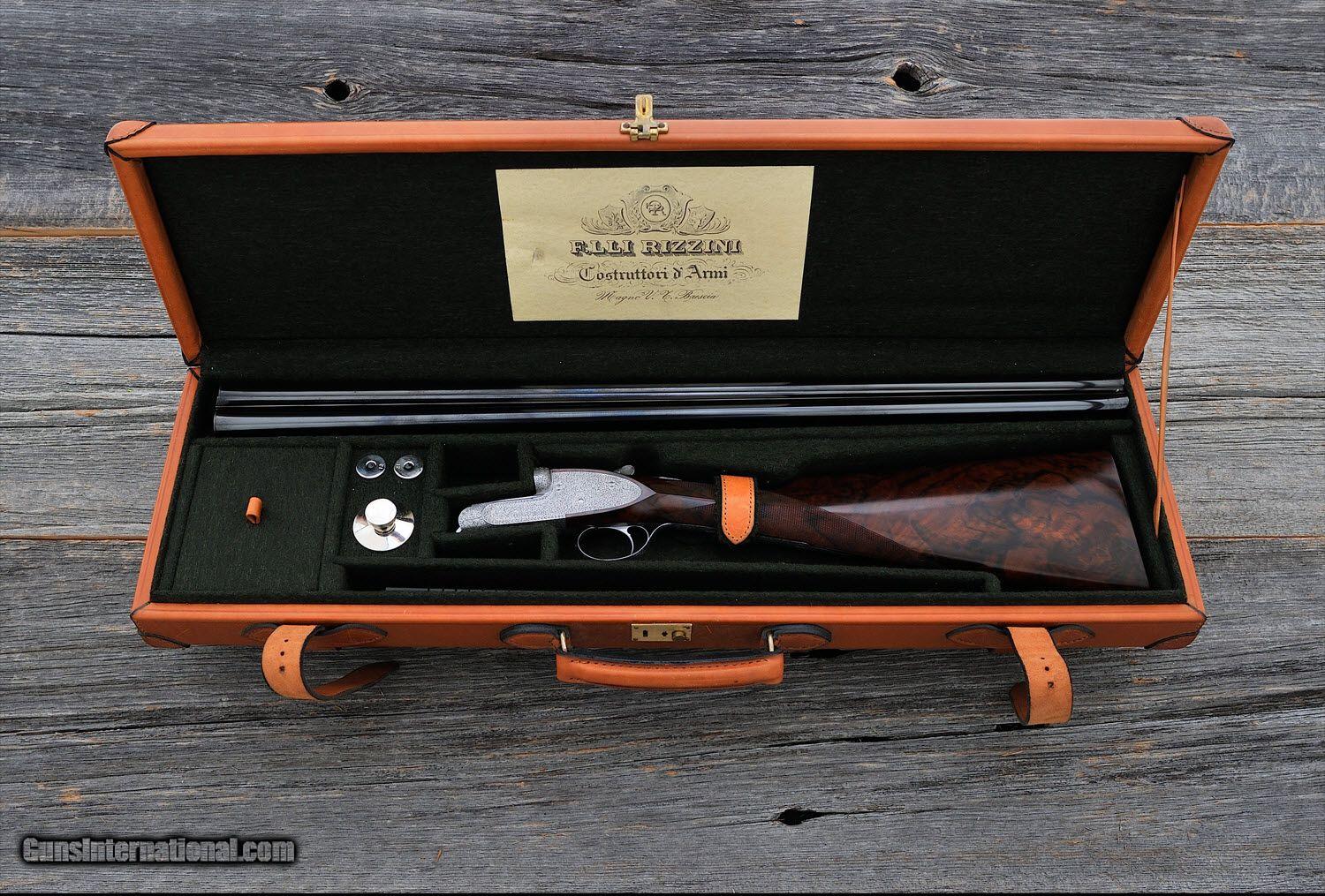 Description: F.lli Rizzini - RI-E - 20 ga - Item Number: RIZ1951 Shotgun type: SxS Action: Sidelock Ejectors: Yes Trigger: Single Grip: Straight Grip Forend: Checkered Lop: 14 1/2 " Pad thickness: " Type of butt: Checkered Wood Drop comb: 1 1/2 " Drop heel: 2 1/4 " Cast amount: 1/8 " Cast: OFF Weight: 6 lbs, oz Manufactured in: Italy Manufacture Year: 1990Finish: Coin Overall condition: Very Good Stock condition: Very Good Metal condition: Very Good Stock: Original finish Metal: Original finish Type of Case: Leather Luggage Case Extra barrels: 0 Barrel info: Gauge: 20 ga Chamber: 2 3/4 " Length: 27 1/2 " Chokes: M/F Rib type: Concave Comments : Beautiful Fracazzi engraving, gun is in very good condition with a few light blemishes. SG-64 SOLD |