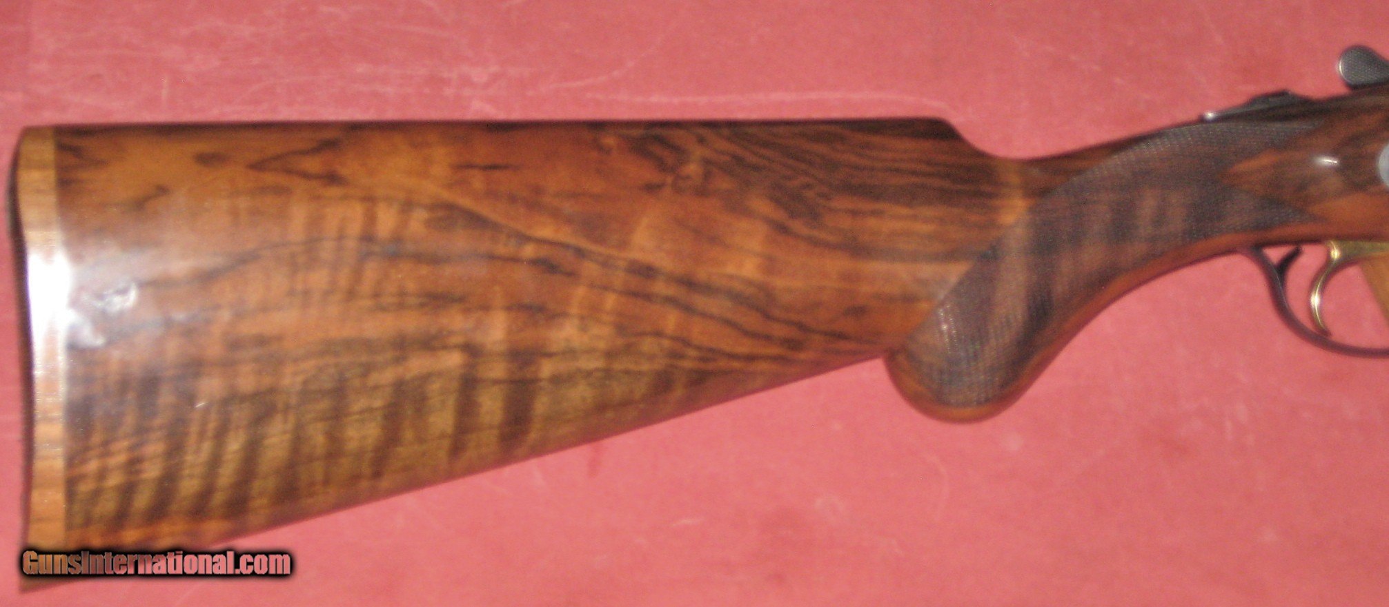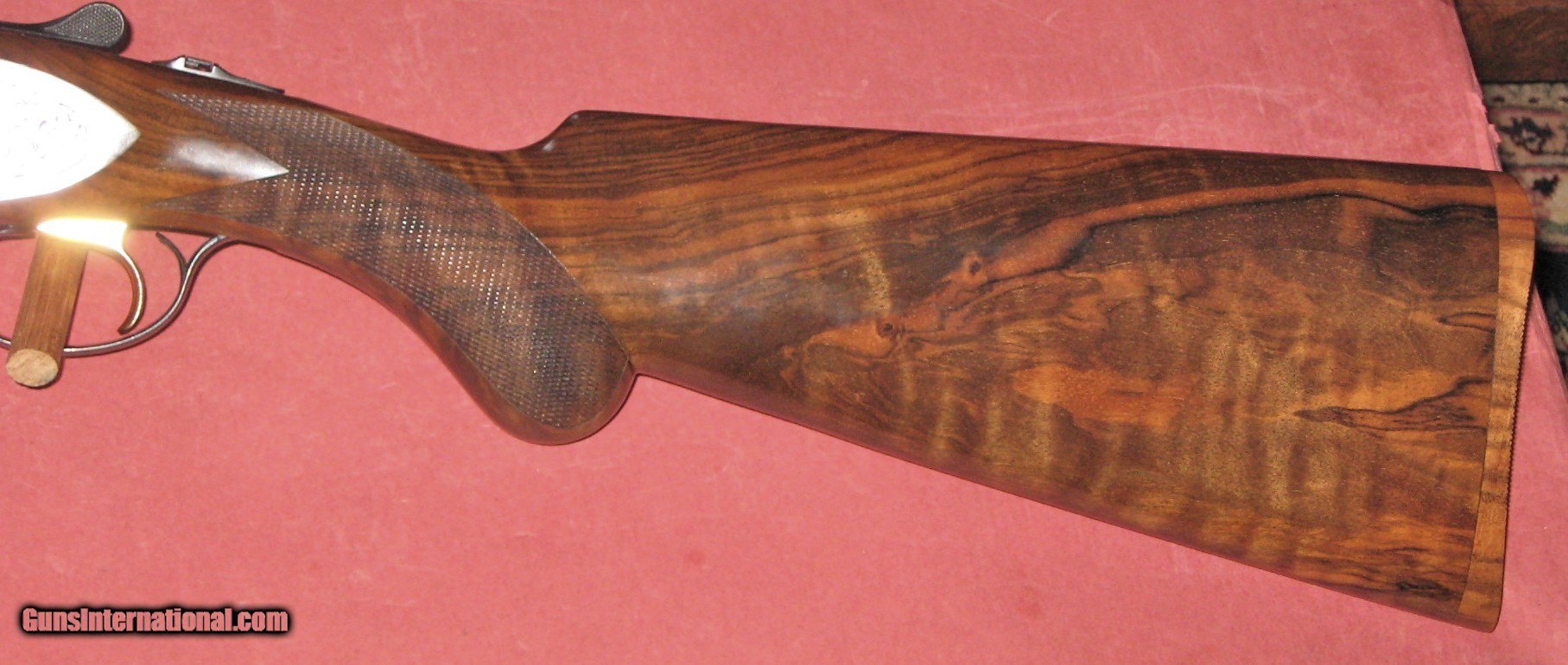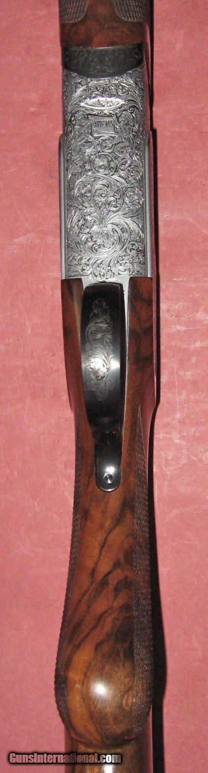 Description: A beautiful Rizzini Artemis Deluxe 20 gauge.This beautiful little game gun has full coverage deep releif floral engraving with a coin finish.The 28" barrels have a vent rib,3" chambers, and Rizzini chokes.The wood is outstanding European walnut.The gun has been fired,but it shows no wear at all.It retains 100% of the metal and wood finish.The stock dimensions are 145/8" LOP over a factory wooden buttplare,11/2" at comb,and 21/4" at heel.The gun weighs 6-6.It is cased in the makers case with chokes.A great upland bird gun or clays gun. SOLD Manufacturer: Rizzini Model: Artemis Deluxe Serial Number: 88043 Chambers: 3 Ejectors: yes Metal Condition: mint Wood Condition: mint Bore Condition: m Action: over under Triggers: single selective Stock Dimensions: 145/8"x11/2"x21/4 Butt Pad: factory wooden buttplate Weight: 6-6 Chokes: Rizzini chokes Case: factory case |
