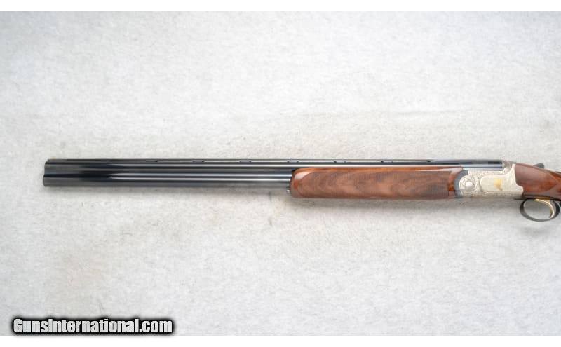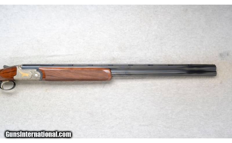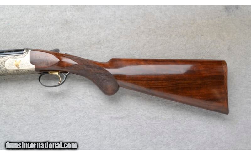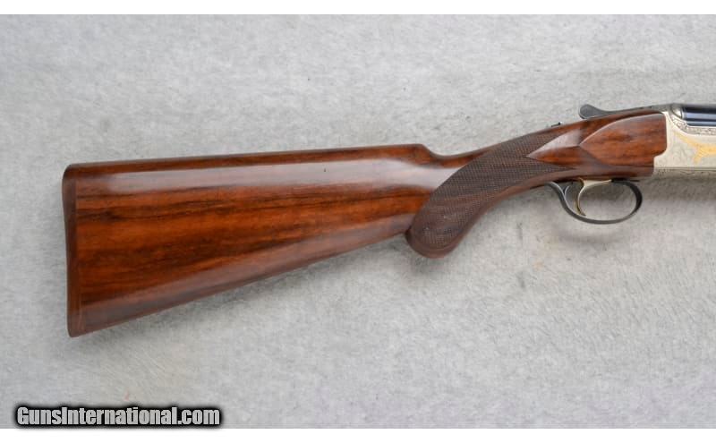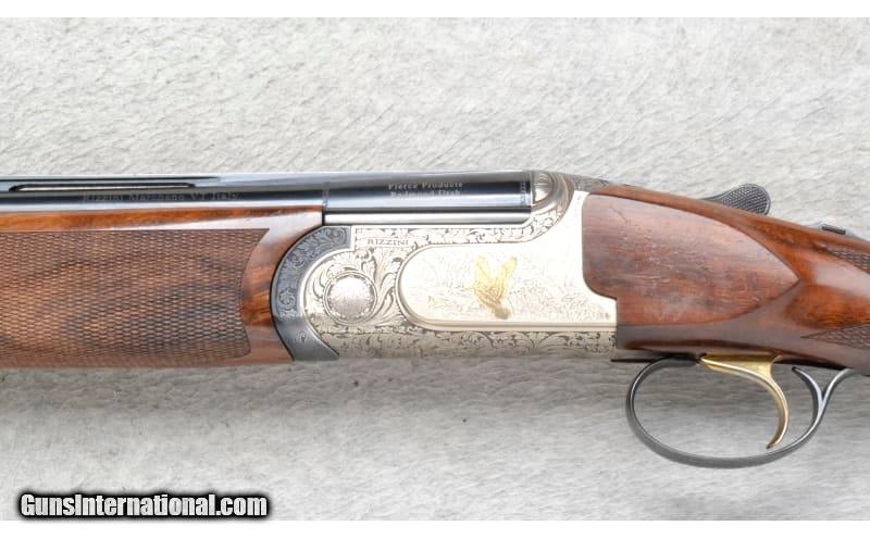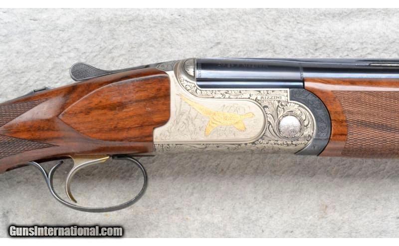 Description: This Rizzini Model Aurum Light is an over and under shotgun in 20 Ga. It has 26.25 inch barrels with ejectors and a top barrel ventilated rib. A brass bead front sight. With 3 inch chambers it comes with 5 choke tubes. It has a SST. The butt stock is a checkered grip walnut round knob pistol grip. The forearm is a checkered grip walnut. The receiver is beautifully engraved with scroll and has golden snipe and pheasant flying in an outdoor scene. 20 Gauge SOLD Chambers: 3 inch. Metal Condition: Excellent. Wood Condition: Good. Has some minor use marks and surface blemishes. Bore Condition: Bright and shiny. Barrels: 26.25 inch barrels with ejectors and a top barrel ventilated rib. Triggers: SST Stock Dimensions: LOP 14 1/2 inches. DAC 1 3/8 inch. DAH 2 1/4 inch. Fore End: Checkered grip walnut. Butt Pad: Grooved walnut plate. Weight: 5 lb. 4 oz. Sights: Brass bead front. Chokes: Comes with 5 choke tubes and wrench. Item Location: Richfield, WI |