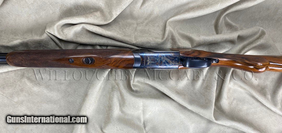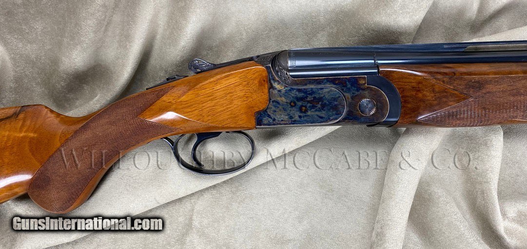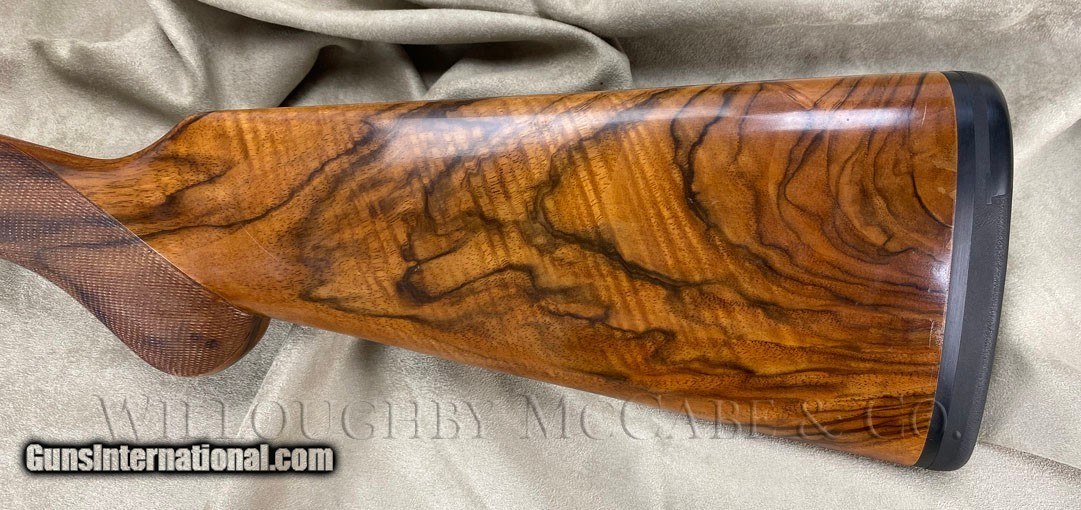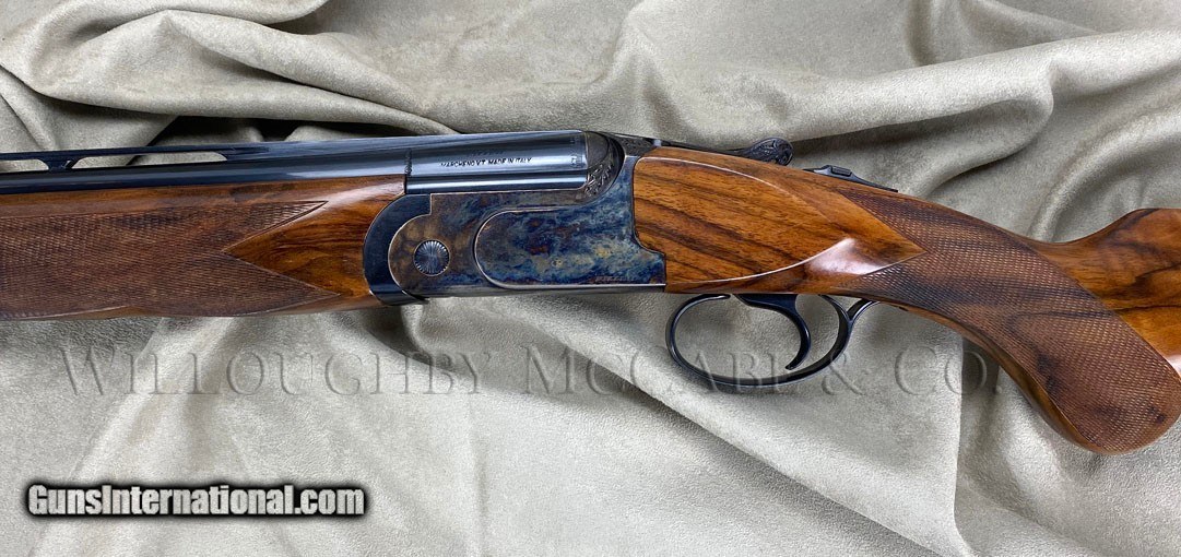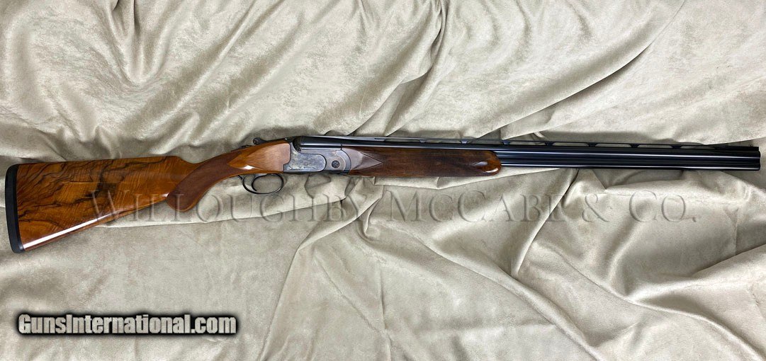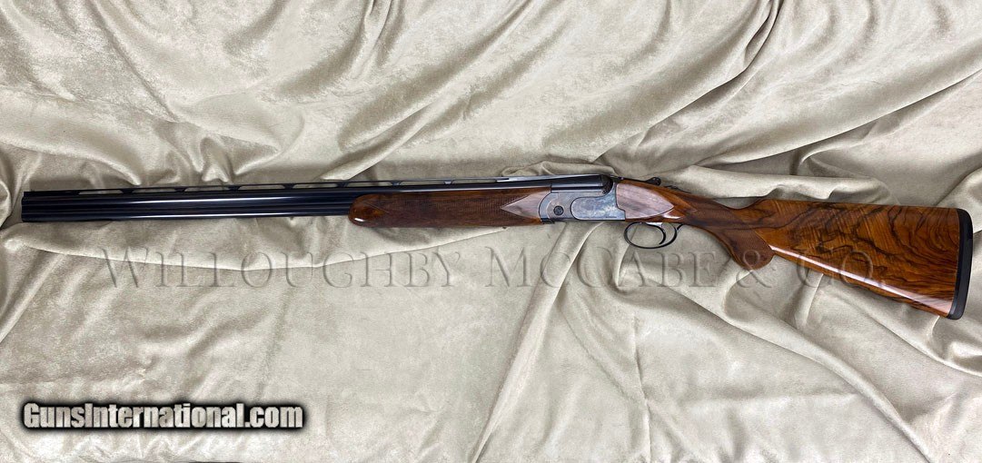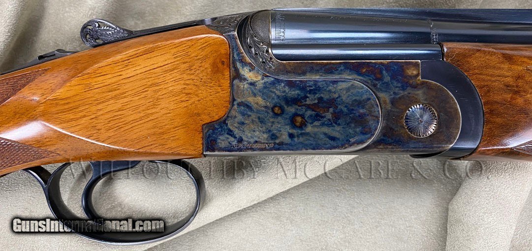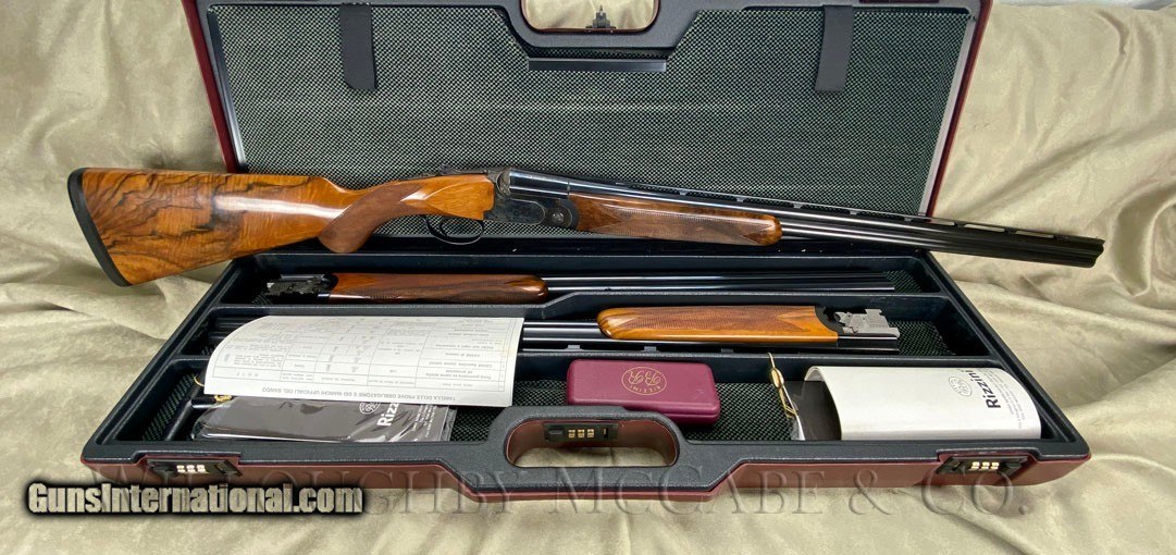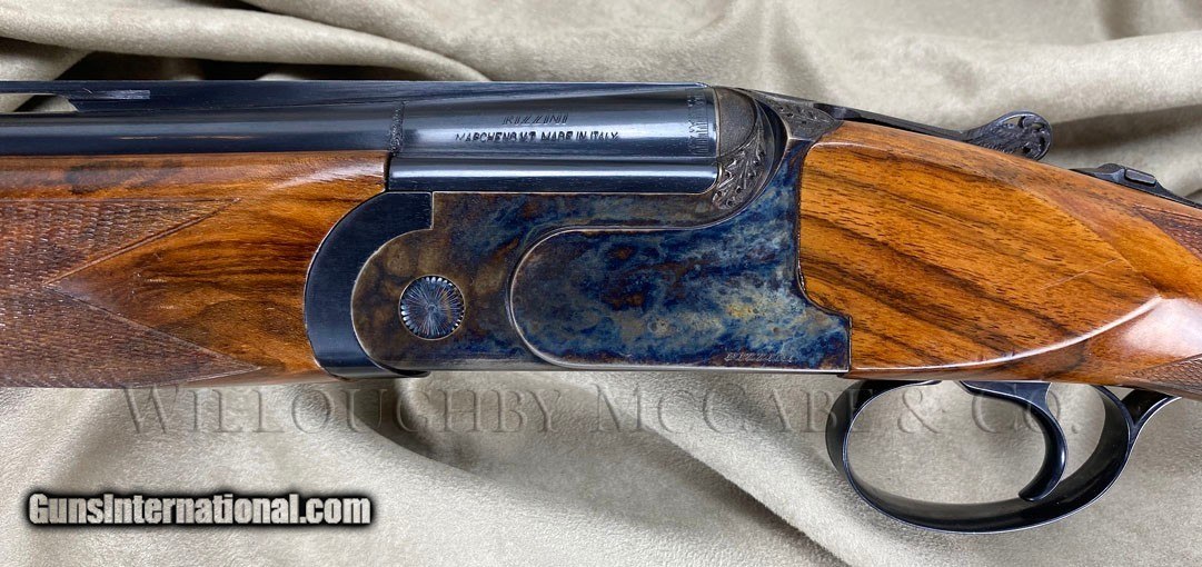 Description: Rizzini 3 Gauge cased set. This was a William Larkin Moore import and has only been test fired with the 20 gauge set of barrels. The action is case colored with all color appearing as new, oak accents on the fences, single selectable trigger, small amount of wear below the lever. The barrels are all 70mm in length, 27 5/8" with vent ribs, the 20 Gauge set has interchangeable chokes and a sling swivel factory applied. All three bores and blue are as new, all three sets have slim/ sporting style fore ends. The .410 set of barrels measure .415 and have chokes Lower .008 and upper .014, 3" Chamber proofed 36/.410. The 28 Gauge set measures .547 and chokes, lower .005 and upper .027, 2 3/4" chambers proof 70/28. The gun weighs nearly the smae with all three sets of barrels 6lbs 5oz. the stock is a round knob pistol grip with very much above average wood. The finish and chequering on all three fore ends and grip is as new. 14 5/8" length of pull to a pad, 2 1/8" drop at heel, 1 5/8" drop at comb. 0193561HHSS $6200.00 SOLD Shotgun Gauge: 20 Gauge, 28 Gauge, .410 Gauge Manufacturer: Rizzini Model: BL Upland Barrel Length: 70CM 27 5/8 |