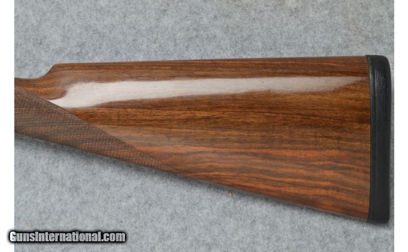 Description: Used. A fine example of a high quality Italian made side by side. Lightweight, handles nicely and points naturally. SOLD Caliber Info: 20 Ga. Chambers: 2 3/4 inch side x side with extractors. Metal Condition: Excellent Wood Condition: Excellent Bore Condition: Excellent; Clean & Bright Barrels: 28" Blued Barrels Triggers: Smooth Blued Dual Triggers Stock: Straight Wrist Checkered Walnut Stock Dimensions: LOP: 14 3/4 Fore End: Checkered Walnut Butt Pad: Lightly Textured Black Stiff Rubber Weight: 6 Lb. 5 oz. Sights: Front: Silver Bead Chokes: IC / IC Extras: Includes Original Hard Case, Cloth Sleeves, and Papers Item Location: Sun Prairie, WI |
