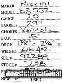 Description: Rizzini BR 552 20 gauge SOLD Serial Number: 92289 Barrels: 29 Stock Comb: 1 3/8 Stock Heel: 2 1/4 LOP: 15 Weight: 6lbs 4oz Chokes: Variable |