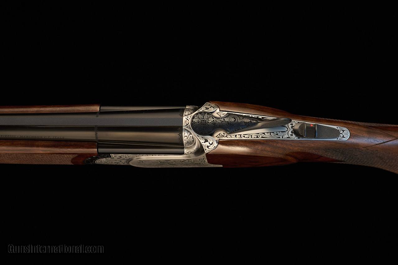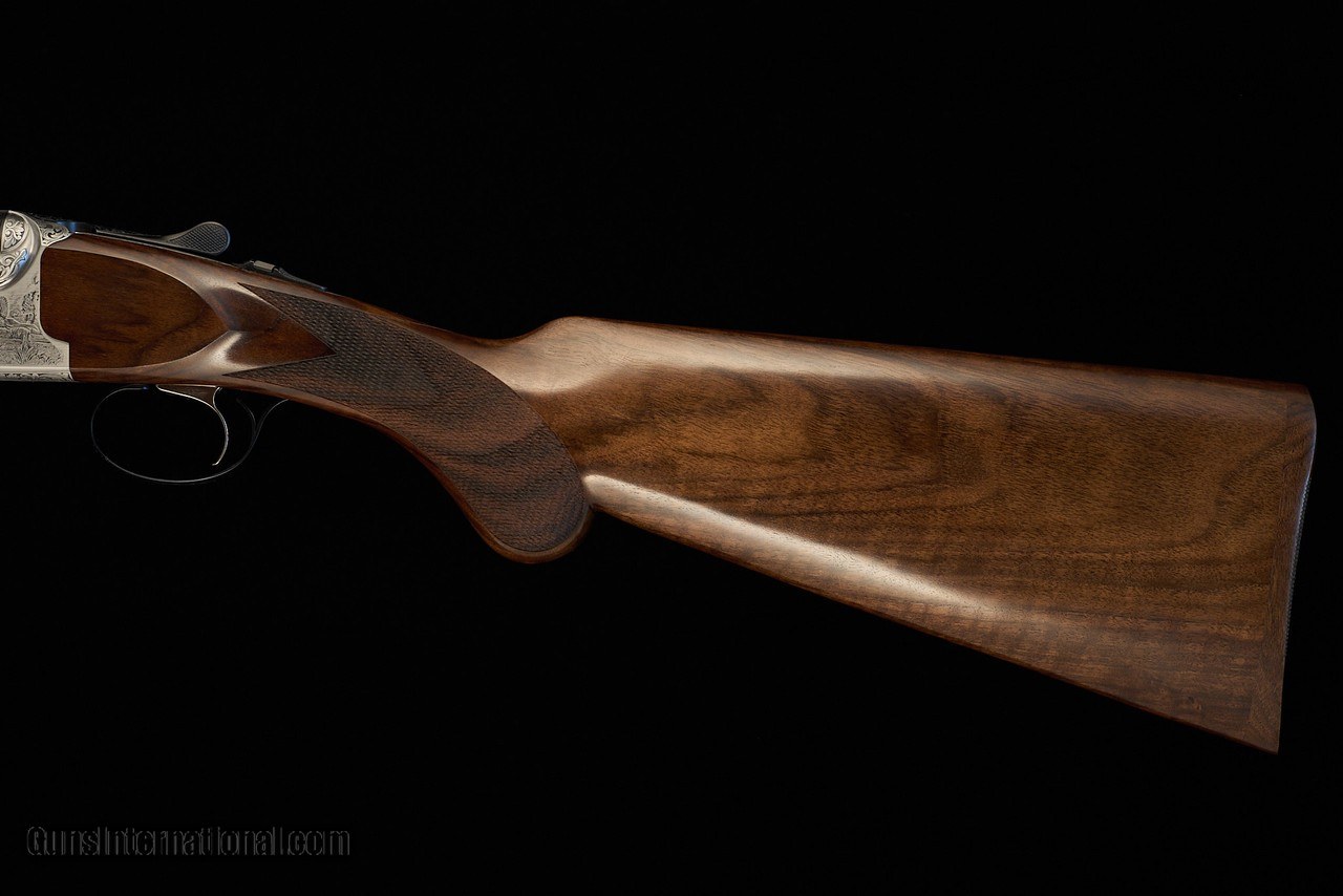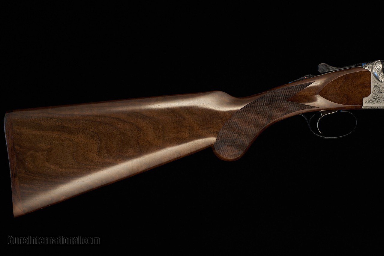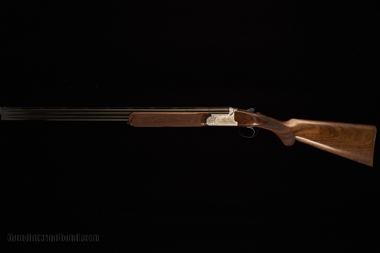 Brand new Rizzini BR220 in 20ga with 28” barrels, featuring a selective trigger, screw-in chokes, solid side ribs, and ventilated top rib. The coin-finished action is adorned on the side panels with game bird motifs and hand-chased scroll on the remainder. The Prince-of-Wales stock and rounded forearm are made of Turkish walnut with semi-gloss oil finish over a nicely blended wooden buttplate. Barrel selection is done via a safety-mounted toggle in the traditional Italian fashion.