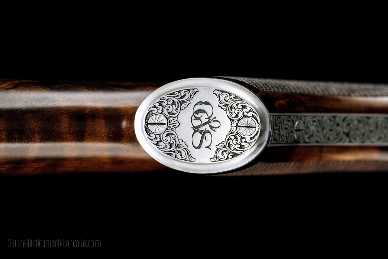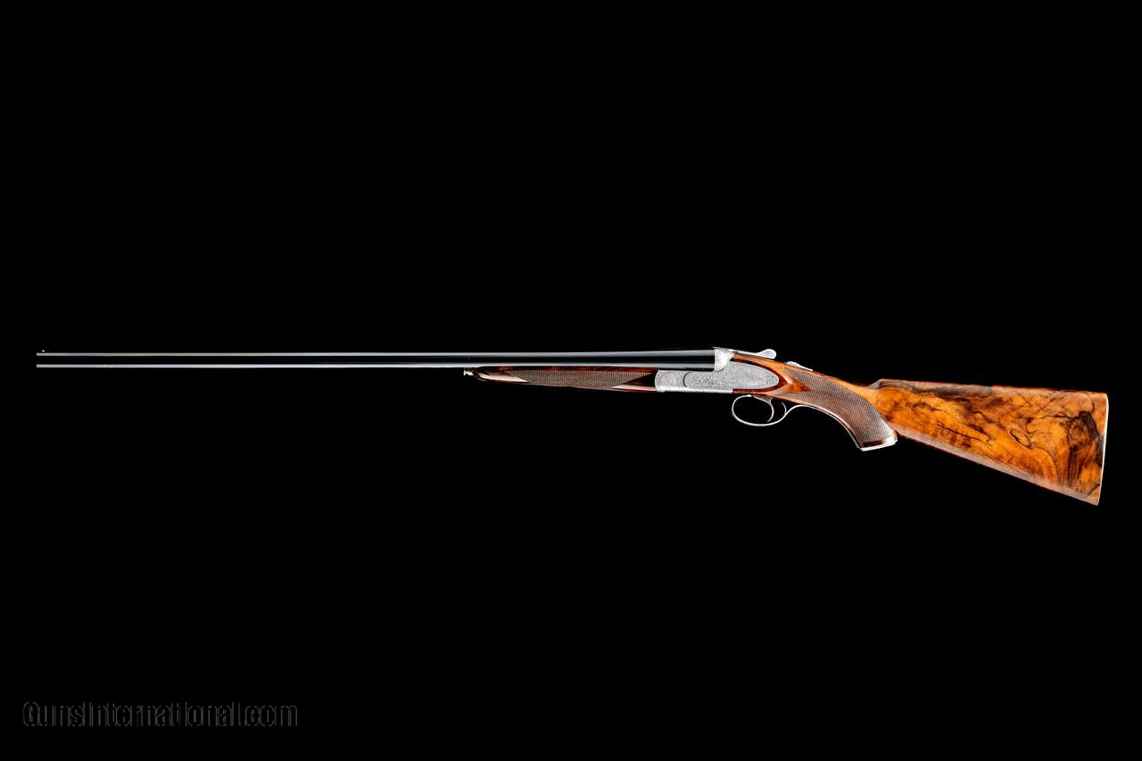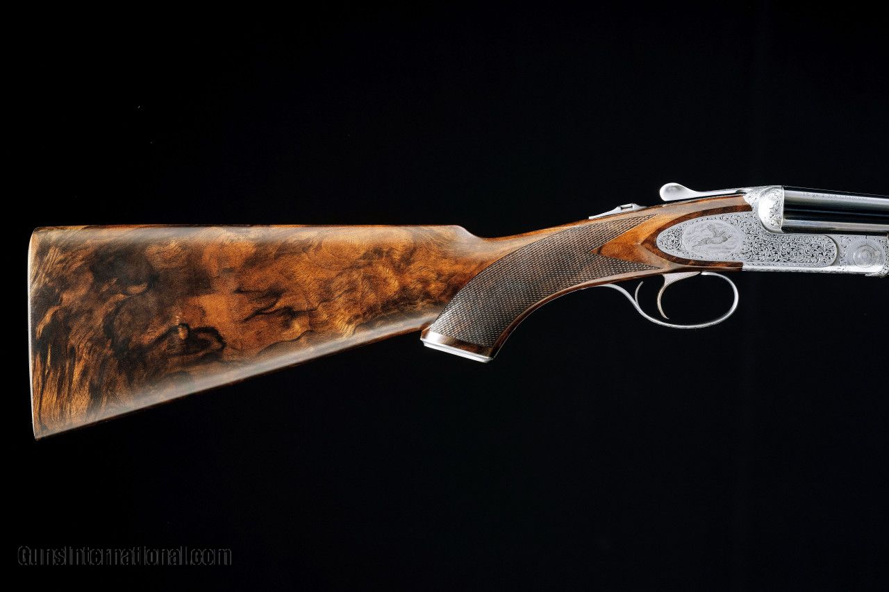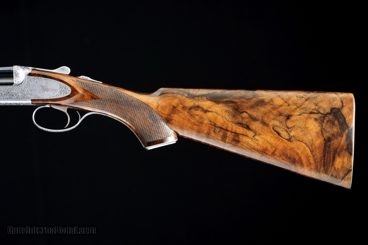 Gun balances 1/4" ahead of the hingepin and, at 6lb 4oz, moves quickly without being whippy. This will make an ideal pheasant or dove gun! Comes complete in an upgraded factory leather-covered case with stock sleeves and accessories.
