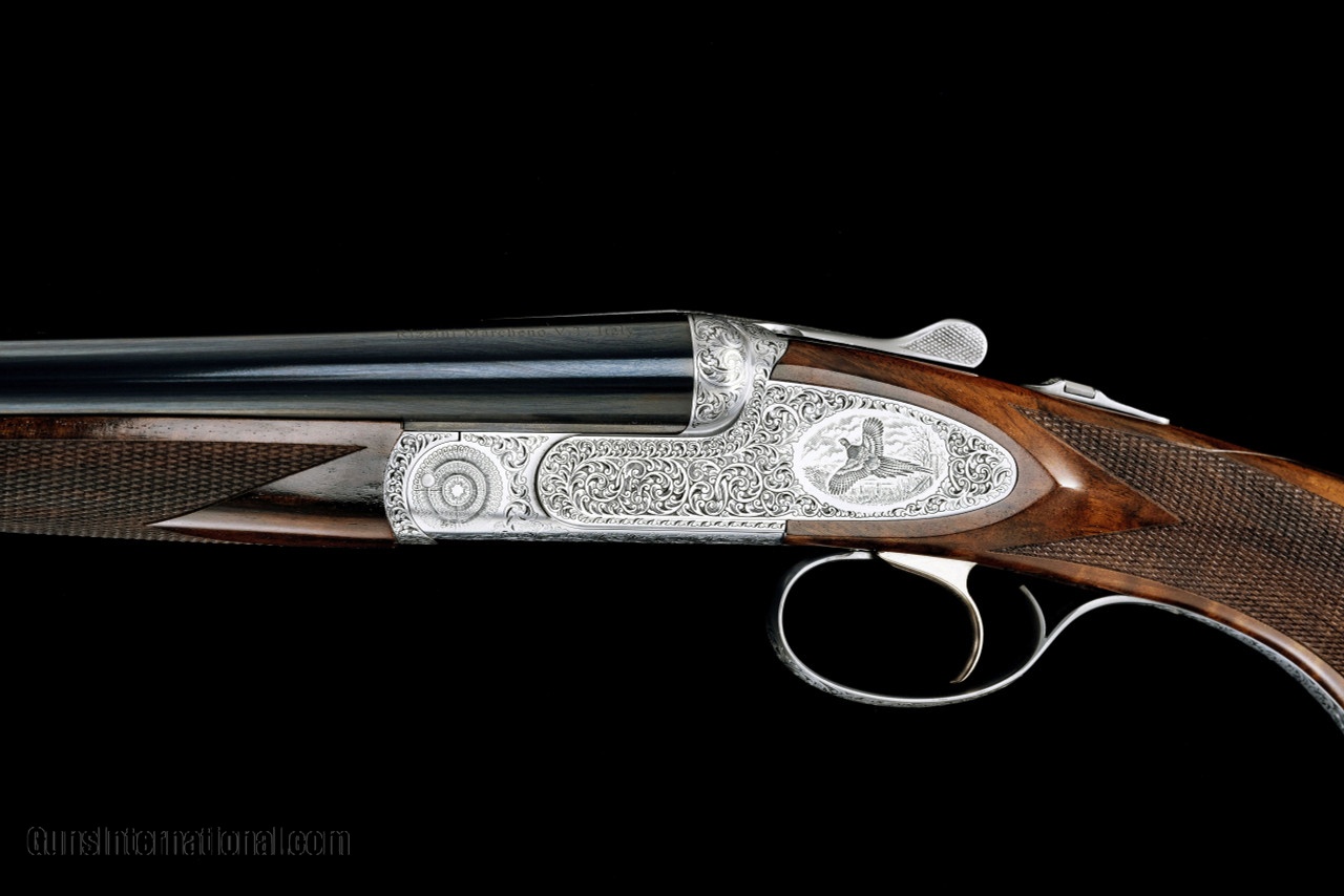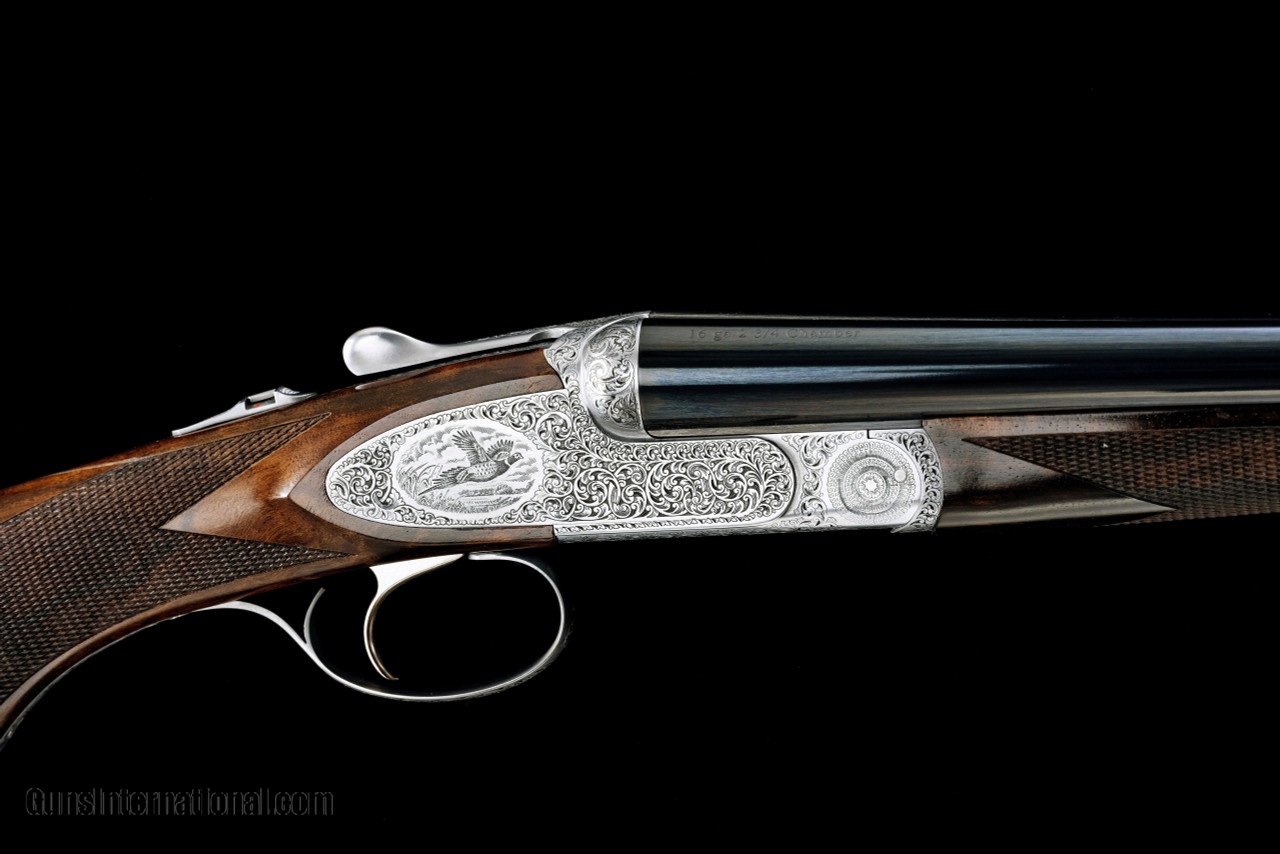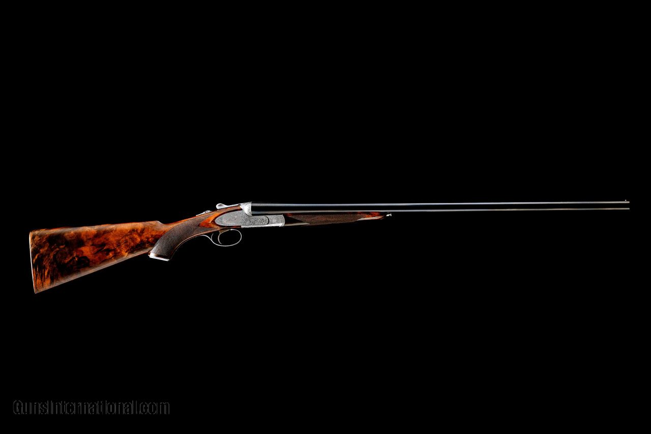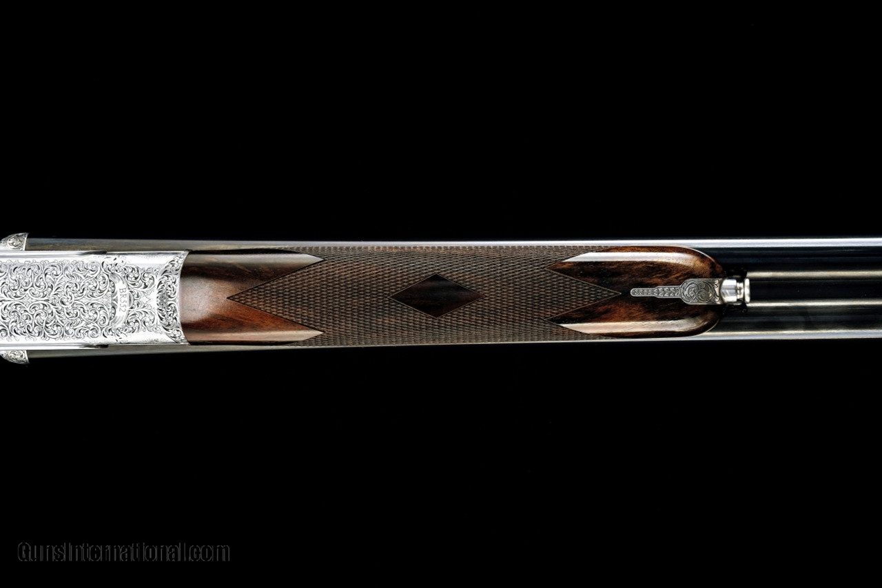 Gun balances 1/4" ahead of the hingepin and, at 6lb 4oz, moves quickly without being whippy. This will make an ideal pheasant or dove gun! Comes complete in an upgraded factory leather-covered case with stock sleeves and accessories.