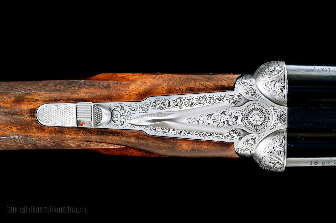 Rizzini BR552 Special in 16ga with 29" fixed-choke (M/IC) barrels with swamped game rib and high polish bluing. Ejectors are automatic. Fully-engraved action features sideplates with elegant flying pheasant motifs. Trigger is single-selective inside a long-tang trigger guard, itself fully scroll-engraved, extending to a two-screw steel grip cap. Stock and forearm are of extra well-figured Turkish walnut with semi-gloss oil finish over a neatly checkered butt-end with access hole for stock bolt.