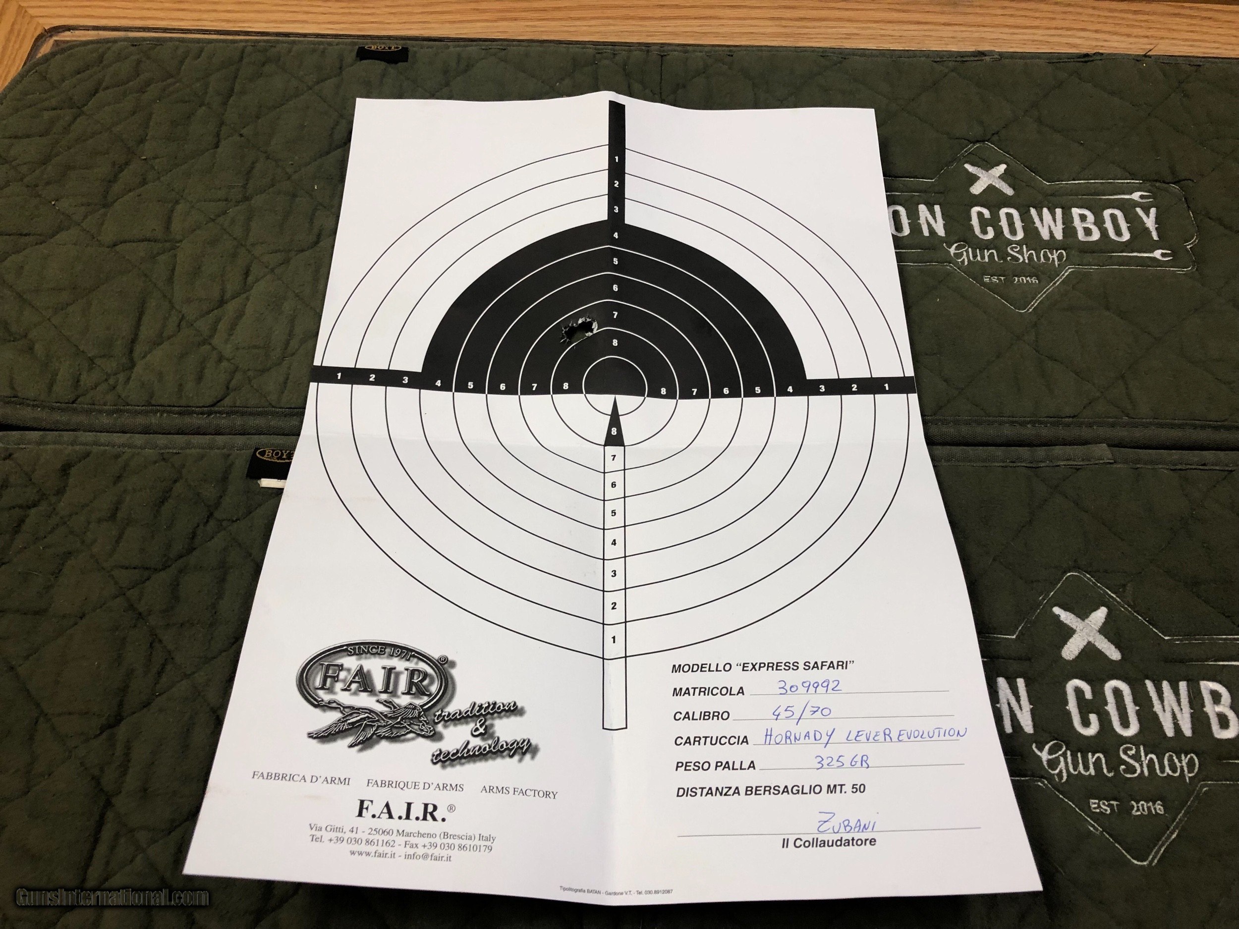 Description: Up for sale is a New FAIR Iside EM Safari. This double rifle is chambered in 45-70 Govt and has 22inch barrels. This rifle has auto ejectors and is regulated with Hornady lever evolution 325 Grain loads. The L.O.P from the front trigger is 15 inches to the end of the recoil pad. There is a hog back comb and a Bavarian cheek piece. This rifle is very well regulated as you can see in the pictures. The rifle comes in 6.07 pounds. There is open sights and it is drilled and tappet for scope mounts. This was a special-order rifle and took over 4 months to receive. Due to MAP priceing please call for the the best price. I sell fine guns, I am not starting a museum I price my guns to move. Call today. Thanks for looking. SOLD Manufacturer: Rizzini FAIR Model: Iside EM Safari Caliber Info: 45-70 Ejectors: yes Condition: New Metal Condition: New Wood Condition: New Bore Condition: New Barrels: 22 Inches Action: Box Lock Triggers: Double Trigger Fore End: Semi Beavertail Butt Pad: Recoil Pad LOP: 15 Finish: Coin Finished Weight: 6.2 Pounds Sights: Iron Sights / Drilled and tapped Manufacture Date: New |