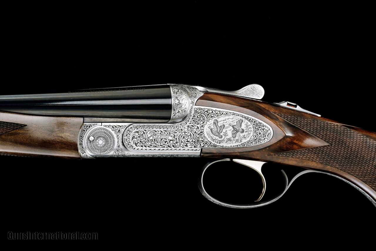 Description: Rizzini Grand Regail Deluxe 410ga 29" barrel, screw in chokes, solid flat filed rib to a brass bead. The gun features a true Prince of Wales grip with a long trigger gaurd to the grip cap. These guns were especially made for Gordy & Sons and feature our G&S logo on the grip cap. The engraving done by Bottega Giovenelli is beautifully done in a deep releif scroll with quail game scene on the rear of the side plate, and features a quail game scene to the rear of the side plate. The shotgun also has exhibitoin grade wood. SOLD Manufacturer: Rizzini Caliber Info: 410 Barrels: 29 Action: Over / Under Triggers: single selective Gauge Info: 410 Stock Comb: 1 1/2 Stock Heel: 2 1/4 Stock Cast: 1/8" off LOP: 14 1/2 Rib: solid flat filed Chokes: screw in chokes |