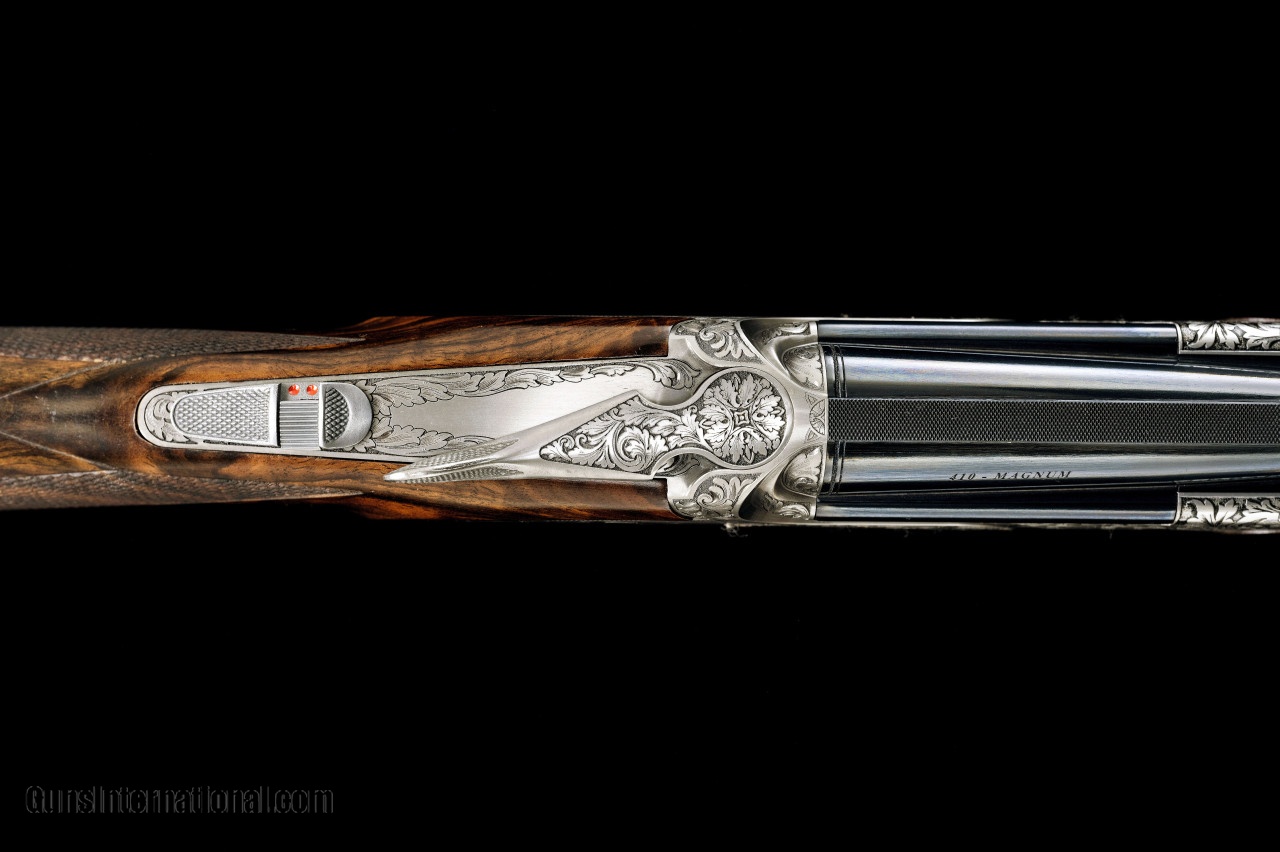 Description: Rizzini Grand Regail Deluxe 410ga 29" barrel, screw in chokes, solid flat filed rib to a brass bead. The gun features a true Prince of Wales grip with a long trigger gaurd to the grip cap. These guns were especially made for Gordy & Sons and feature our G&S logo on the grip cap. The engraving done by Bottega Giovenelli is beautifully done in a deep releif scroll with quail game scene on the rear of the side plate. SOLD Manufacturer: Rizzini Caliber Info: 410 Barrels: 29 Action: Over / Under Triggers: single selective Gauge Info: 410 Stock Comb: 1 1/2 Stock Heel: 2 1/4 Stock Cast: 1/8" off LOP: 14 1/2 Rib: solid flat filed Weight: 6.01 Chokes: screw in chokes |