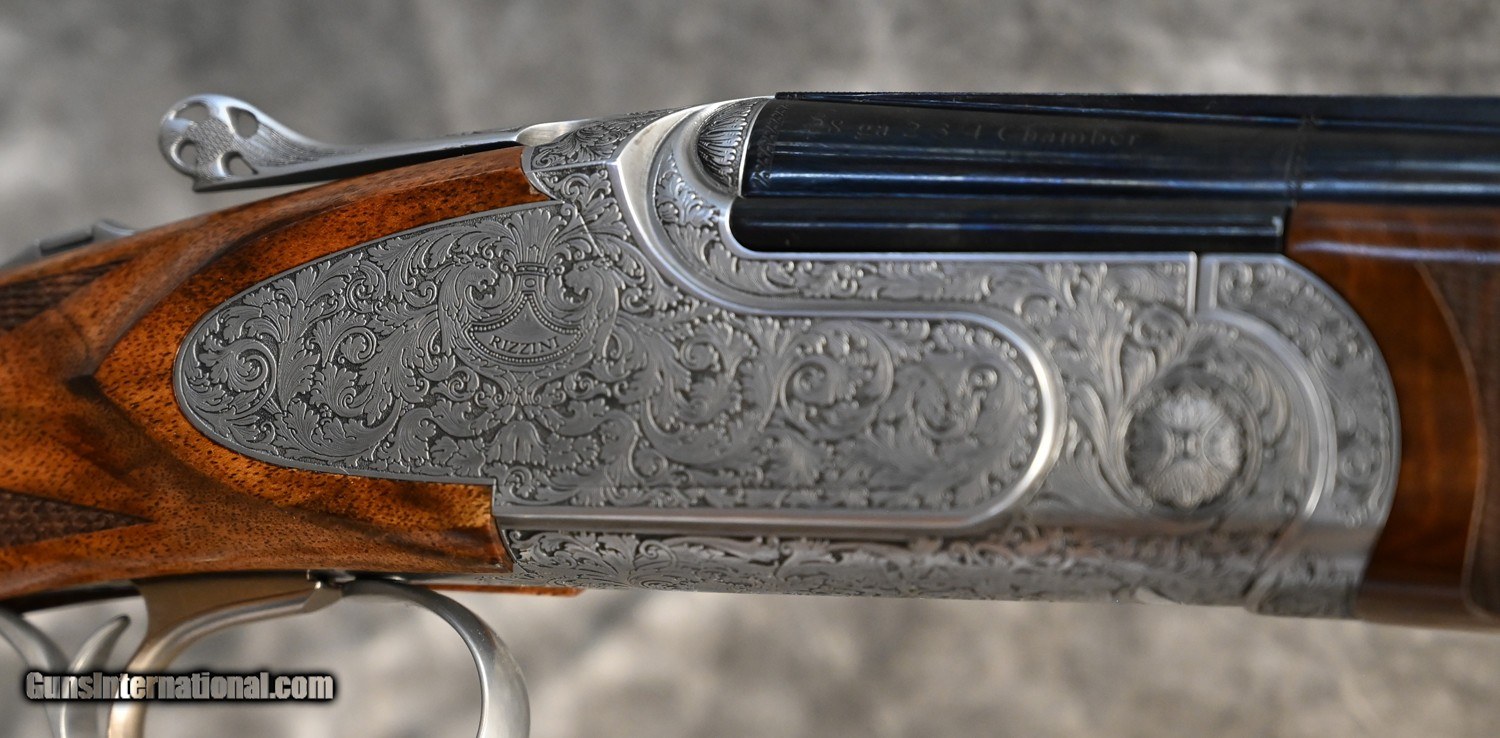 Description: New Rizzini S-2000 Sporting Baby Frame Side-Plate 28GA with 30" factory extended Spectrum choke tubed barrels, flat tapered rib. Coin finished side-plate action with full coverage scroll engraving, factory scaled 28GA action with single, selective trigger. Factory adj. comb sporting stock with right-hand palmswell and fully checkered round forearm. Includes factory case, chokes and tools. SOLD Shotgun Gauge: 28 Gauge |