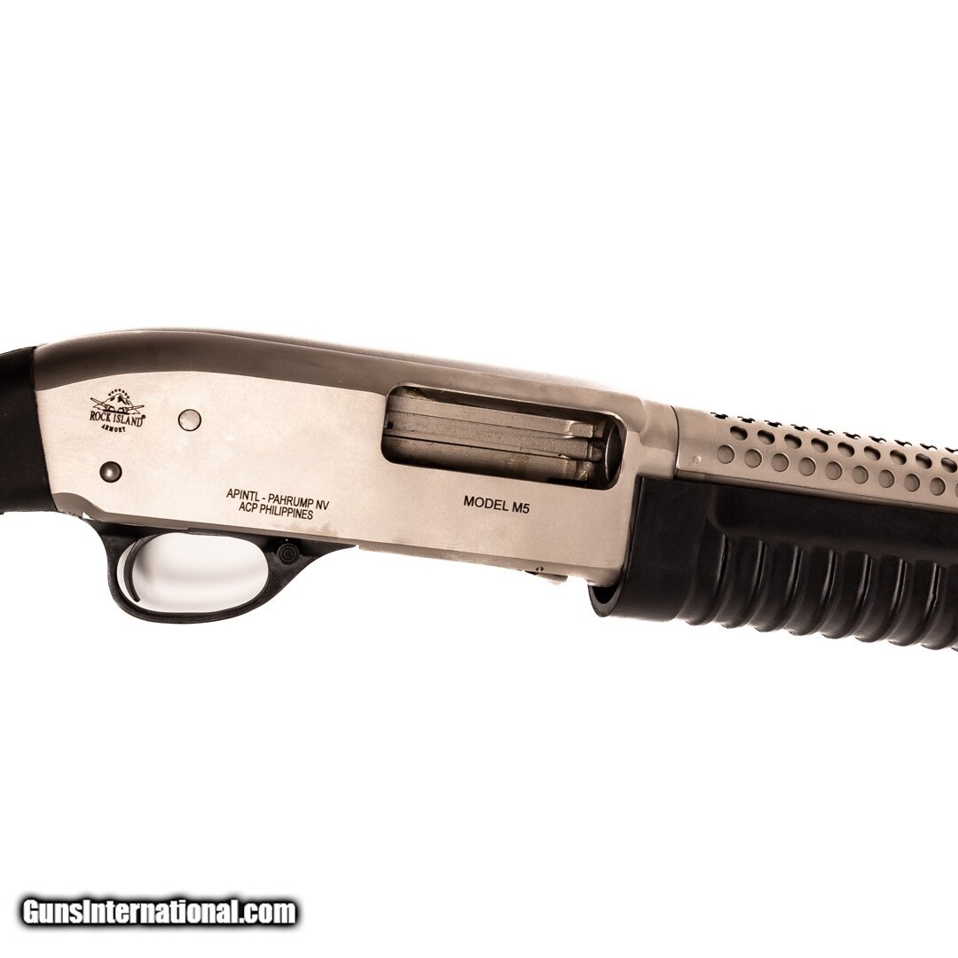 Description: Guns Listing ID: 751198 This listing is for a Rock Island Armory/Armscor M5, a pump-action shotgun that delivers reliability and versatility in a simple package. This 12-gauge M5 has a 3\" chamber and CYL smooth bore. With a 20\" barrel, it‚‚s well-suited for home defense but versatile enough for other tasks too. Get the best bang for your buck when you get a Certified Used Firearm . When you see the Certified Used stamp on any of our firearms, you can be confident that you’re getting exactly what you want – a gun only in very good to excellent condition and held to the highest quality standard. All Certified Used Guns come with a ‘no questions asked’ return policy . PLUS, ALL CERTIFIED USED GUNS SHIP FREE SOLD Manufacturer: ROCK ISLAND ARMORY Model: MODEL M5 Condition: Used - Certified Barrels: 20 BARREL Finish: NICKEL |