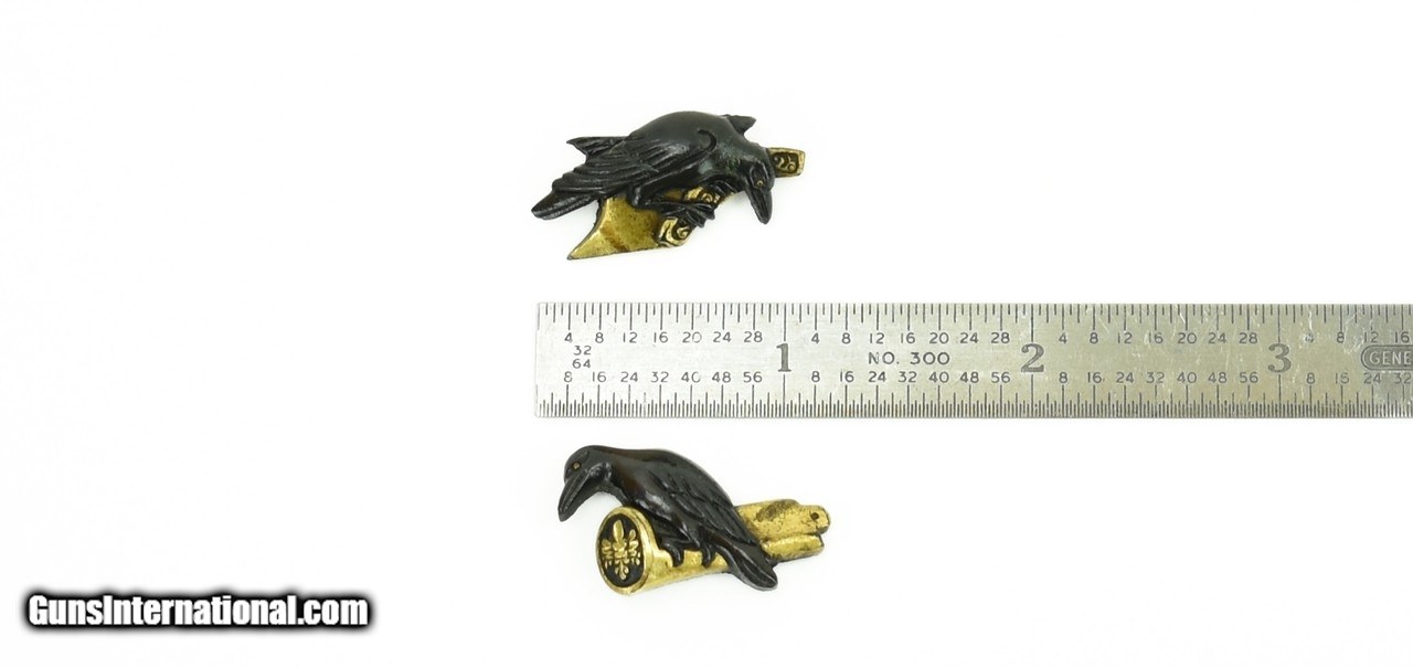 Description: "Kinko Menuki Shakudo motif of Crows on gold Perch. Very good condition. Unsigned (Mumei). SOLD |