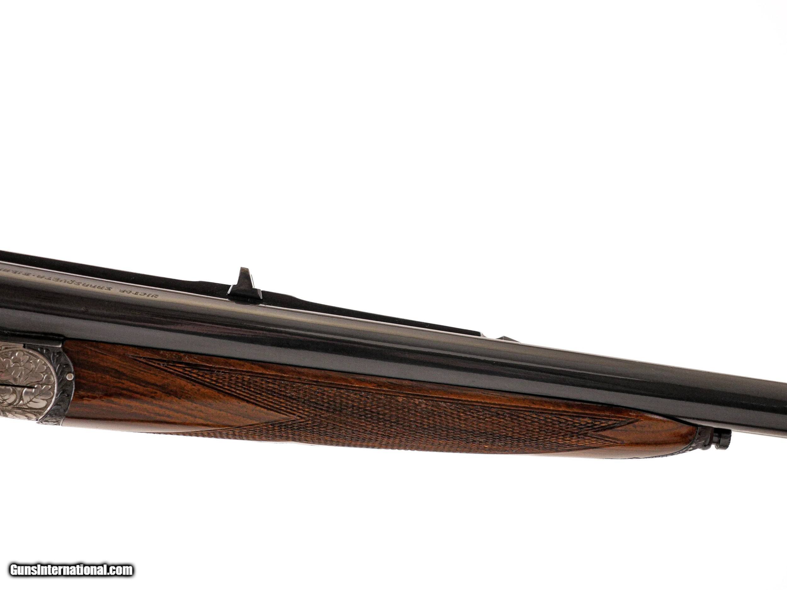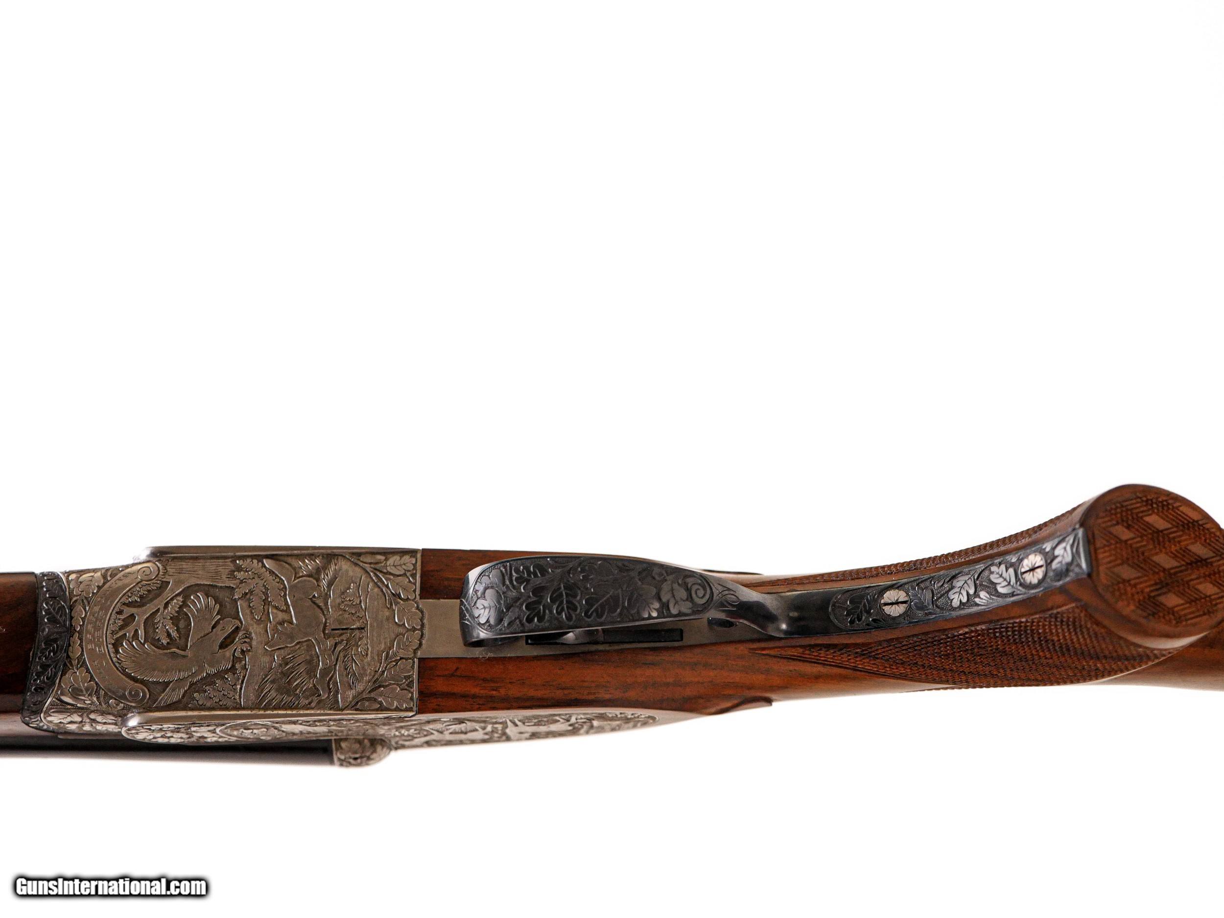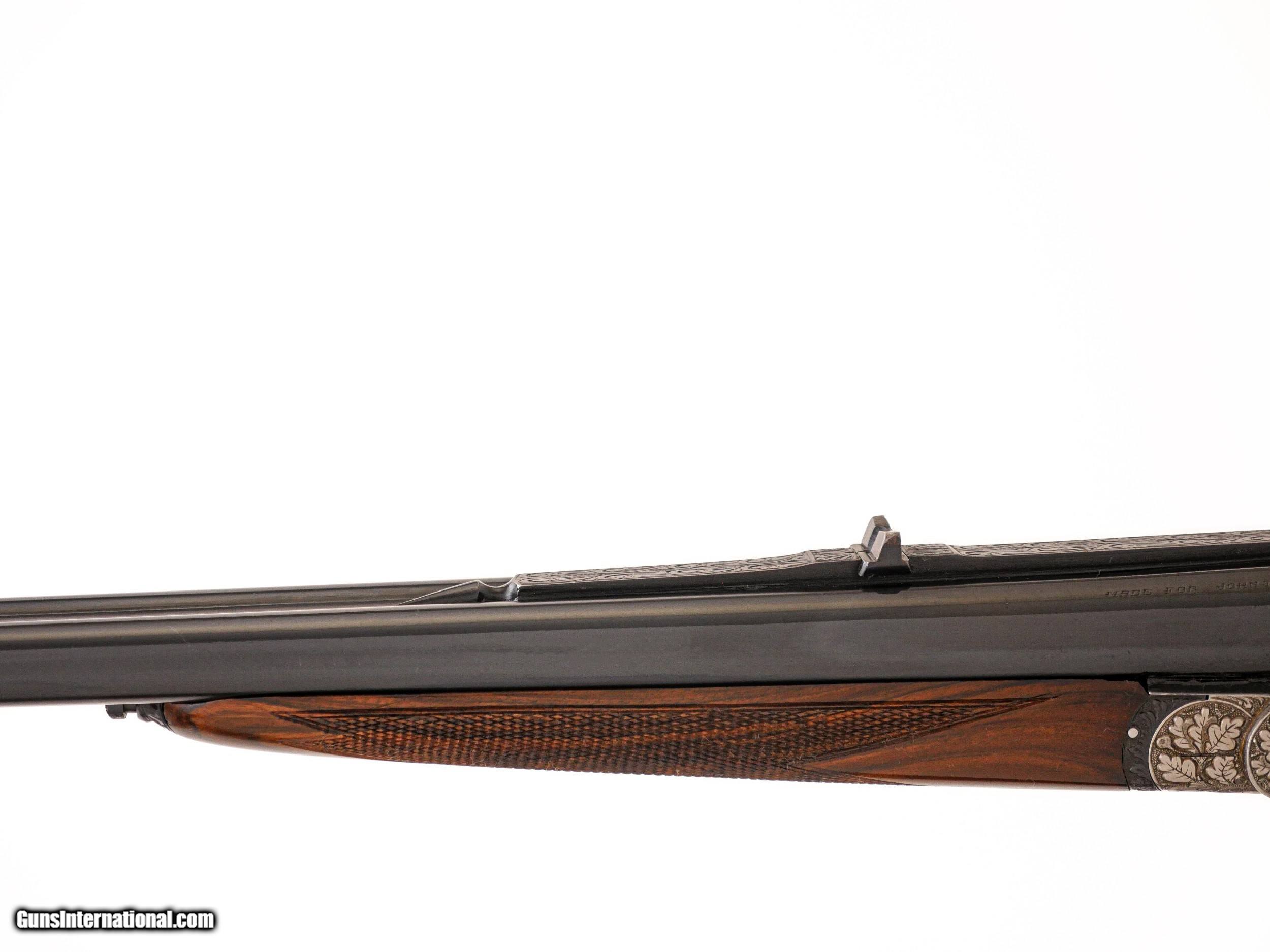 Description: Sarasqueta - John T. Amber's Full Sidelock Double Rifle, .375 H&H. 25 ¼” Barrels. Marked made for John T. Amber on barrels, pistol grip stock with cheekpiece, nicely figured walnut stock with drop points, thin recoil pad, full sidelock gun featuring hand detachable Holland & Holland style locks, the most spectacular relief engraving imaginable of stag, pheasant, wolf, rabbit, surrounded by full coverage oakleaf engraving over a coined finish, automatic ejectors, splinter forend, double trigger with the front being articulated, open sights, hidden 3rd fastener, full sidelock rifle with hand detachable locks, this gun was specially constructed by Sarasqueta for an extensive review in Gun Digest, hence, the level of engraving and workmanship on this double rifle is absolutely incredible, gun appears unused, and ideal gun for your next dangerous game hunt, John T. Amber was a legendary author of many classic books and editor of various magazines such as Gun Digest from the 1950’s to the late 1970’s, a once in a lifetime opportunity to own one of John Amber’s double rifles, of available for immediate delivery. Inv: 51093 8 lbs. 12 oz. 14" LOP $14,999.00 SOLD |