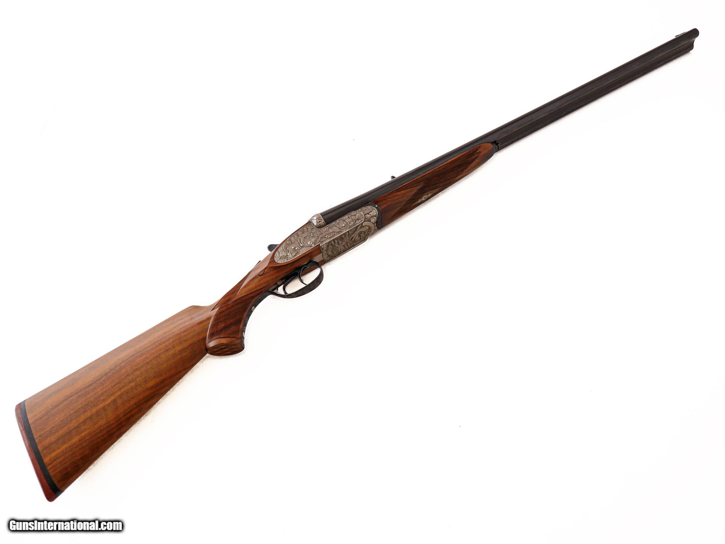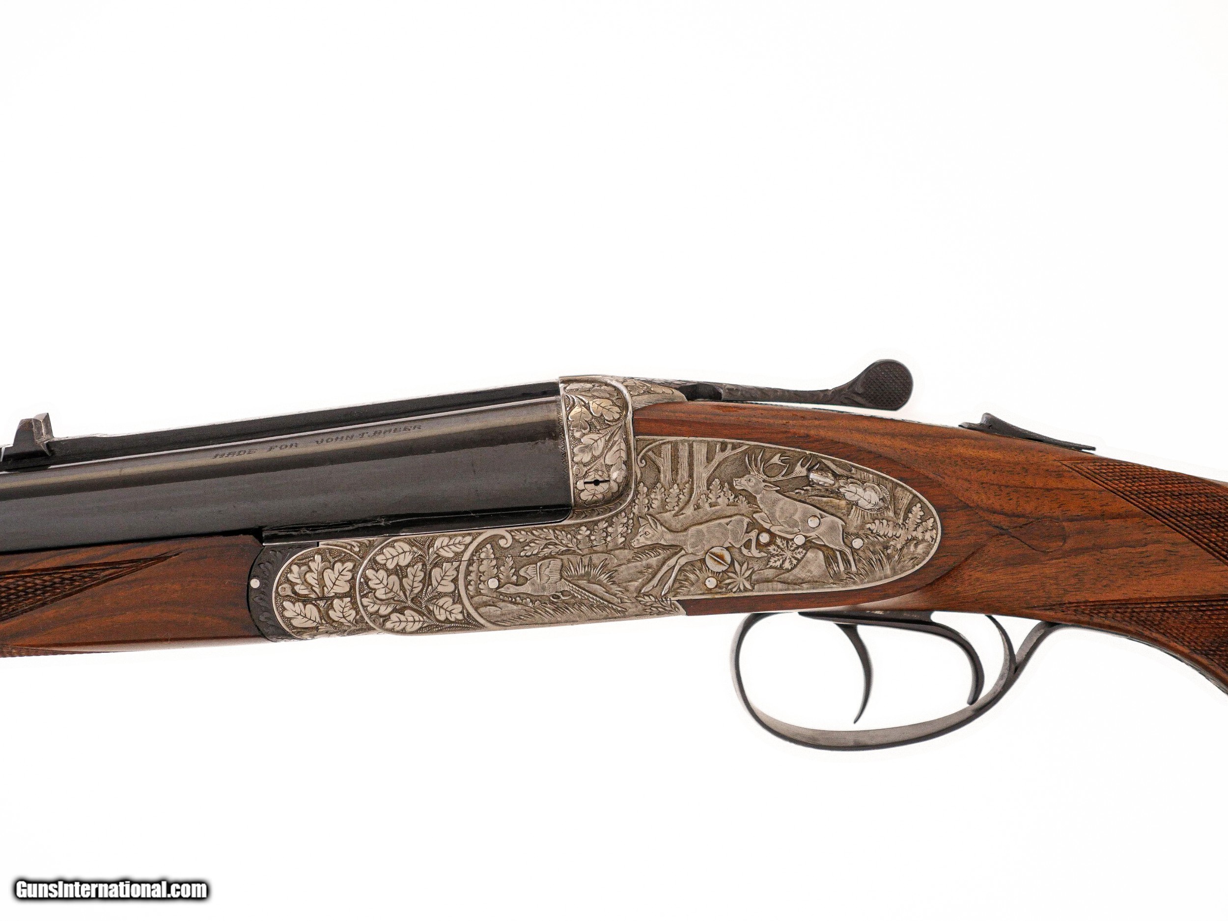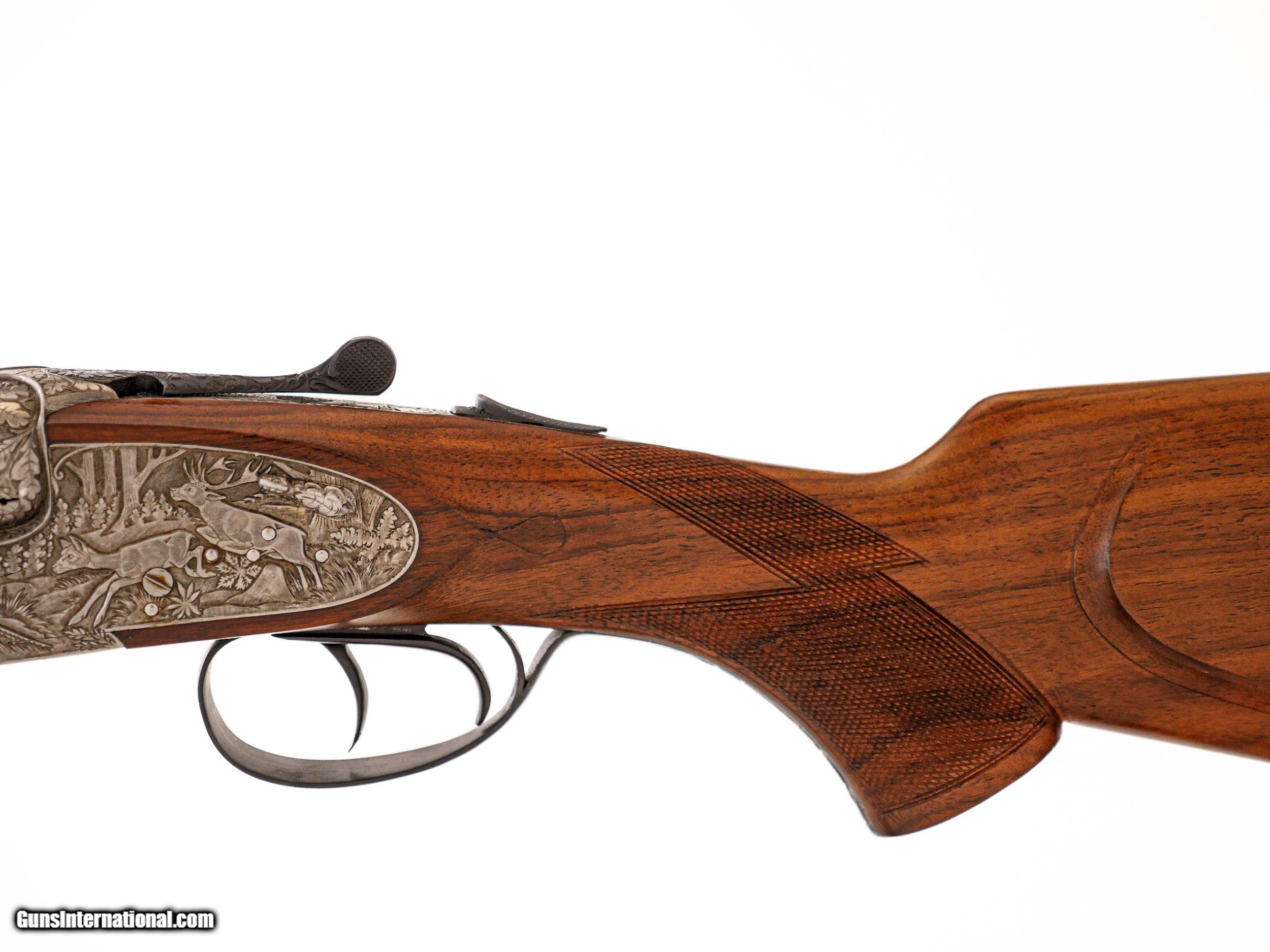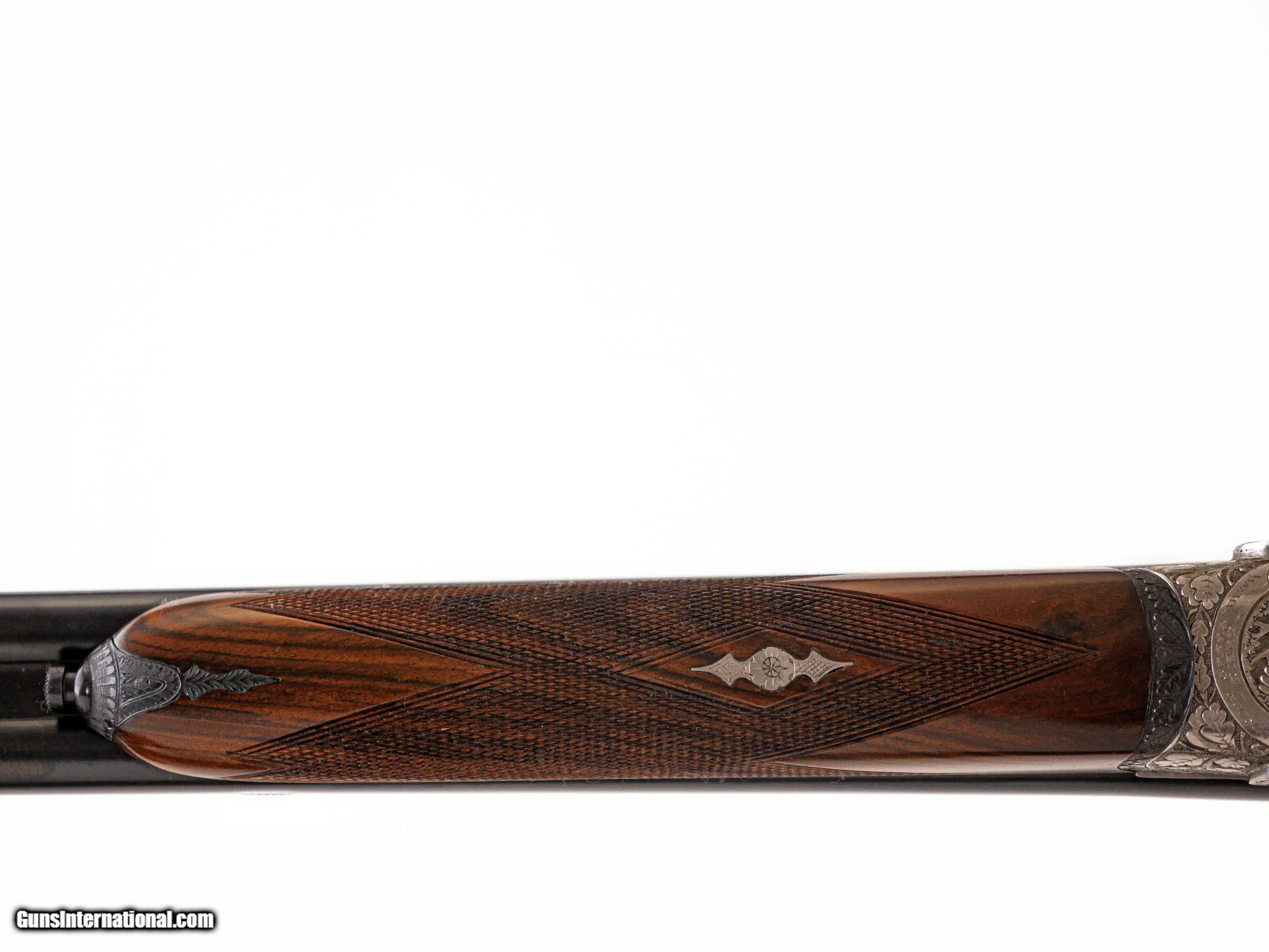 Description: Sarasqueta - John T. Amber's Full Sidelock Double Rifle, .375 H&H. 25 ¼” Barrels. Marked made for John T. Amber on barrels, pistol grip stock with cheekpiece, nicely figured walnut stock with drop points, thin recoil pad, full sidelock gun featuring hand detachable Holland & Holland style locks, the most spectacular relief engraving imaginable of stag, pheasant, wolf, rabbit, surrounded by full coverage oakleaf engraving over a coined finish, automatic ejectors, splinter forend, double trigger with the front being articulated, open sights, hidden 3rd fastener, full sidelock rifle with hand detachable locks, this gun was specially constructed by Sarasqueta for an extensive review in Gun Digest, hence, the level of engraving and workmanship on this double rifle is absolutely incredible, gun appears unused, and ideal gun for your next dangerous game hunt, John T. Amber was a legendary author of many classic books and editor of various magazines such as Gun Digest from the 1950’s to the late 1970’s, a once in a lifetime opportunity to own one of John Amber’s double rifles, of available for immediate delivery. Inv: 51093 8 lbs. 12 oz. 14" LOP $14,999.00 SOLD |