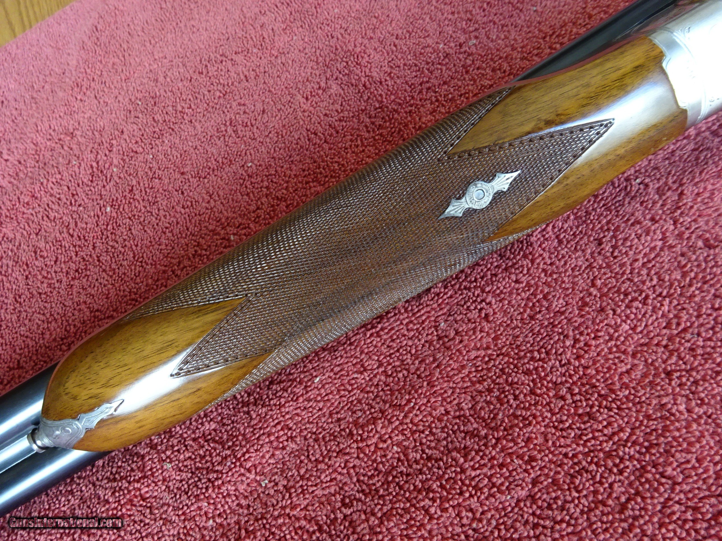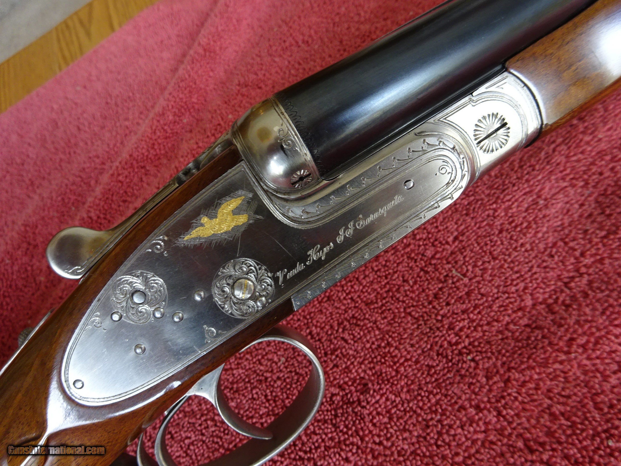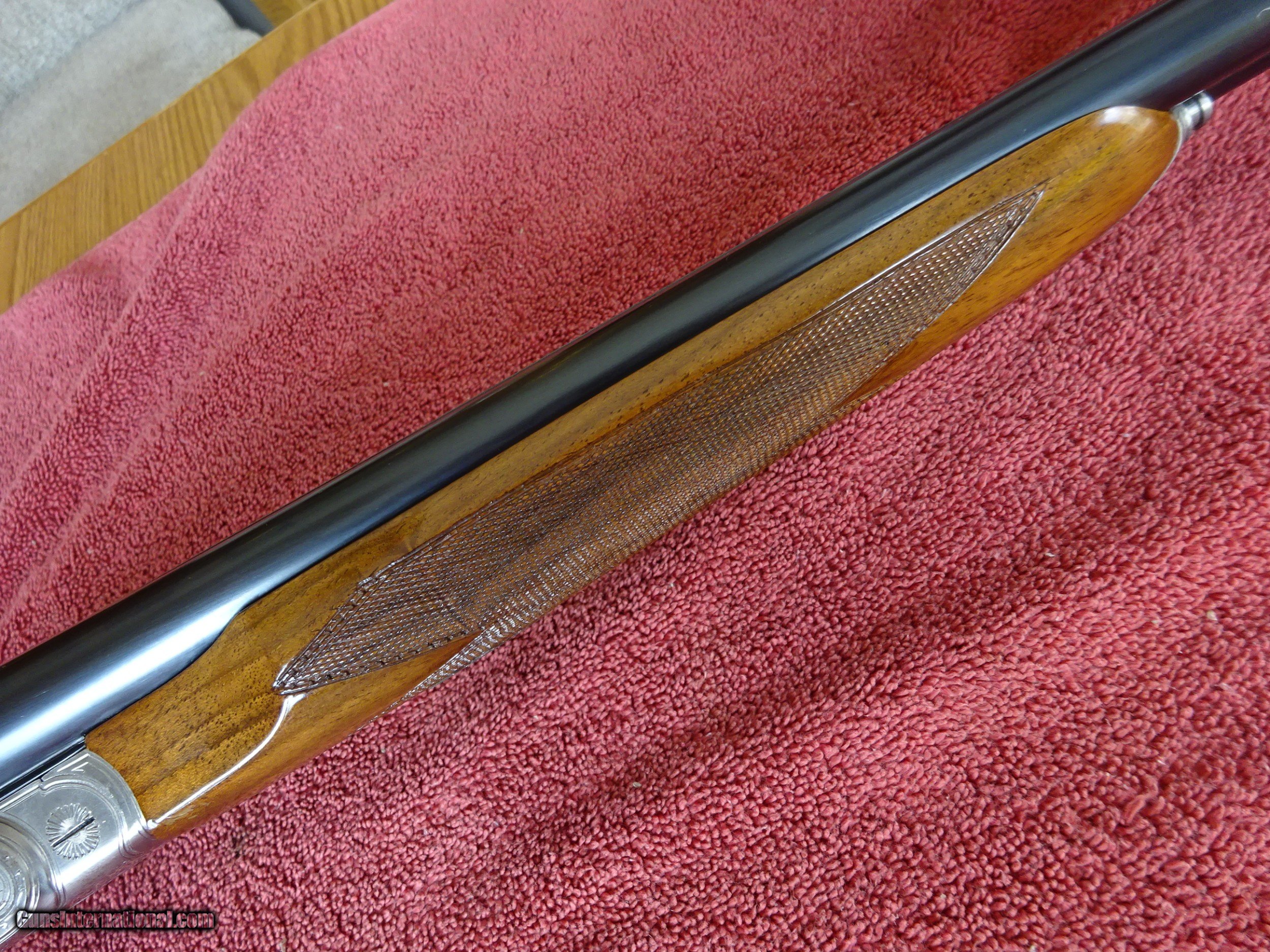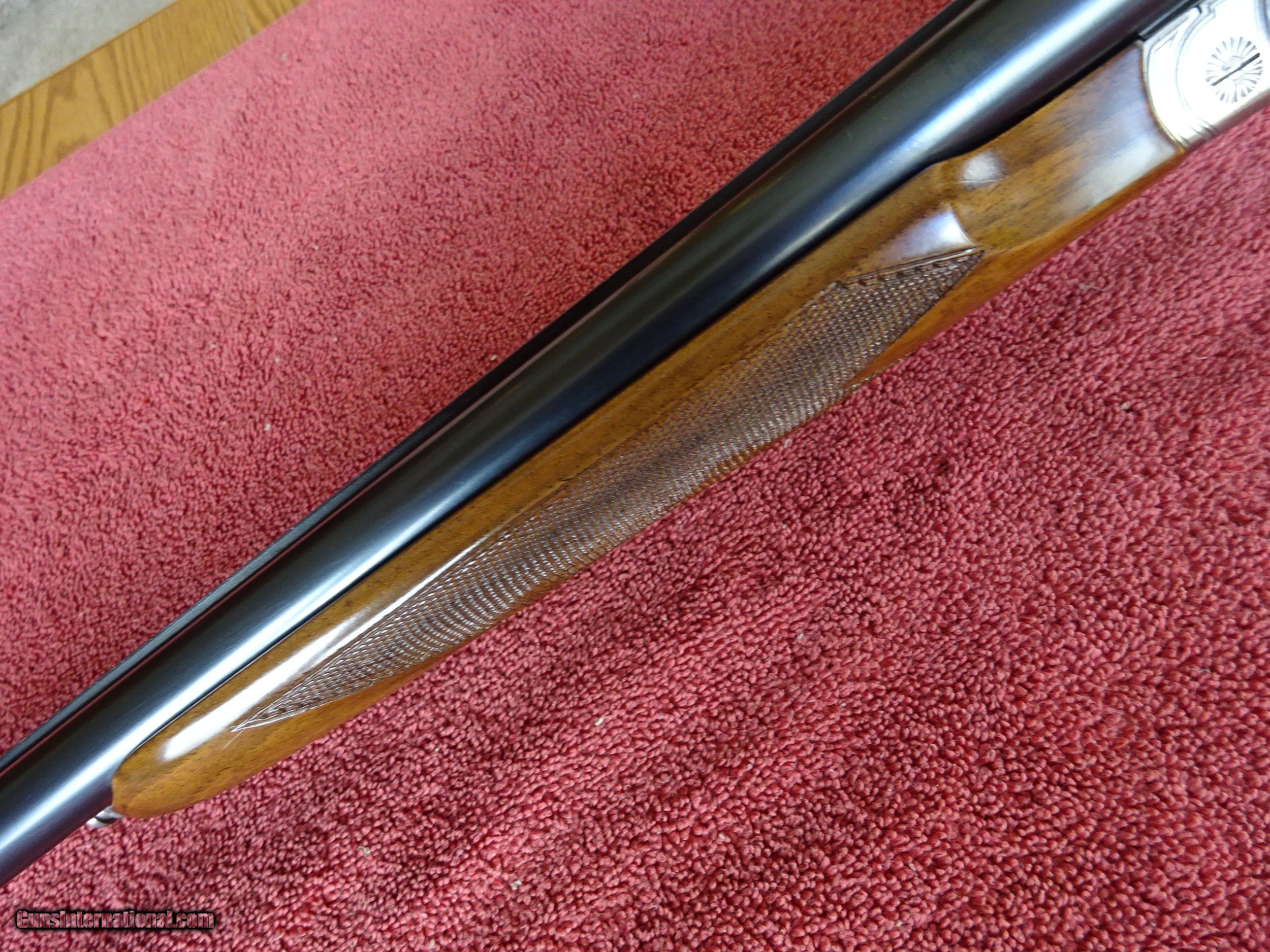 Description: SARASQUETA, MODEL 1882 E LUXE, EIBAR SPAIN, 20 GAUGE. 26" BARRELS, 100% BLUE, MIRROR PERFECT BORES, MODIFIED AND IMP. MODIFIED (.010 & .015), 3" CHAMBERS, AUTOMATIC EJECTORS, SINGLE BRASS SIGHT, MATTED RIB. SIDEPLATES HAVE LIGHT SCROLL ENGRAVING, GOLD PIGEONS IN FLIGHT. TOP LEVER, TRIGGERGUARD, FOREARM IRON AND SCREWS ALL ENGRAVED AND HAVE A COIN FINISH. STRAIGHT GRIP STOCK WITH BOLD TEARDROPS, BEAVERTAIL FOREARM, EUROPEAN WALNUT, VERY FINE CUT CHECKERING WITH AN INTERESTING BORDER. SILVER OVAL STOCK INLAY (NOT ENGRAVED). WOOD AND CHECKERING IS NEAR PERFECT, 1 1/2" X 2 1/2" X 14 7/8", 3/4" VENTED PAD. 6 POUNDS 2 OUNCES. THE GUN IS TIGHT AS NEW, STIFF TO OPEN. APPEARS LITTLE USED. DISCONTINUED IN 1984. A LOT OF GUN FOR THE MONEY. $1375.00 + $50.00 Insured shipping to an FFL address. See all Pats gun listings on this site! We also have hundreds of pieces of ORIGINAL gun company advertising & memorabilia available for sale on our site SPORTINGCOLLECTIBLES. We have no reprints or reproductions. Email for more information. SOLD |