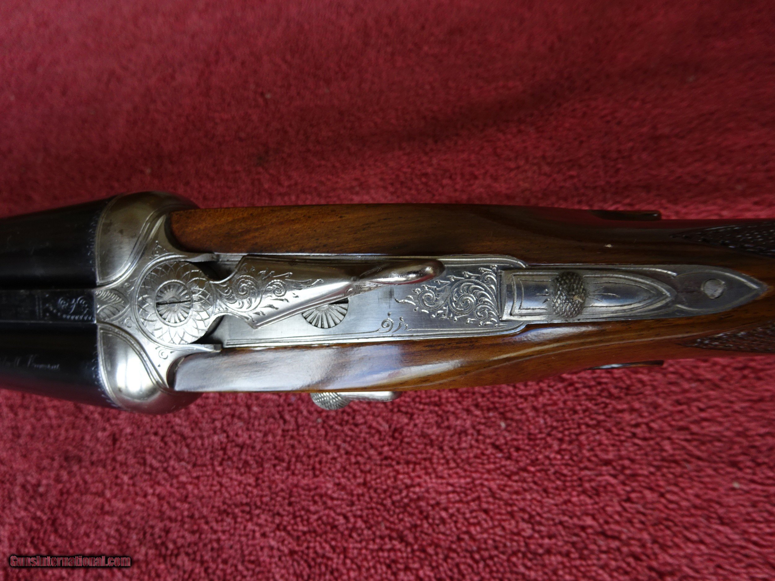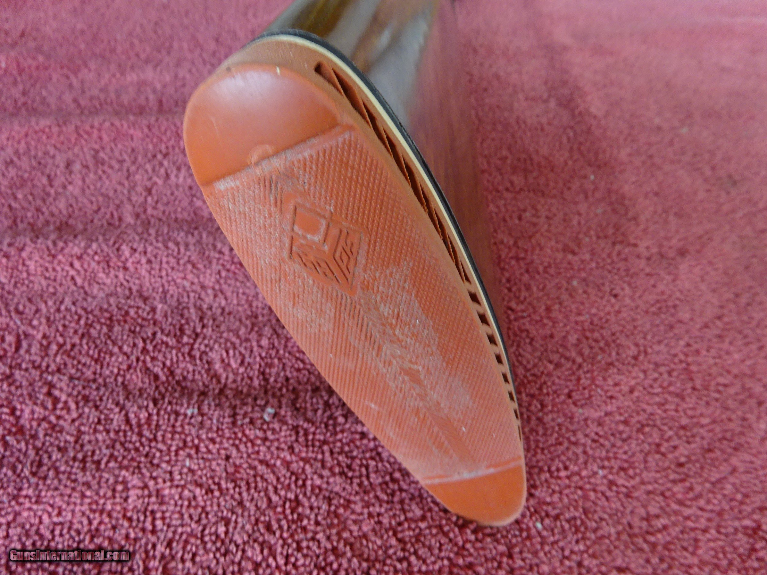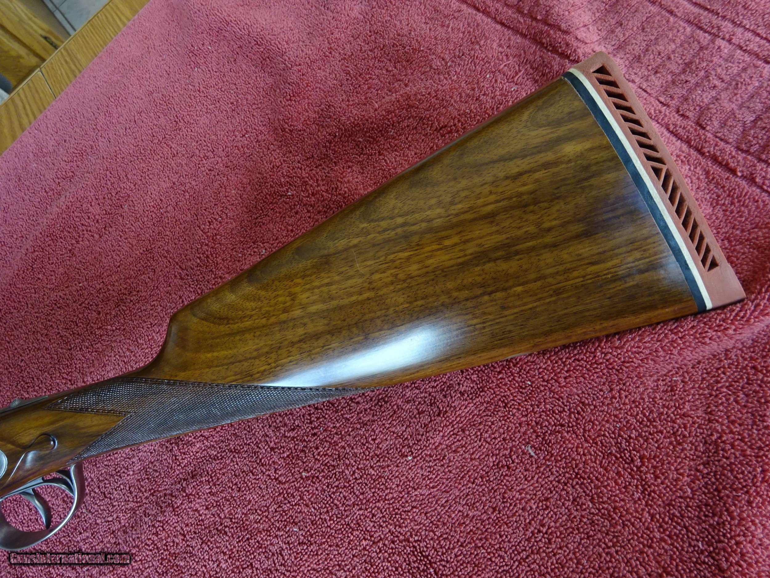 Description: SARASQUETA, MODEL 1882 E LUXE, EIBAR SPAIN, 20 GAUGE. 26" BARRELS, 100% BLUE, MIRROR PERFECT BORES, MODIFIED AND IMP. MODIFIED (.010 & .015), 3" CHAMBERS, AUTOMATIC EJECTORS, SINGLE BRASS SIGHT, MATTED RIB. SIDEPLATES HAVE LIGHT SCROLL ENGRAVING, GOLD PIGEONS IN FLIGHT. TOP LEVER, TRIGGERGUARD, FOREARM IRON AND SCREWS ALL ENGRAVED AND HAVE A COIN FINISH. STRAIGHT GRIP STOCK WITH BOLD TEARDROPS, BEAVERTAIL FOREARM, EUROPEAN WALNUT, VERY FINE CUT CHECKERING WITH AN INTERESTING BORDER. SILVER OVAL STOCK INLAY (NOT ENGRAVED). WOOD AND CHECKERING IS NEAR PERFECT, 1 1/2" X 2 1/2" X 14 7/8", 3/4" VENTED PAD. 6 POUNDS 2 OUNCES. THE GUN IS TIGHT AS NEW, STIFF TO OPEN. APPEARS LITTLE USED. DISCONTINUED IN 1984. A LOT OF GUN FOR THE MONEY. $1375.00 + $50.00 Insured shipping to an FFL address. See all Pats gun listings on this site! We also have hundreds of pieces of ORIGINAL gun company advertising & memorabilia available for sale on our site SPORTINGCOLLECTIBLES. We have no reprints or reproductions. Email for more information. SOLD |
