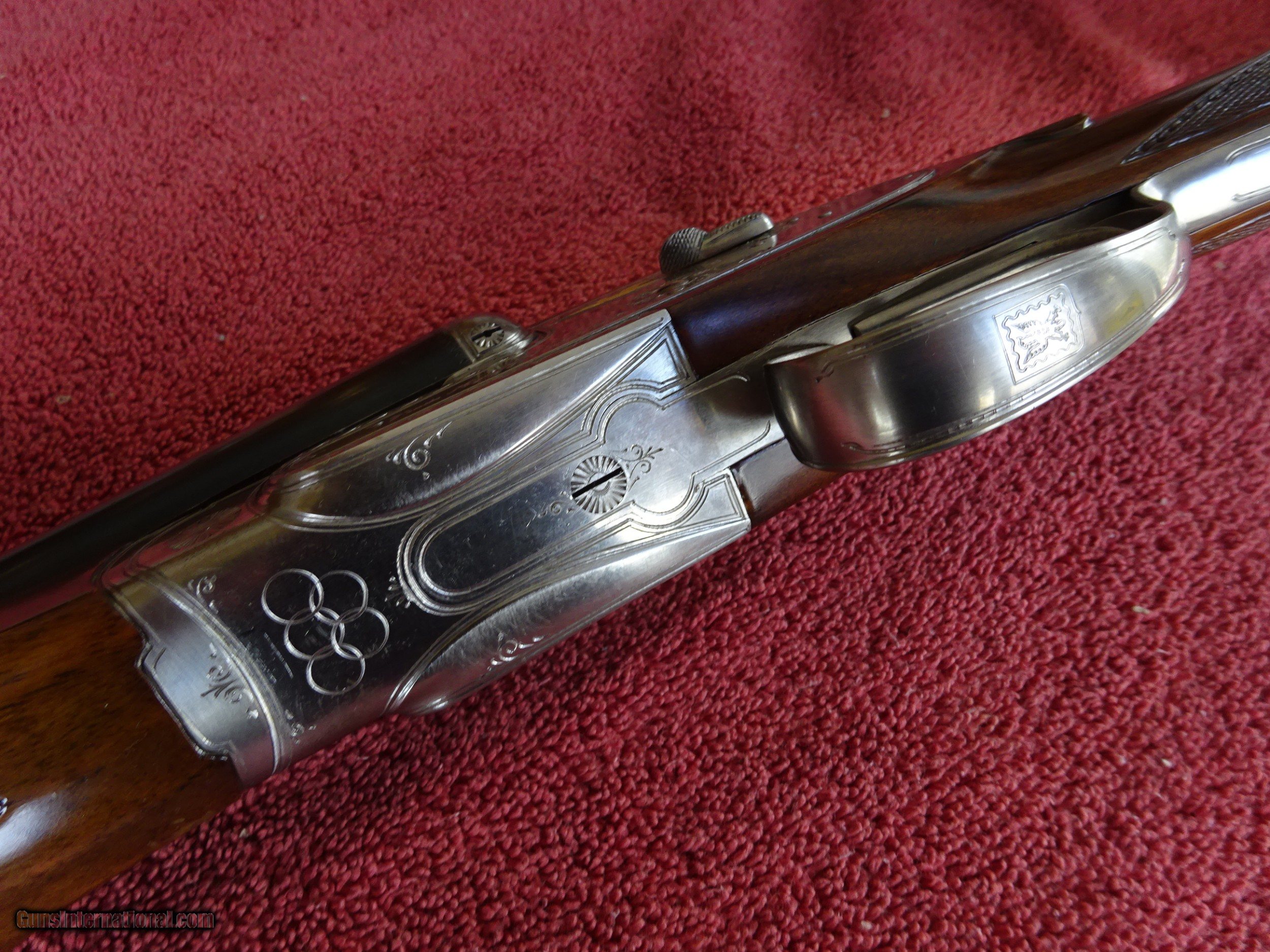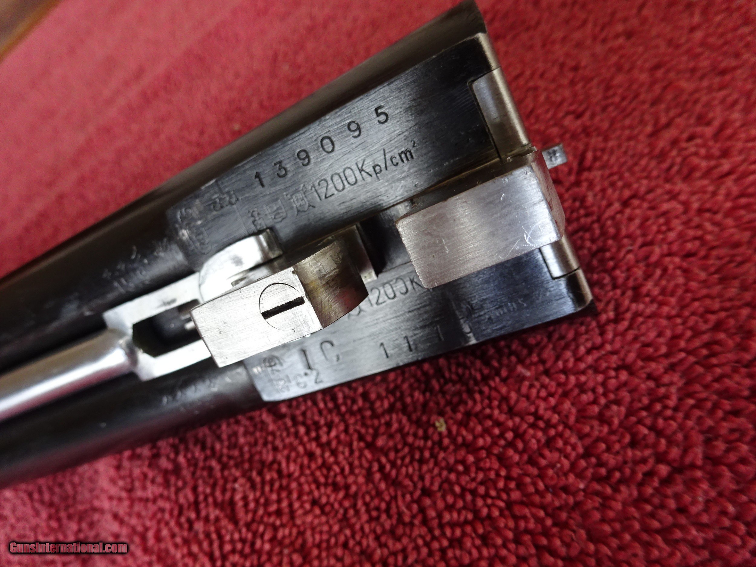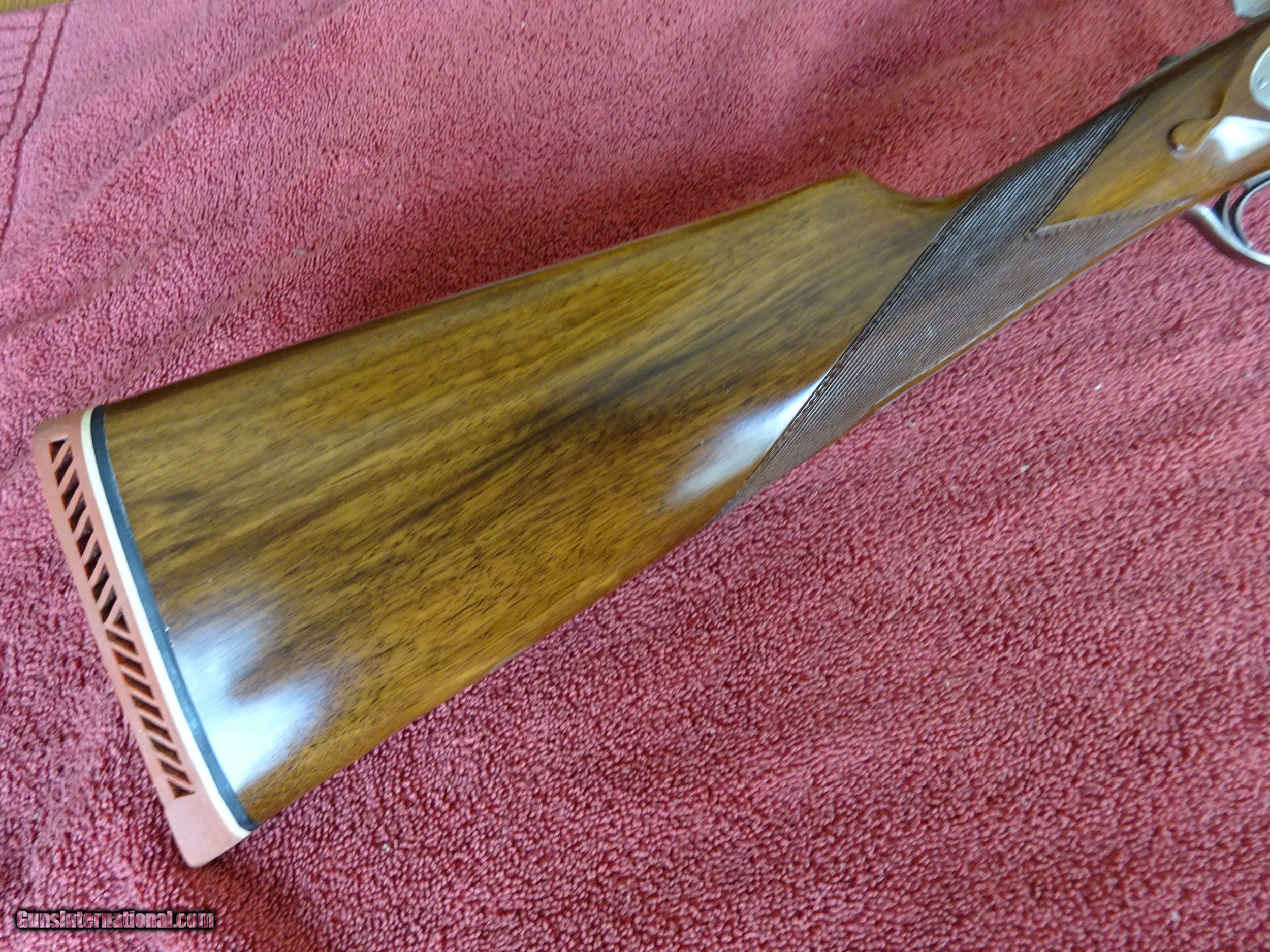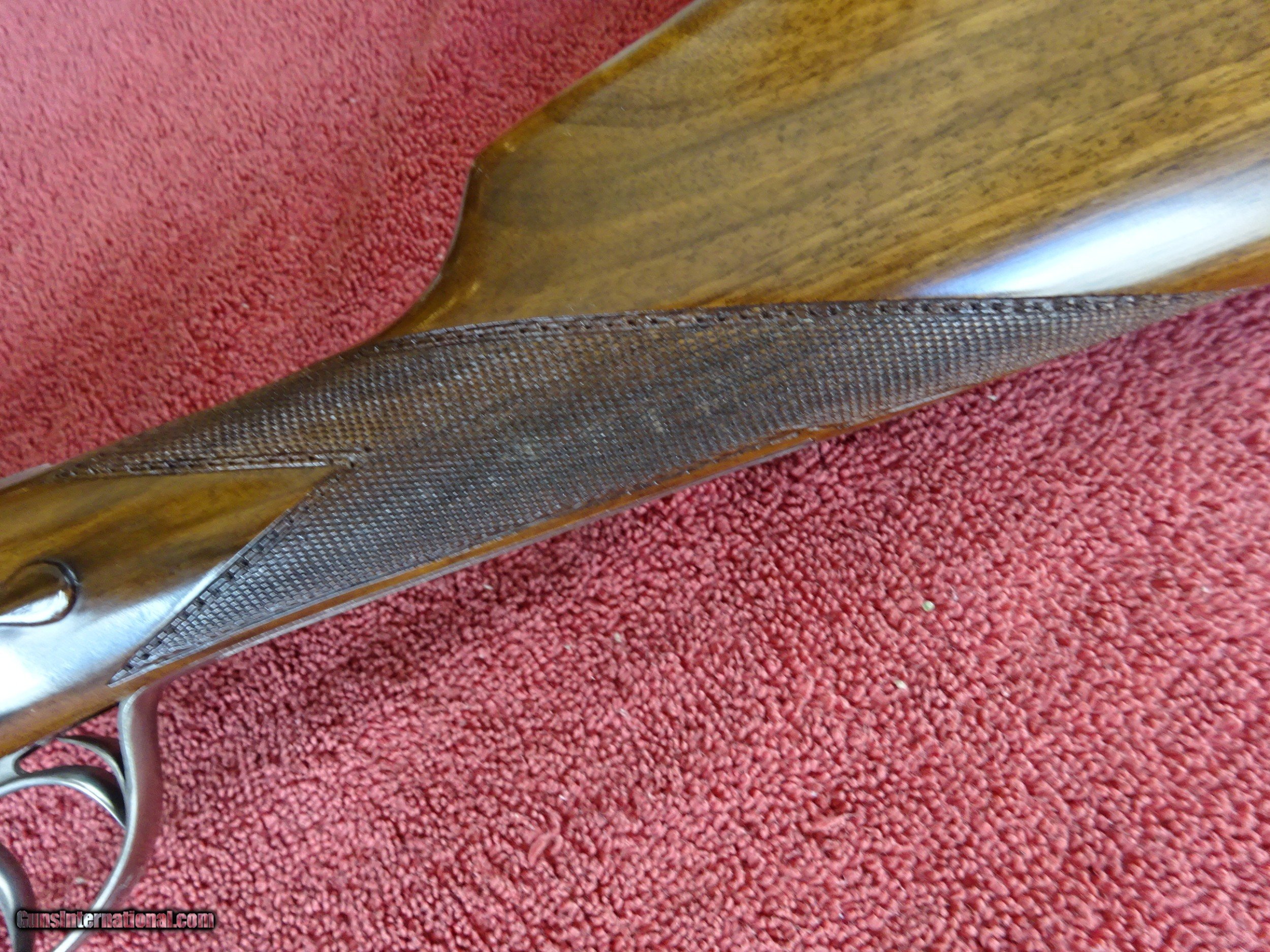 Description: SARASQUETA, MODEL 1882 E LUXE, EIBAR SPAIN, 20 GAUGE. 26" BARRELS, 100% BLUE, MIRROR PERFECT BORES, MODIFIED AND IMP. MODIFIED (.010 & .015), 3" CHAMBERS, AUTOMATIC EJECTORS, SINGLE BRASS SIGHT, MATTED RIB. SIDEPLATES HAVE LIGHT SCROLL ENGRAVING, GOLD PIGEONS IN FLIGHT. TOP LEVER, TRIGGERGUARD, FOREARM IRON AND SCREWS ALL ENGRAVED AND HAVE A COIN FINISH. STRAIGHT GRIP STOCK WITH BOLD TEARDROPS, BEAVERTAIL FOREARM, EUROPEAN WALNUT, VERY FINE CUT CHECKERING WITH AN INTERESTING BORDER. SILVER OVAL STOCK INLAY (NOT ENGRAVED). WOOD AND CHECKERING IS NEAR PERFECT, 1 1/2" X 2 1/2" X 14 7/8", 3/4" VENTED PAD. 6 POUNDS 2 OUNCES. THE GUN IS TIGHT AS NEW, STIFF TO OPEN. APPEARS LITTLE USED. DISCONTINUED IN 1984. A LOT OF GUN FOR THE MONEY. $1375.00 + $50.00 Insured shipping to an FFL address. See all Pats gun listings on this site! We also have hundreds of pieces of ORIGINAL gun company advertising & memorabilia available for sale on our site SPORTINGCOLLECTIBLES. We have no reprints or reproductions. Email for more information. SOLD |