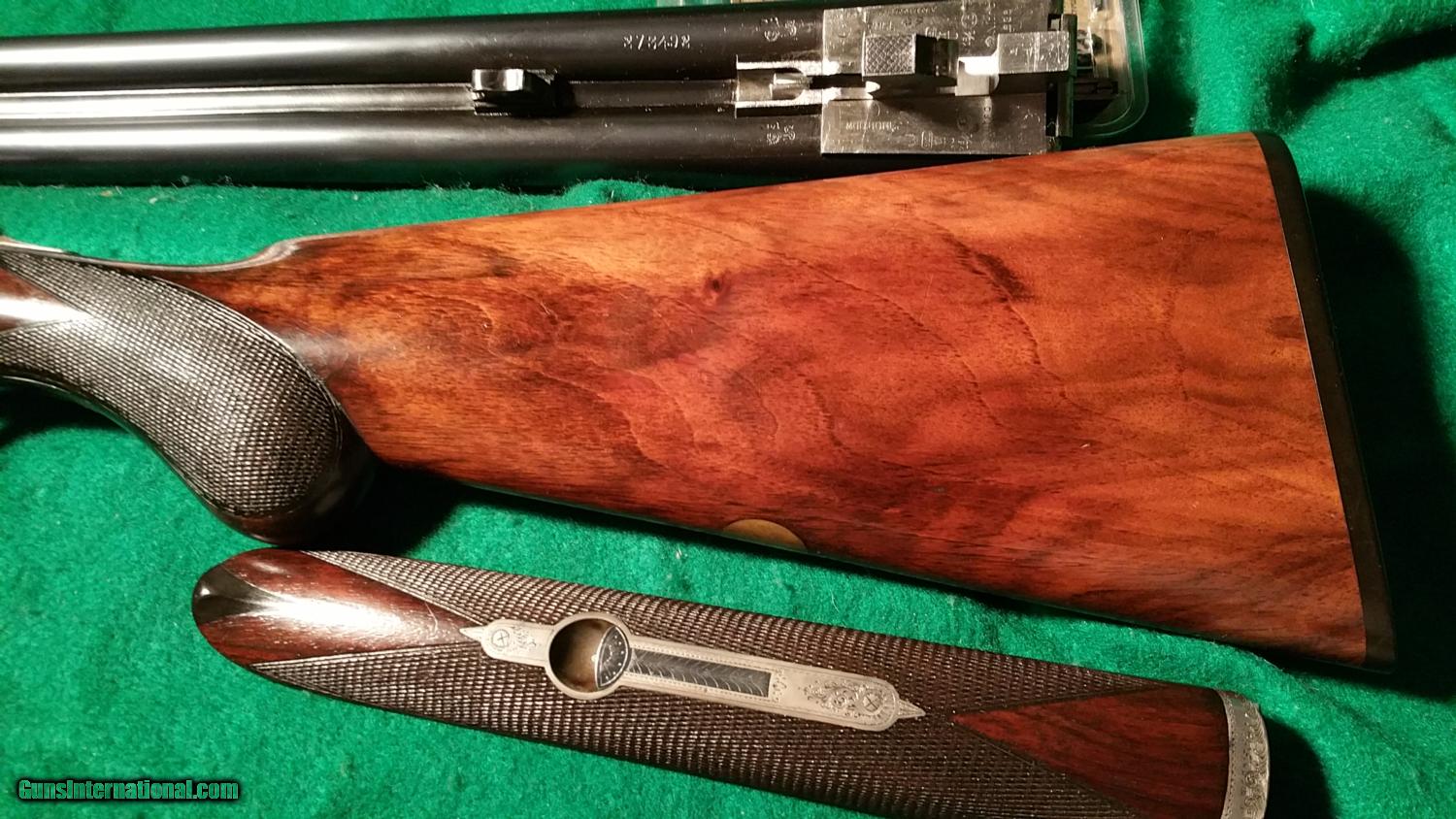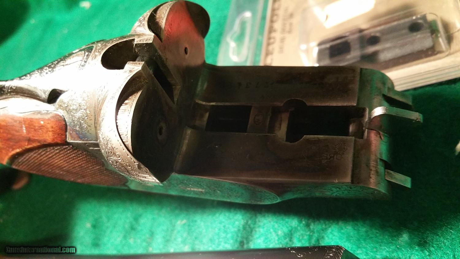 Description: Sauer Model 300E - 16GA, 2 3/4 chambers. Importer by AF NY, made in 1935, ejectors. 28" barrels, IC&MOD. Full cover fine english scroll engraving with a 100% color case. Action with interceptor sear and doll head extension. 6lb 1oz, LOP 14 1/4, 1 1/2 x 2 3/4 aprox. Gun is in original condition. This gun belonged once to Prince David Vatchnadze, I have documentation. This action is the same as the Model 40E or any prussina grade. $5900.00 plus $30.00 shiping. For more information call Rick at 973-478-5066. SOLD |