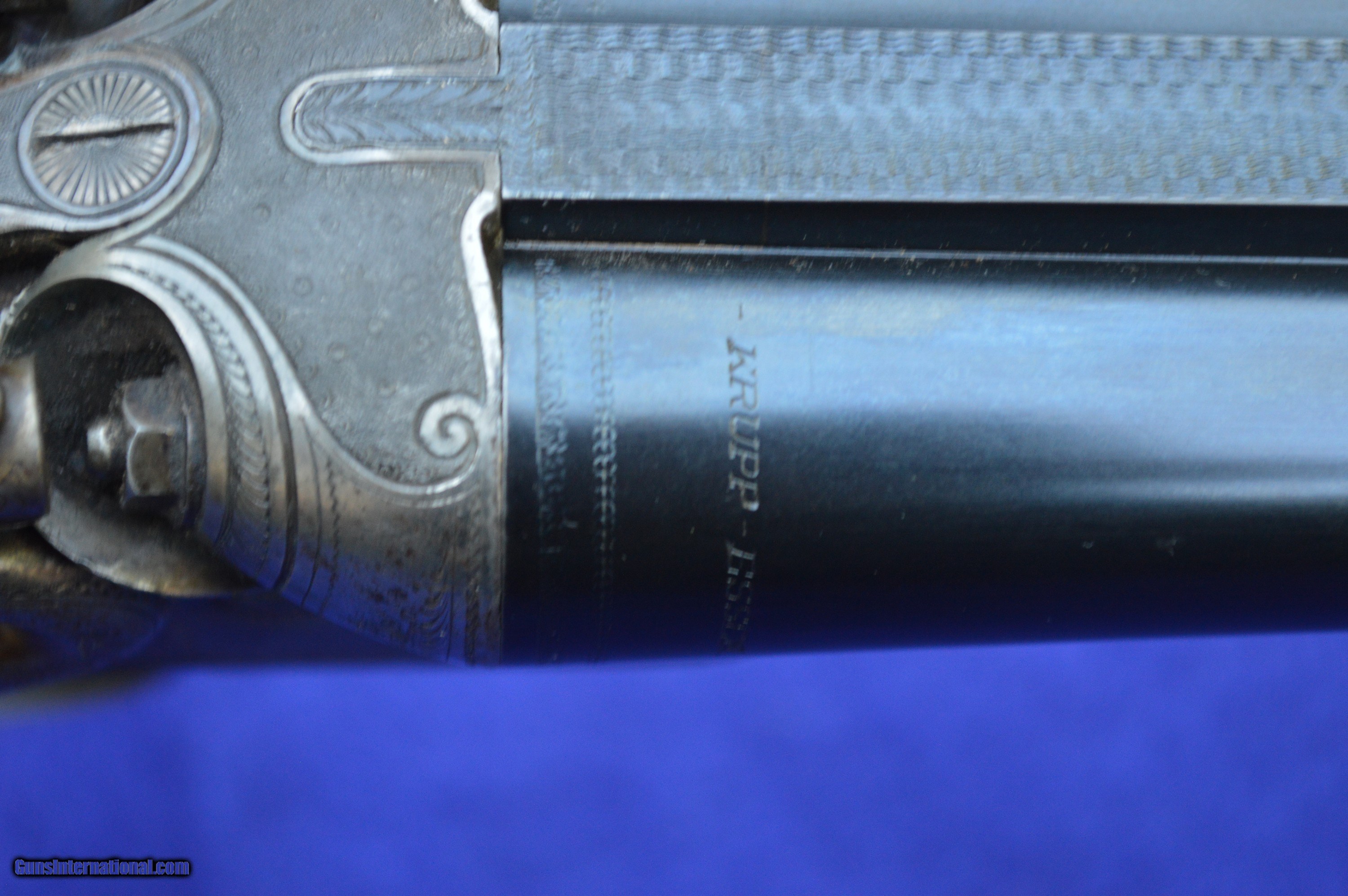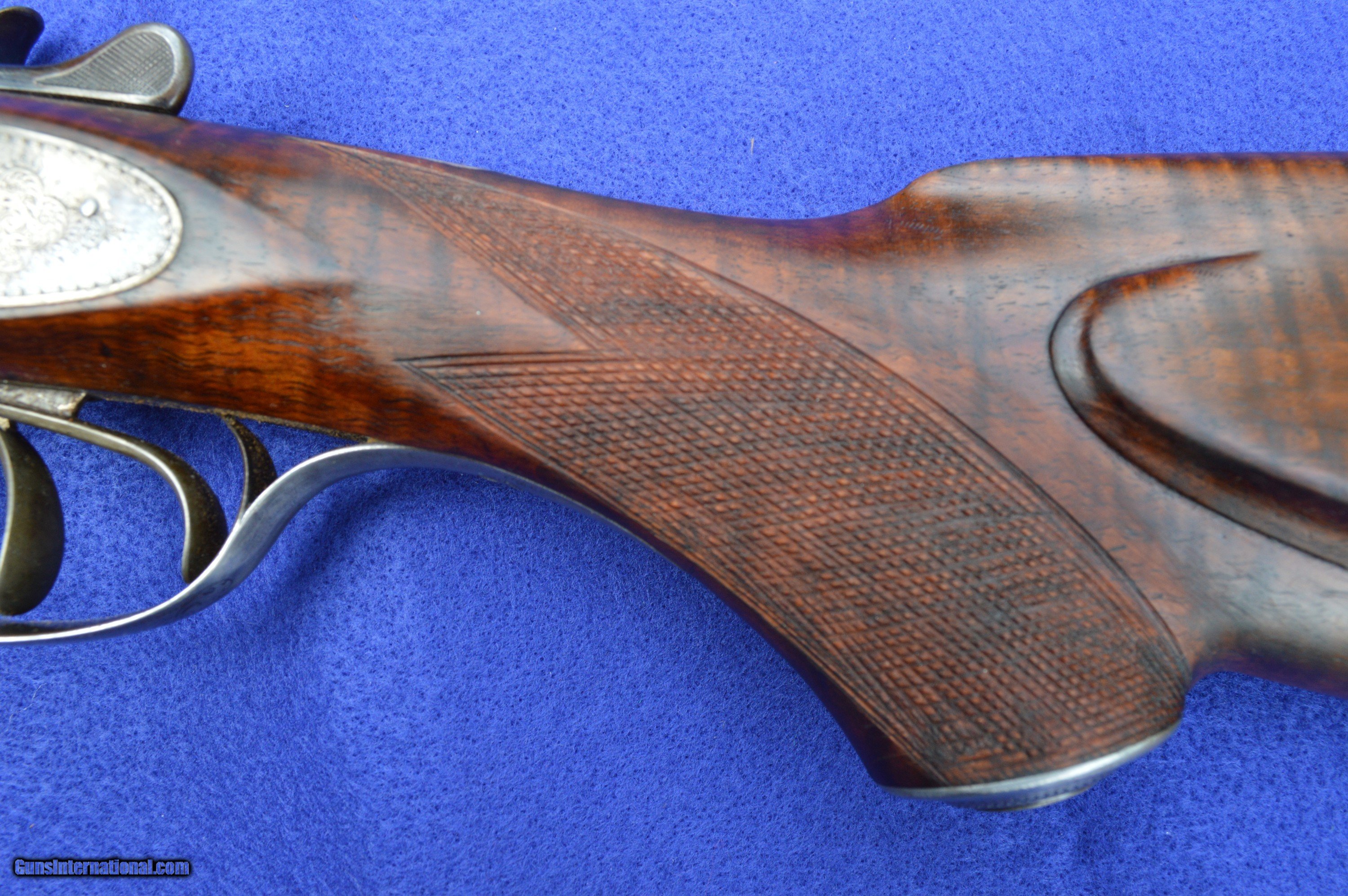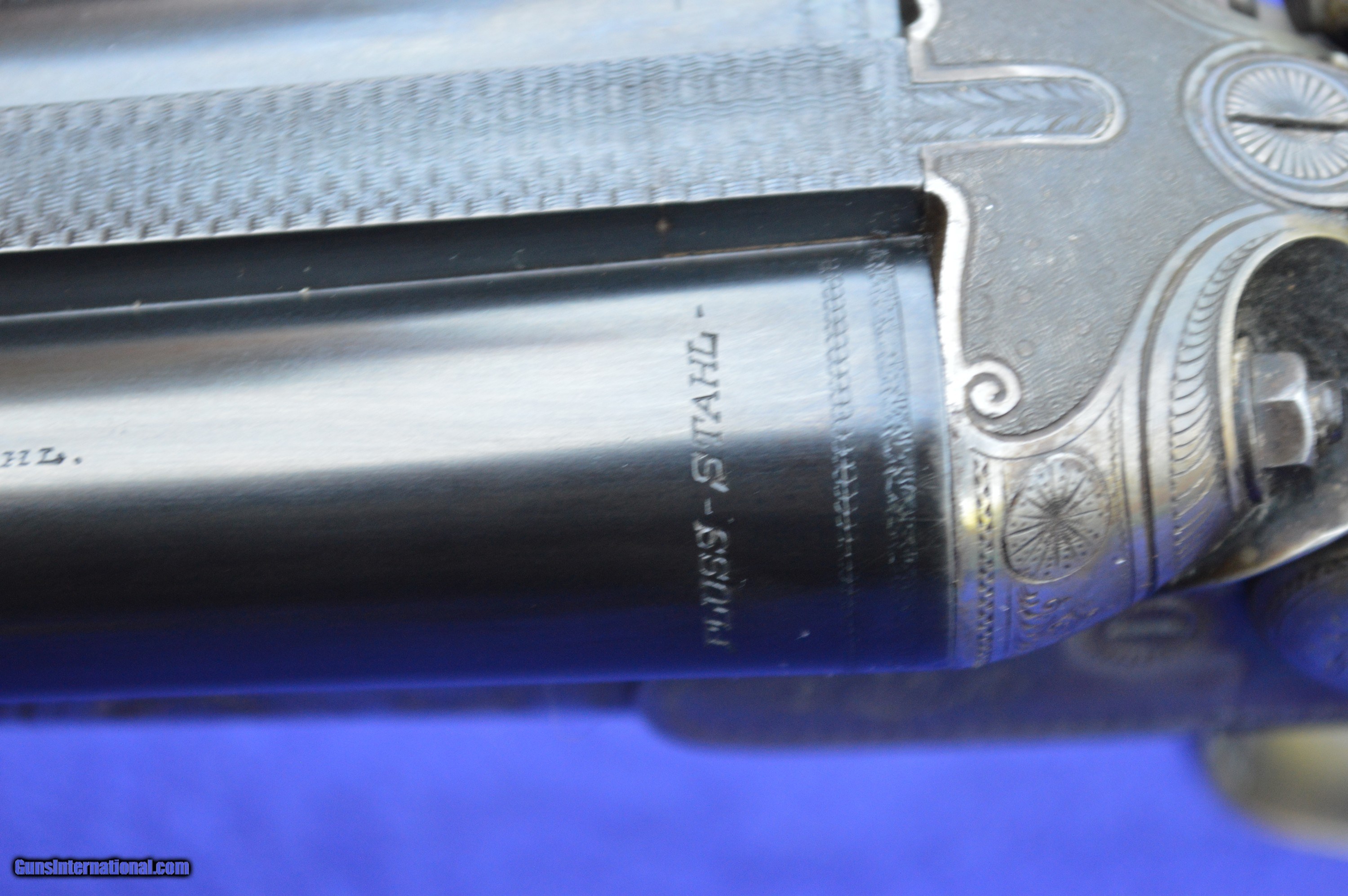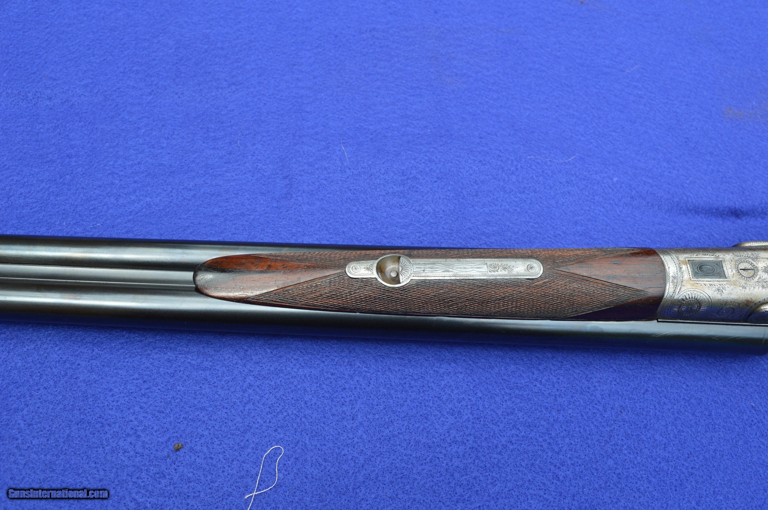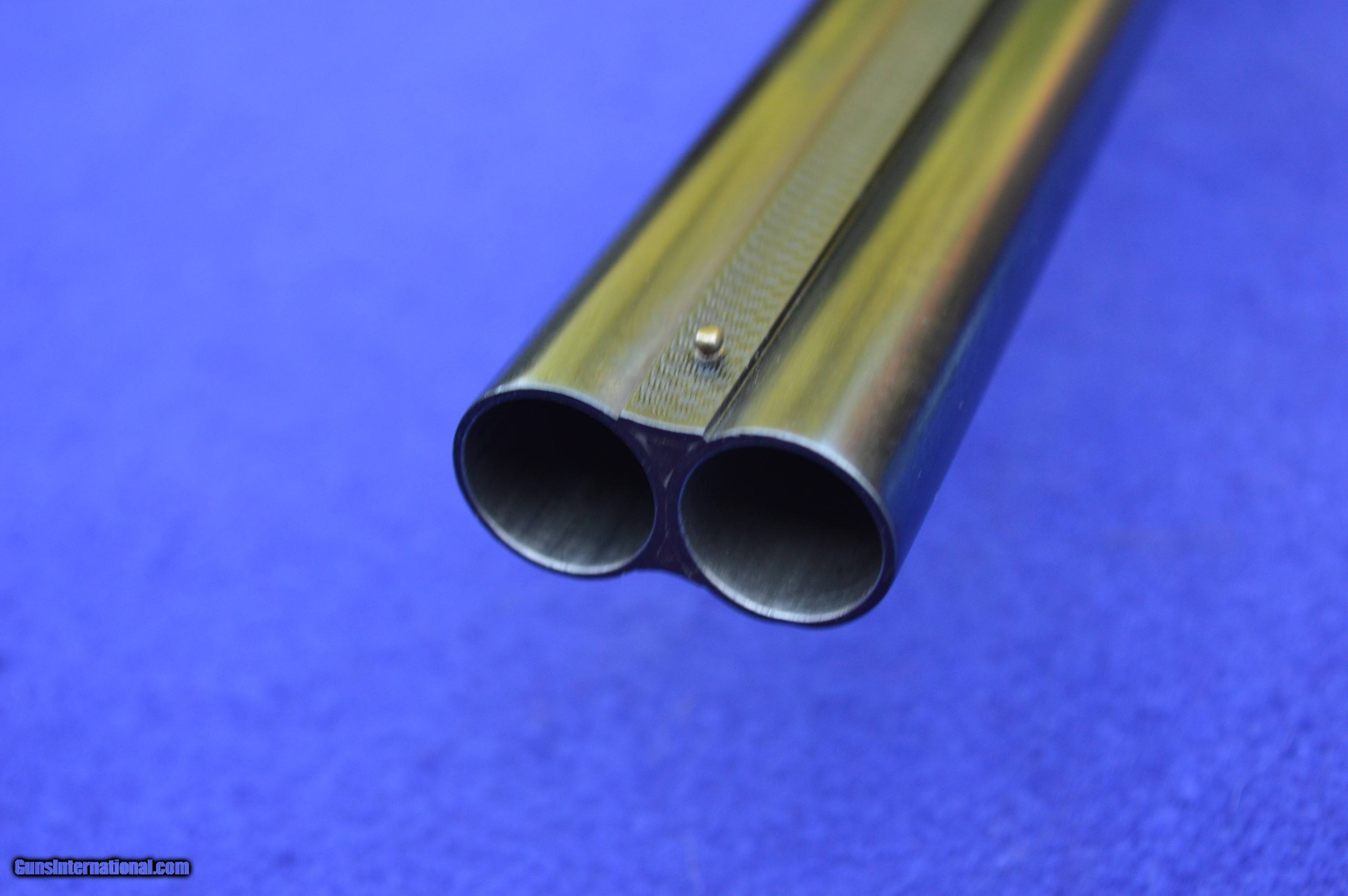 Description: A high-condition, graded J.P. Sauer 16-gauge hammergun with fluid steel barrels is rare. Sauer built some guns for the American market in the early 20th century, primarily field grade guns. However, a well-engraved hammergun with metric barrel dimensions and a Circasian walnut stock, such as this gun, probably came to the US with a returning WWII veteran. The side-lock action is a beautiful piece of machinery with each part precisely milled and hand fitted. The condition of the wood is excellent, behind the side locks as well as what it visible. The checking is good, as cleaned. The receiver retains significant case color and the engraving is crisp. The bores of the 75cm Krupp fluid steel barrels are bright and the exteriors of the barrels are flawless as refinished. Other signs of quality include a nicely engraved steel grip cap, Greener cross-bolt, and the detailing of the top rib. This gun weighs only 6 pounds 6 ounces and has modern shooting dimensions. The chambers are 65mm (2-5/8”). The right barrel is choked LM (.009) and the left IM (.017). The diameters of both bores 9” from the breech are .669, and the outside diameters of both barrels at the muzzle are .750. The wall thicknesses of the right barrels at 9” from the muzzle are .034/.035/.033 (top/side/bottom), and at the middle of the barrel are .037/.040/.042. The wall thicknesses of the left barrel are .030/.032/.035 and .035/.037/.040. respectively. This level of precision reflects the original quality of German manufacturing and suggests subsequent limited use. The drop at the comb is 1-3/4” and at the heel 2-5/8”. The length of pull to the horn buttplate is 13-3/4”. The triggers both pull at 5 pounds. The gun locks up tight. All serial numbers, 111202, match. The price does not include shipping costs paid by buyer. The inspection period is 7 days from receipt. This shotgun has been fired on the range on a number of occasions using standard target loads. However, as for any antique or vintage shotgun, it is recommended that the new owner have it inspected by his or her own gunsmith before firing. The gun carries a 30-day warranty, during which Doublegun Preservation, LLC will have any mechanical problems documented by a professional gunsmith repaired or accept the return of the gun and refund the price of the gun and all shipping costs. Please do not hesitate to call with questions Stephen Wesbrook at 703-625-4830. SOLD Curio/Relic: Yes |