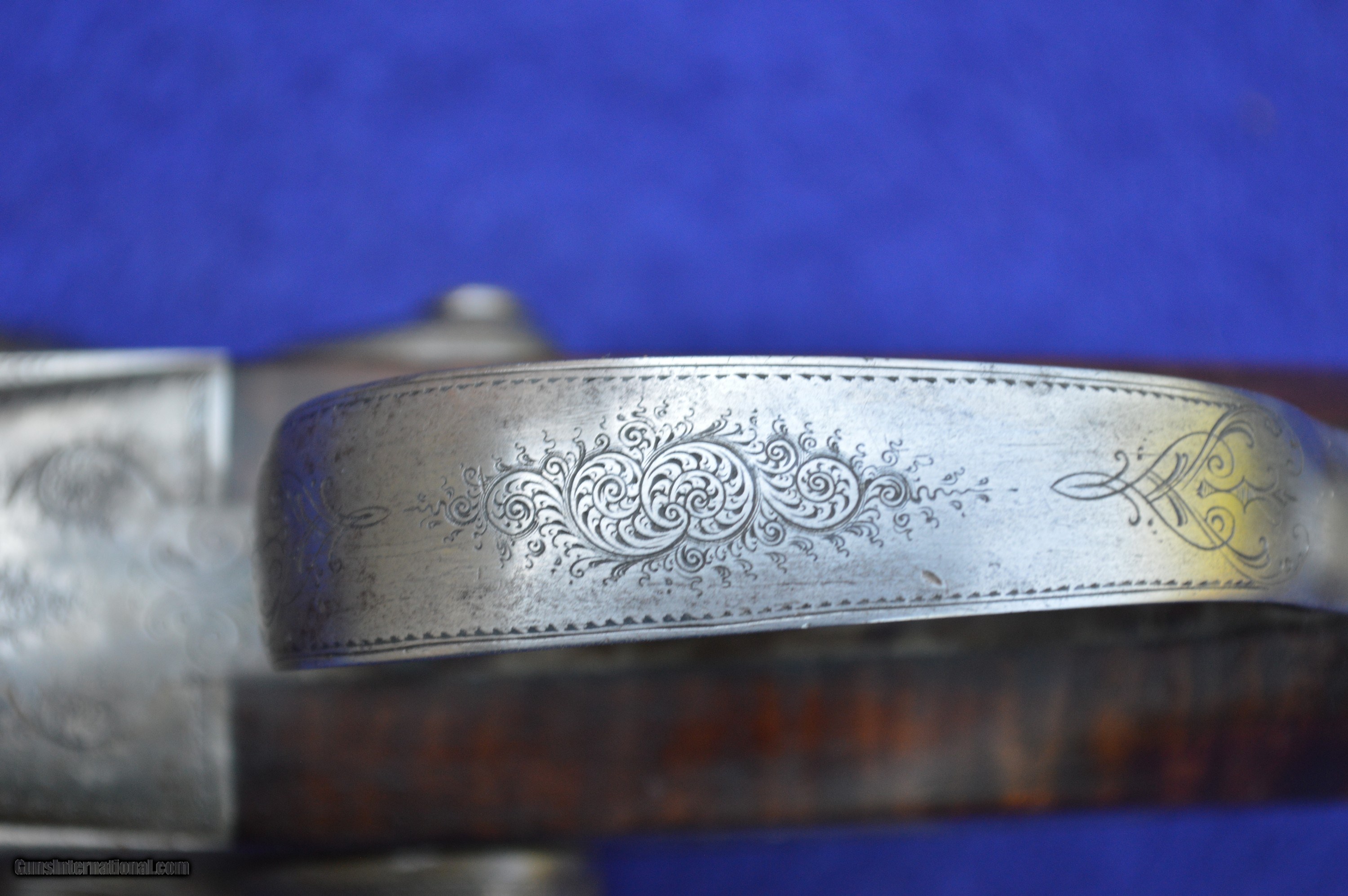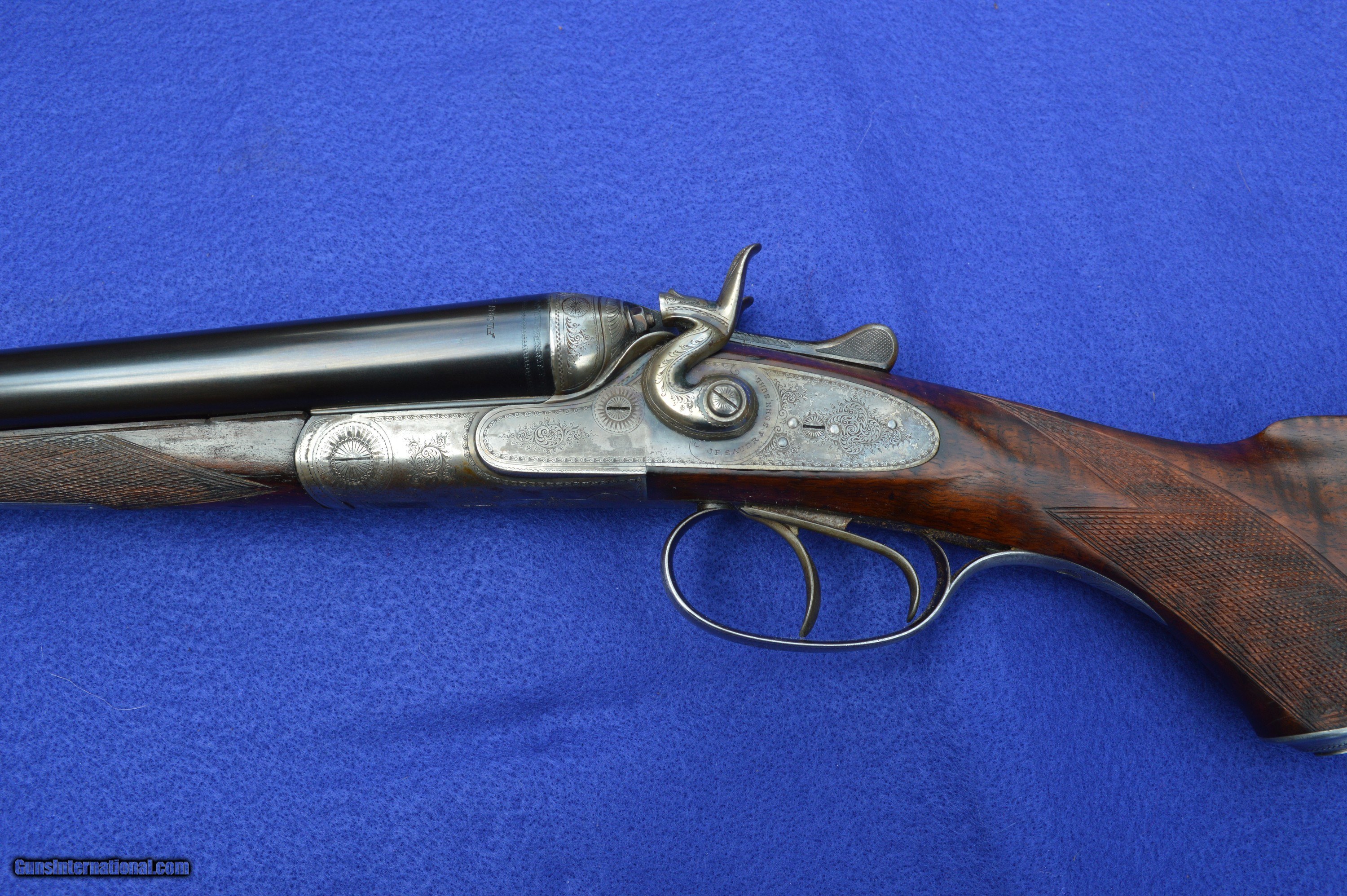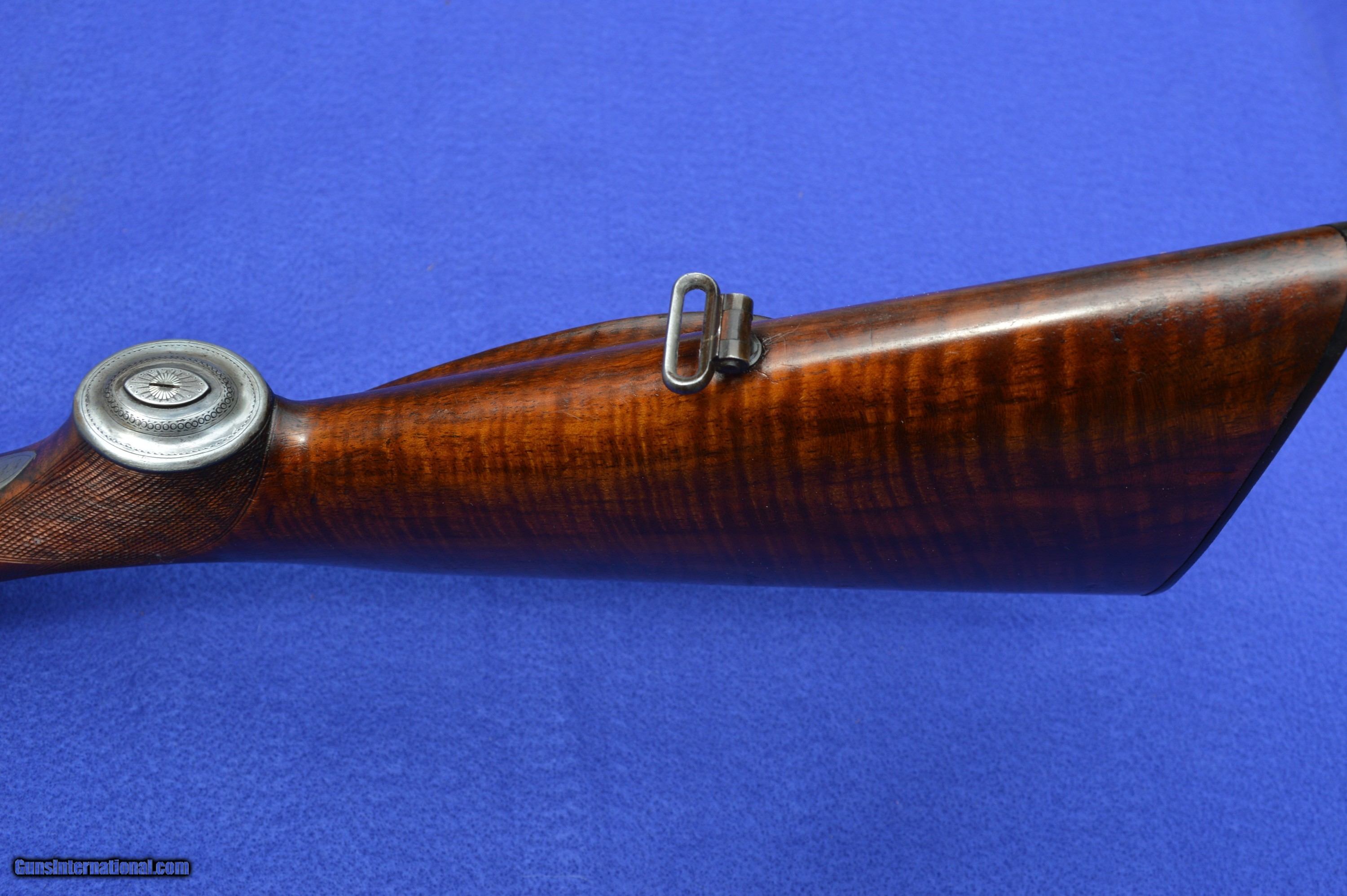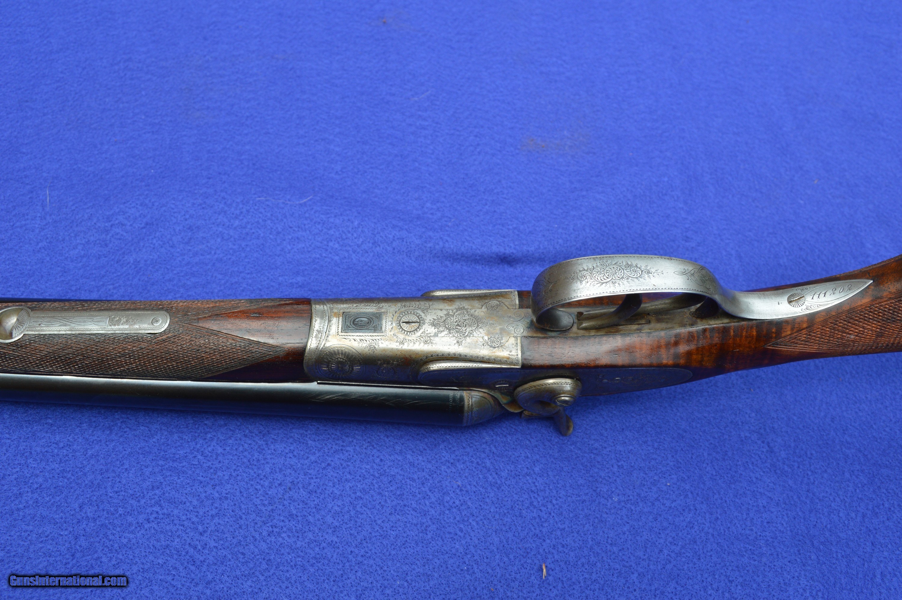 Description: A high-condition, graded J.P. Sauer 16-gauge hammergun with fluid steel barrels is rare. Sauer built some guns for the American market in the early 20th century, primarily field grade guns. However, a well-engraved hammergun with metric barrel dimensions and a Circasian walnut stock, such as this gun, probably came to the US with a returning WWII veteran. The side-lock action is a beautiful piece of machinery with each part precisely milled and hand fitted. The condition of the wood is excellent, behind the side locks as well as what it visible. The checking is good, as cleaned. The receiver retains significant case color and the engraving is crisp. The bores of the 75cm Krupp fluid steel barrels are bright and the exteriors of the barrels are flawless as refinished. Other signs of quality include a nicely engraved steel grip cap, Greener cross-bolt, and the detailing of the top rib. This gun weighs only 6 pounds 6 ounces and has modern shooting dimensions. The chambers are 65mm (2-5/8”). The right barrel is choked LM (.009) and the left IM (.017). The diameters of both bores 9” from the breech are .669, and the outside diameters of both barrels at the muzzle are .750. The wall thicknesses of the right barrels at 9” from the muzzle are .034/.035/.033 (top/side/bottom), and at the middle of the barrel are .037/.040/.042. The wall thicknesses of the left barrel are .030/.032/.035 and .035/.037/.040. respectively. This level of precision reflects the original quality of German manufacturing and suggests subsequent limited use. The drop at the comb is 1-3/4” and at the heel 2-5/8”. The length of pull to the horn buttplate is 13-3/4”. The triggers both pull at 5 pounds. The gun locks up tight. All serial numbers, 111202, match. The price does not include shipping costs paid by buyer. The inspection period is 7 days from receipt. This shotgun has been fired on the range on a number of occasions using standard target loads. However, as for any antique or vintage shotgun, it is recommended that the new owner have it inspected by his or her own gunsmith before firing. The gun carries a 30-day warranty, during which Doublegun Preservation, LLC will have any mechanical problems documented by a professional gunsmith repaired or accept the return of the gun and refund the price of the gun and all shipping costs. Please do not hesitate to call with questions Stephen Wesbrook at 703-625-4830. SOLD Curio/Relic: Yes |