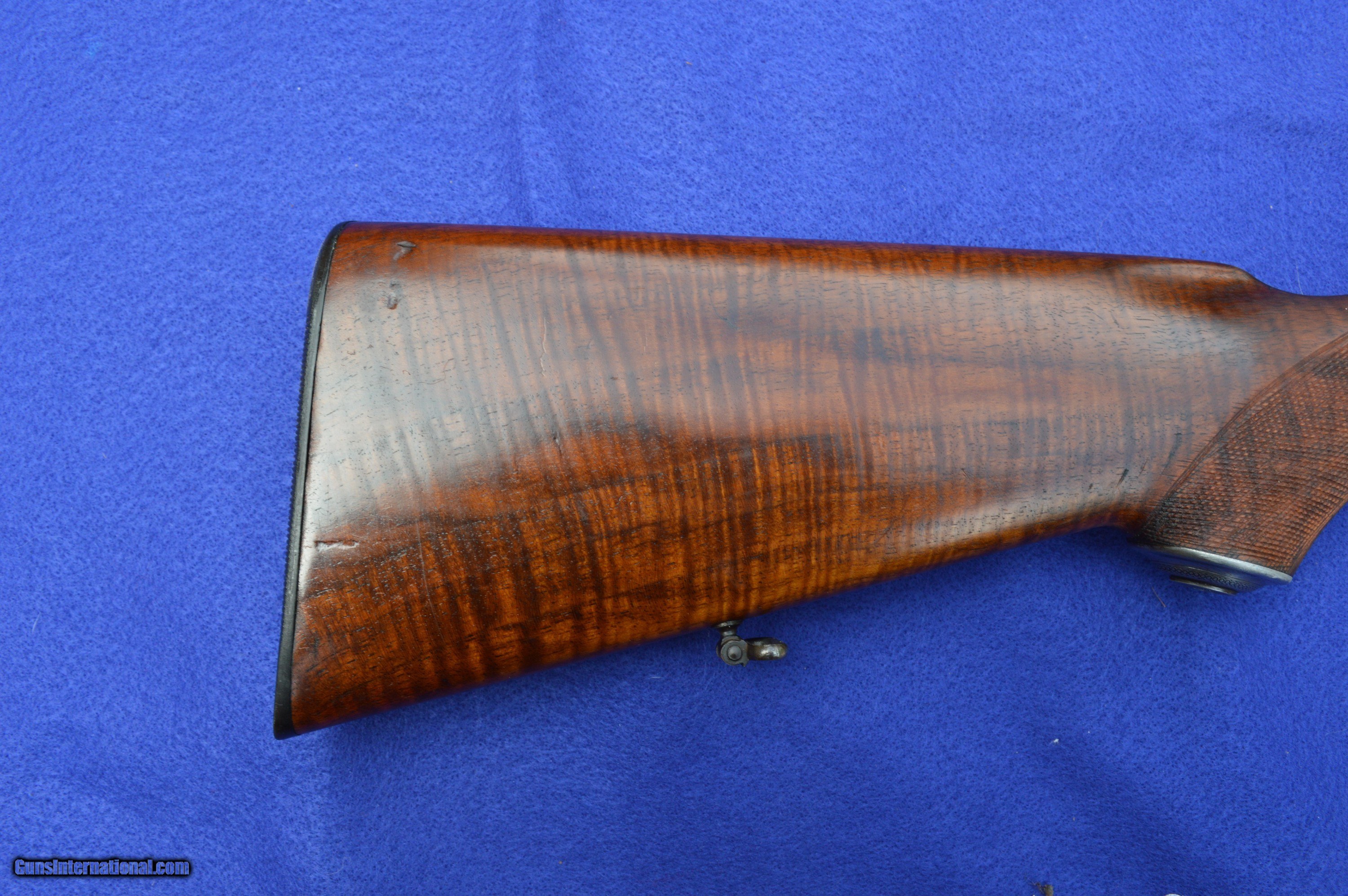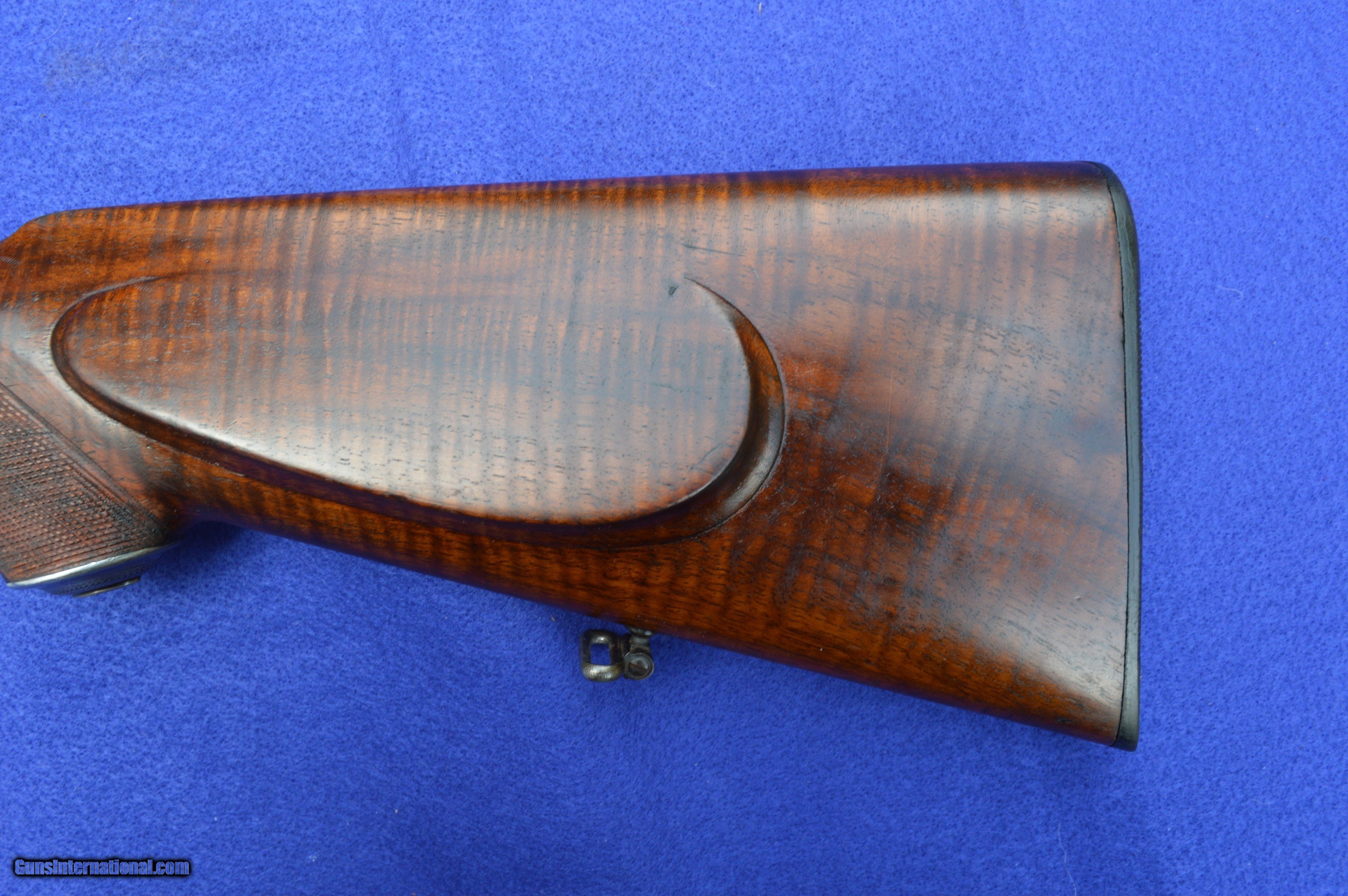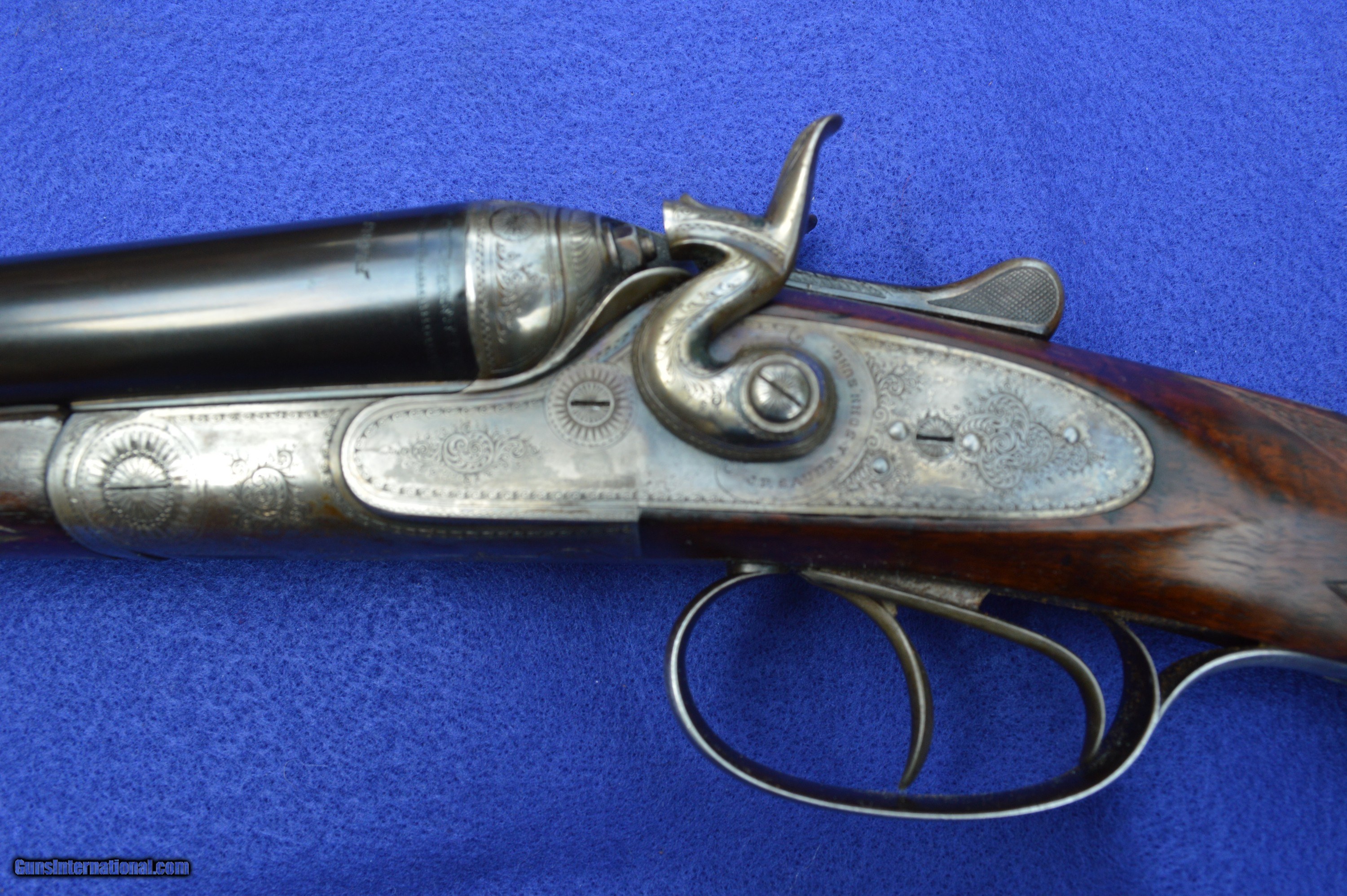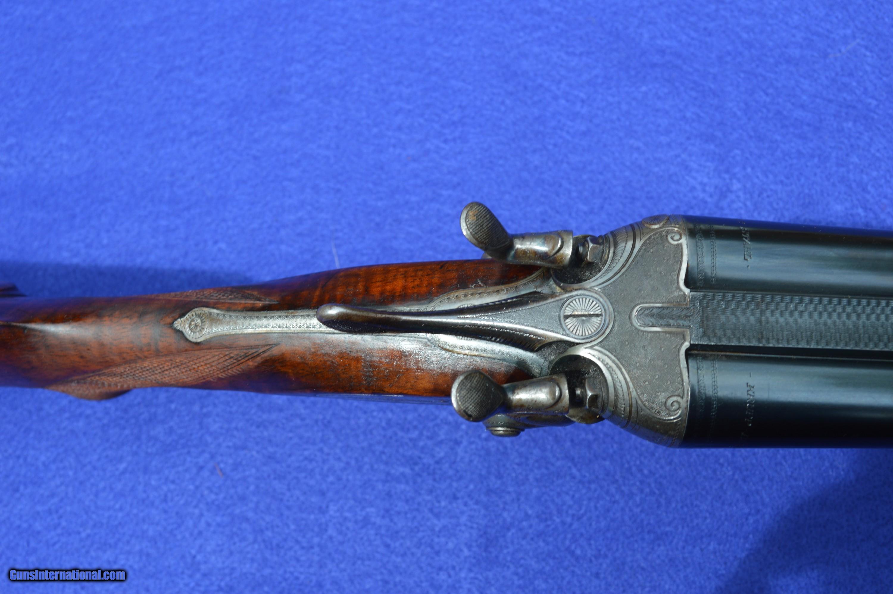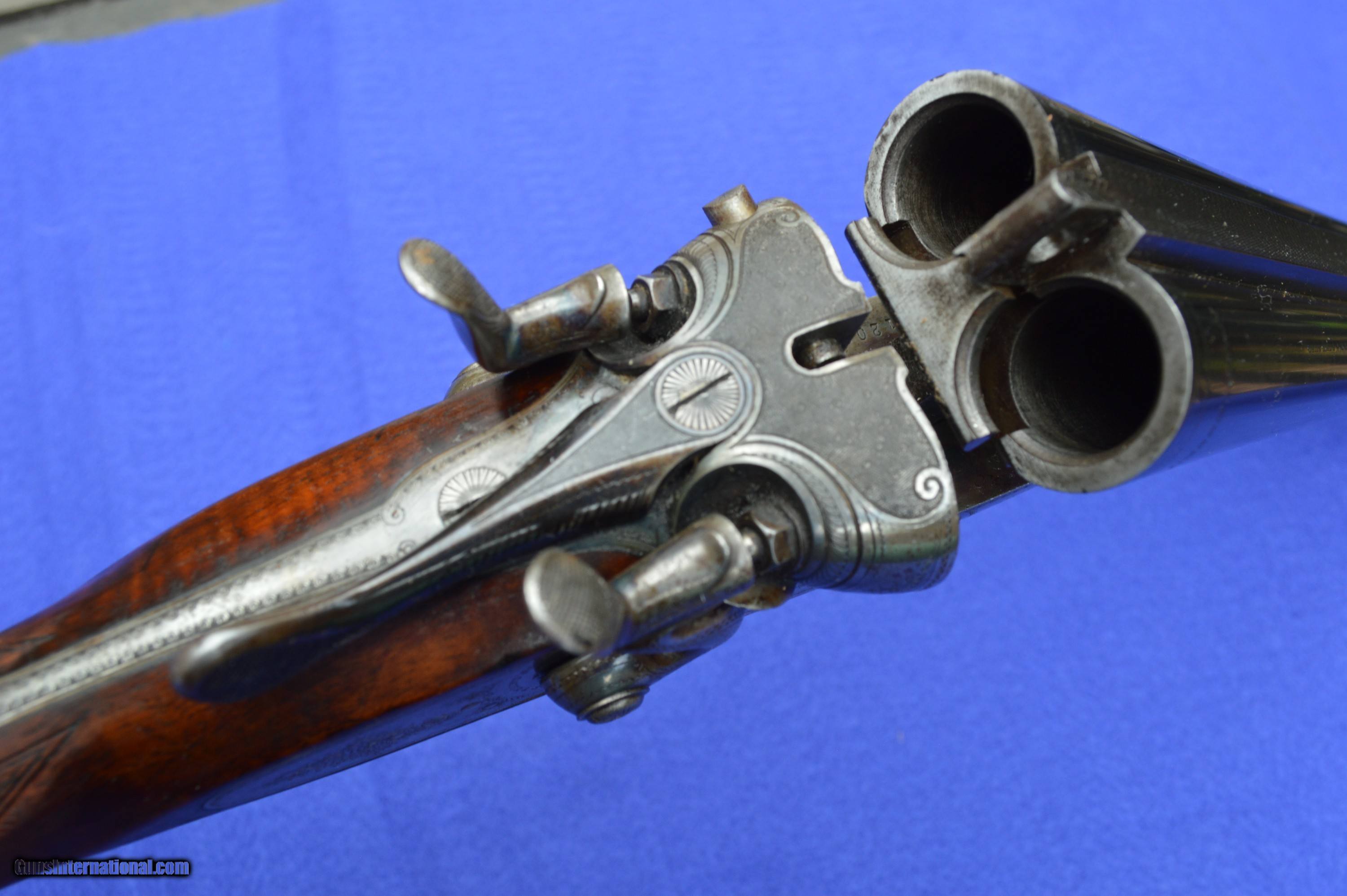 Description: A high-condition, graded J.P. Sauer 16-gauge hammergun with fluid steel barrels is rare. Sauer built some guns for the American market in the early 20th century, primarily field grade guns. However, a well-engraved hammergun with metric barrel dimensions and a Circasian walnut stock, such as this gun, probably came to the US with a returning WWII veteran. The side-lock action is a beautiful piece of machinery with each part precisely milled and hand fitted. The condition of the wood is excellent, behind the side locks as well as what it visible. The checking is good, as cleaned. The receiver retains significant case color and the engraving is crisp. The bores of the 75cm Krupp fluid steel barrels are bright and the exteriors of the barrels are flawless as refinished. Other signs of quality include a nicely engraved steel grip cap, Greener cross-bolt, and the detailing of the top rib. This gun weighs only 6 pounds 6 ounces and has modern shooting dimensions. The chambers are 65mm (2-5/8”). The right barrel is choked LM (.009) and the left IM (.017). The diameters of both bores 9” from the breech are .669, and the outside diameters of both barrels at the muzzle are .750. The wall thicknesses of the right barrels at 9” from the muzzle are .034/.035/.033 (top/side/bottom), and at the middle of the barrel are .037/.040/.042. The wall thicknesses of the left barrel are .030/.032/.035 and .035/.037/.040. respectively. This level of precision reflects the original quality of German manufacturing and suggests subsequent limited use. The drop at the comb is 1-3/4” and at the heel 2-5/8”. The length of pull to the horn buttplate is 13-3/4”. The triggers both pull at 5 pounds. The gun locks up tight. All serial numbers, 111202, match. The price does not include shipping costs paid by buyer. The inspection period is 7 days from receipt. This shotgun has been fired on the range on a number of occasions using standard target loads. However, as for any antique or vintage shotgun, it is recommended that the new owner have it inspected by his or her own gunsmith before firing. The gun carries a 30-day warranty, during which Doublegun Preservation, LLC will have any mechanical problems documented by a professional gunsmith repaired or accept the return of the gun and refund the price of the gun and all shipping costs. Please do not hesitate to call with questions Stephen Wesbrook at 703-625-4830. SOLD Curio/Relic: Yes |