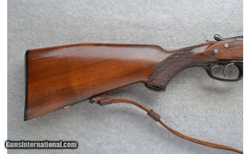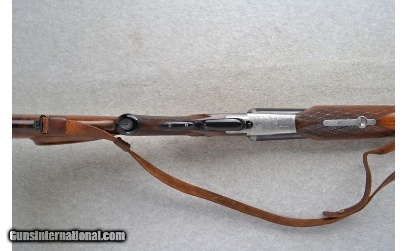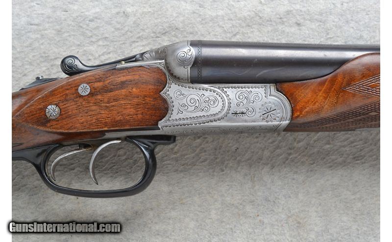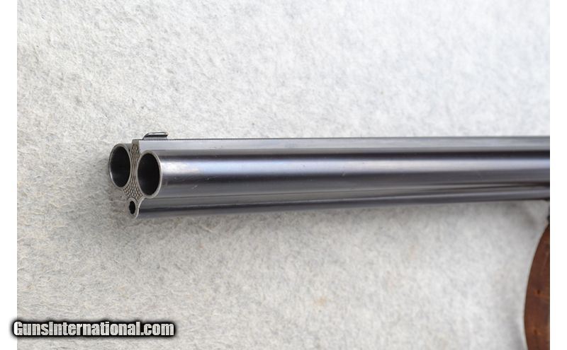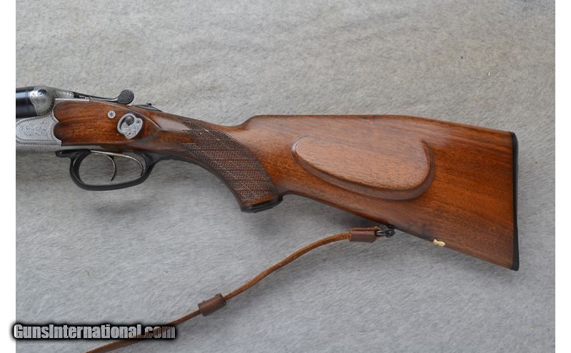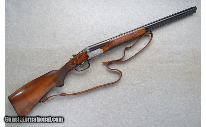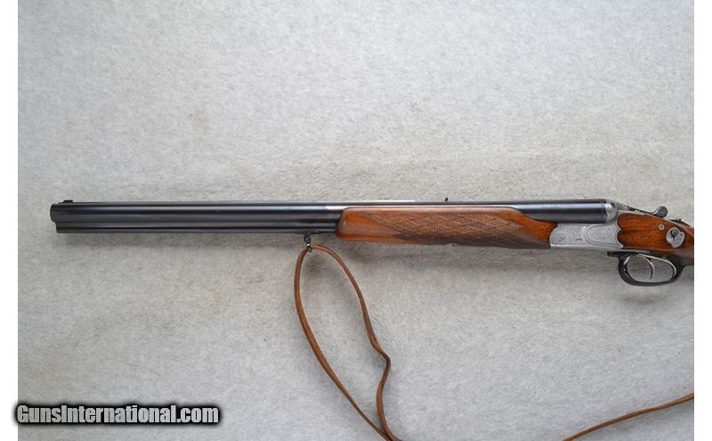 Description: This J.P. Sauer Drilling Model is a combination shotgun/rifle in 12 Ga./.222 Rem. Cal. It has 23.75 inch barrels with a solid rib. A blade front sight with a brass bead and a pop up notch middle sight. The butt stock is a checkered grip walnut pistol grip with a raised cheekpiece and black cap. The forearm is a checkered grip walnut beavertail style. It has double triggers. The coin finished receiver is nicely engraved. 12 Gauge SOLD Chambers: 2 3/4 inch. Metal Condition: "Good. Minor wear, handling marks and small freckle spots. Wood Condition: Good. Minor handling marks. Bore Condition: Excellent. Barrels: 23.75 inch with a solid rib. Triggers: Double. Stock Dimensions: LOP 14 1/4 inches. DAC 1 5/8 inch. DAH 3 inch. Fore End: Checkered walnut beavertail. Butt Pad: Sauer ribbed black plate. Weight: 7 lb. 8 oz. Sights: Blade front with a brass bead. Pop up notch middle. Chokes: Fixed Full and Half choke. Item Location: Richfield, WI |