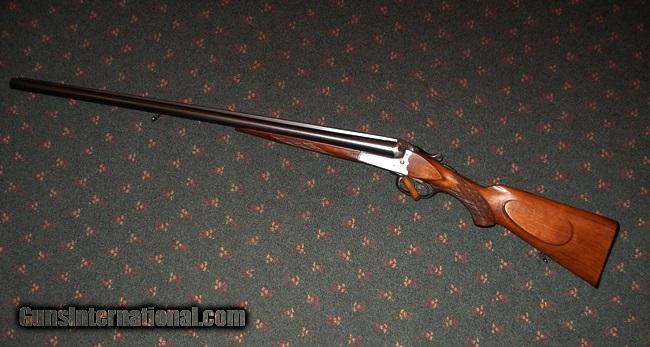 Description: J.P. SAUER ROYAL SCALLOPED BOXLOCK 12GA S/S SHOTGUN, 1968 MFG DATE, LIGHT SCROLL ON COIN FINISHED ACTION, 28" BBLS, 2 3/4, MOD/FULL, RAISED GAME RIB, YES, DBL TRIGGERS, MEDIUM DARK COLOR STREAKED WALNUT, PISTOL/SPLINTER, CHEEKPIECE, LOP 14 3/8, 1 3/4, 2 3/4, 6LBS 10OZ, 98% ORIGINAL! SOLD |