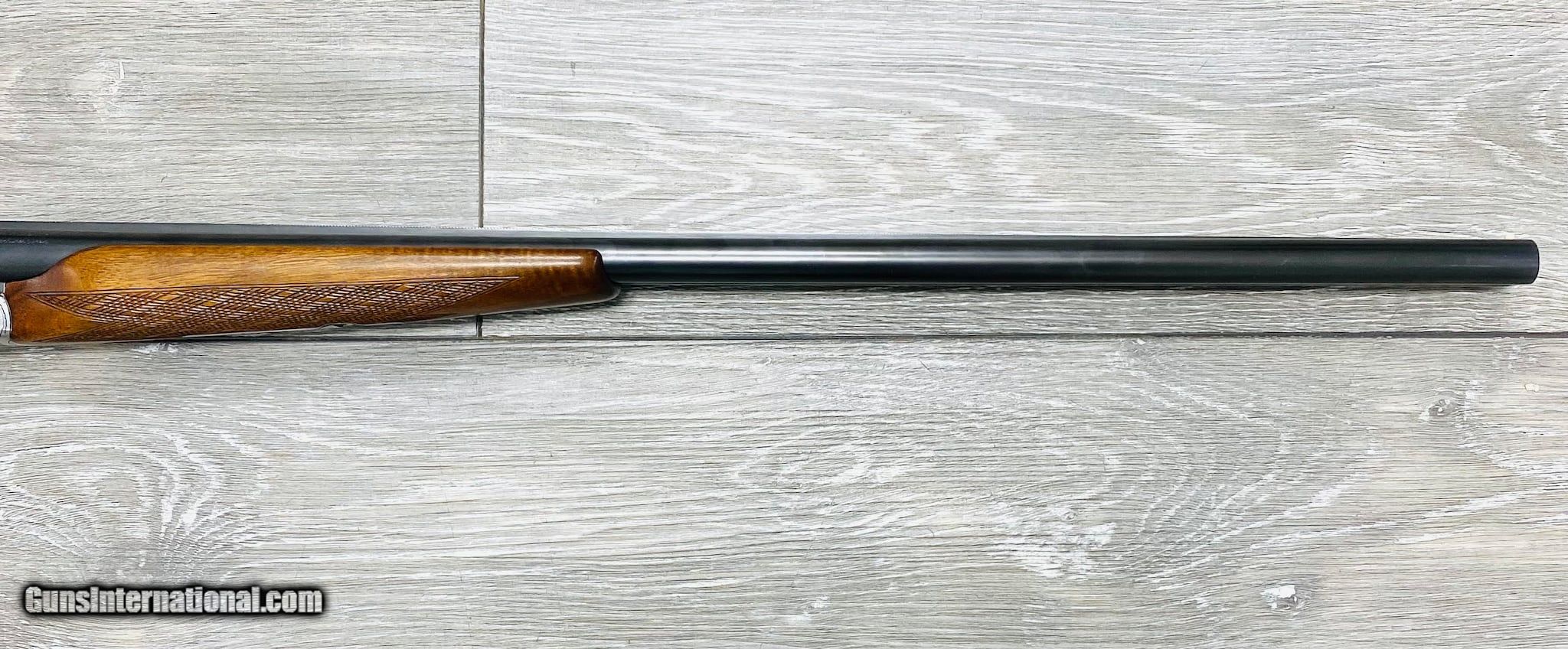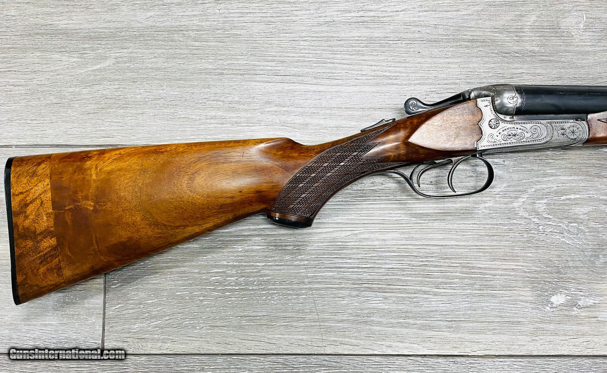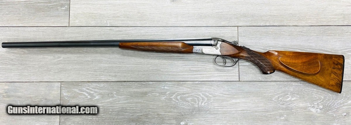 Description: Guns Listing ID: 829799 J. P. Sauer & Sohn Royal Boxlock 20 gage side by side shotgun made in 1963 INCREDIBLY nice shotgun. Nitro Proofed in March 1963. 26†bbls, 2-3/4†chambers, matted concave game rib with small ivory front bead. Bbls marked “Royal - J.P. Sauer & Sohn - Made in W. Germany - Spezial Laufstahl Bochumer Vereinâ€. Polished flats with proof and bore markings. Beavertail forend is skip line checkered and has lightly engraved Deely latch release and iron. Scalloped boxlock action with Greener cross bolt and double locking lugs lightly engraved w/maker’s name on sides and cocking indicators. Bolsters with side clips. Double triggers, auto ejectors and auto safety. Blued trigger guard is lightly engraved. Capped pistol grip buttstock is skip line checkered though the wrist, has cheek piece on left side, small filled hole at toe line for sling swivel and stock has 1-1/4â€stock extension w/horn buttplate Bottom rib with two small screws filling sling swivel holes. WEIGHT: 6lbs. 3oz. Bore Restriction: .013(Rt) .005(L)(reverse chokes). DAC: 1-5/8â€. DAH: 2-1/2â€. LOP: 14-1/4â€. â€. CONDITION: Excellent. Bbls retain nearly all of what appears to be its original blue. Action with mottled case hardening remaining. Stocks are sound and retain most of what appears to be their original finish with some finish added. Bores are bright and shiny. Mechanics are crisp. Gun is tight. These post war small gauge German guns represent an excellent value for the shooter. SOLD Manufacturer: J.P. SAUER & SOHN Model: ROYAL BOXLOCK Condition: Used - Non-Certified Barrels: 26 BARREL Gauge Info: 20 GA Finish: WOOD AND METAL ENGRAVING |