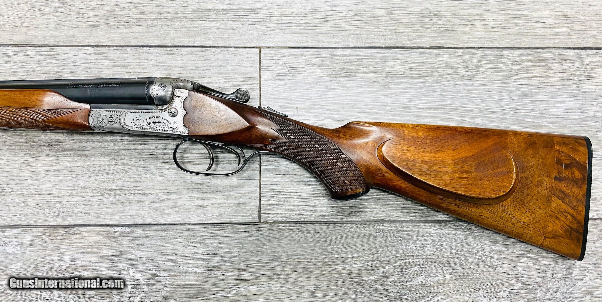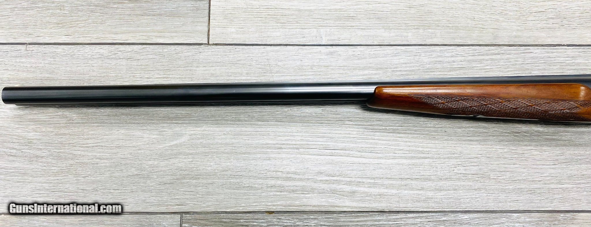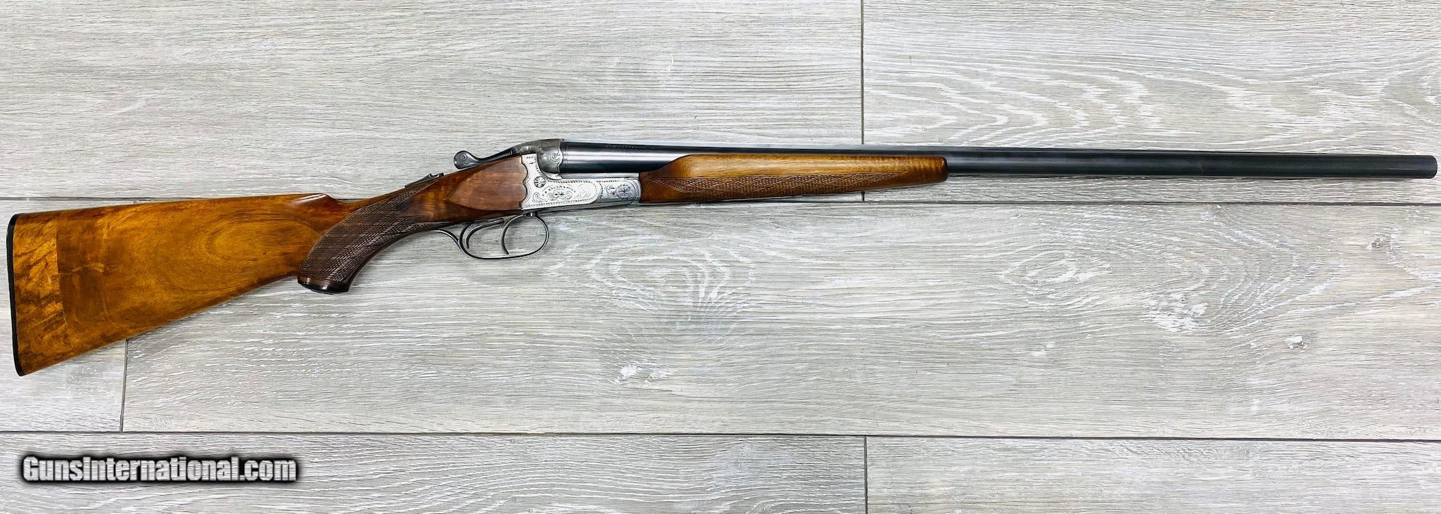 Description: Guns Listing ID: 829799 J. P. Sauer & Sohn Royal Boxlock 20 gage side by side shotgun made in 1963 INCREDIBLY nice shotgun. Nitro Proofed in March 1963. 26†bbls, 2-3/4†chambers, matted concave game rib with small ivory front bead. Bbls marked “Royal - J.P. Sauer & Sohn - Made in W. Germany - Spezial Laufstahl Bochumer Vereinâ€. Polished flats with proof and bore markings. Beavertail forend is skip line checkered and has lightly engraved Deely latch release and iron. Scalloped boxlock action with Greener cross bolt and double locking lugs lightly engraved w/maker’s name on sides and cocking indicators. Bolsters with side clips. Double triggers, auto ejectors and auto safety. Blued trigger guard is lightly engraved. Capped pistol grip buttstock is skip line checkered though the wrist, has cheek piece on left side, small filled hole at toe line for sling swivel and stock has 1-1/4â€stock extension w/horn buttplate Bottom rib with two small screws filling sling swivel holes. WEIGHT: 6lbs. 3oz. Bore Restriction: .013(Rt) .005(L)(reverse chokes). DAC: 1-5/8â€. DAH: 2-1/2â€. LOP: 14-1/4â€. â€. CONDITION: Excellent. Bbls retain nearly all of what appears to be its original blue. Action with mottled case hardening remaining. Stocks are sound and retain most of what appears to be their original finish with some finish added. Bores are bright and shiny. Mechanics are crisp. Gun is tight. These post war small gauge German guns represent an excellent value for the shooter. SOLD Manufacturer: J.P. SAUER & SOHN Model: ROYAL BOXLOCK Condition: Used - Non-Certified Barrels: 26 BARREL Gauge Info: 20 GA Finish: WOOD AND METAL ENGRAVING |