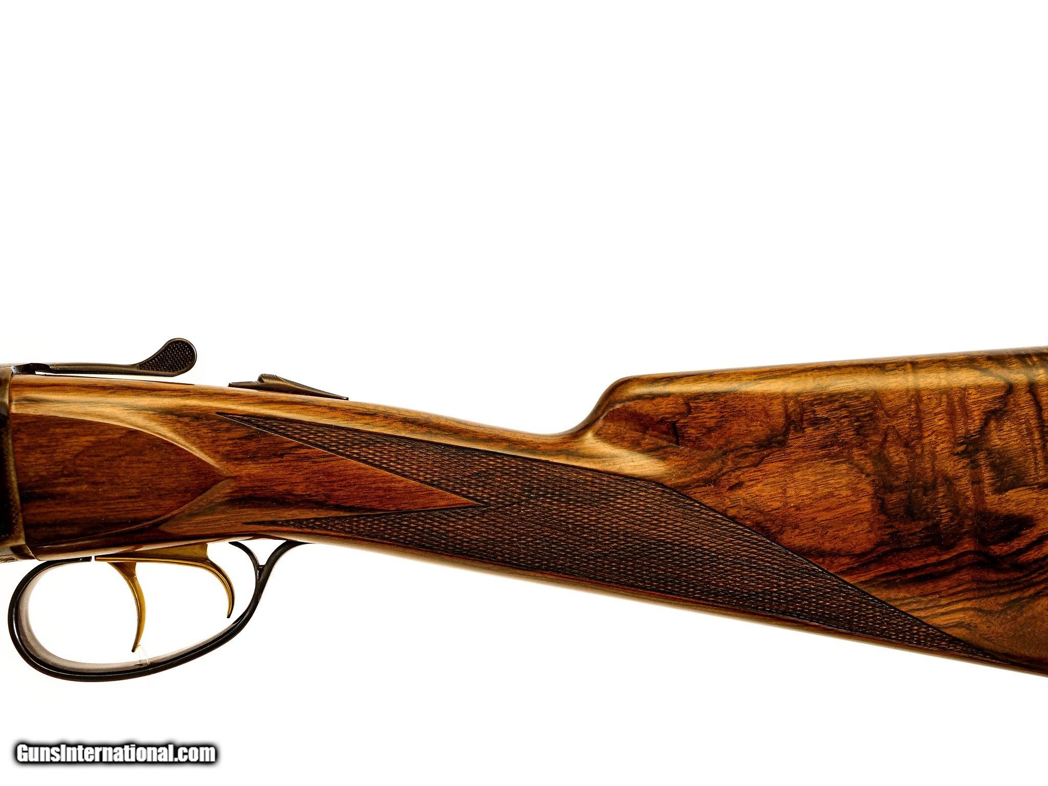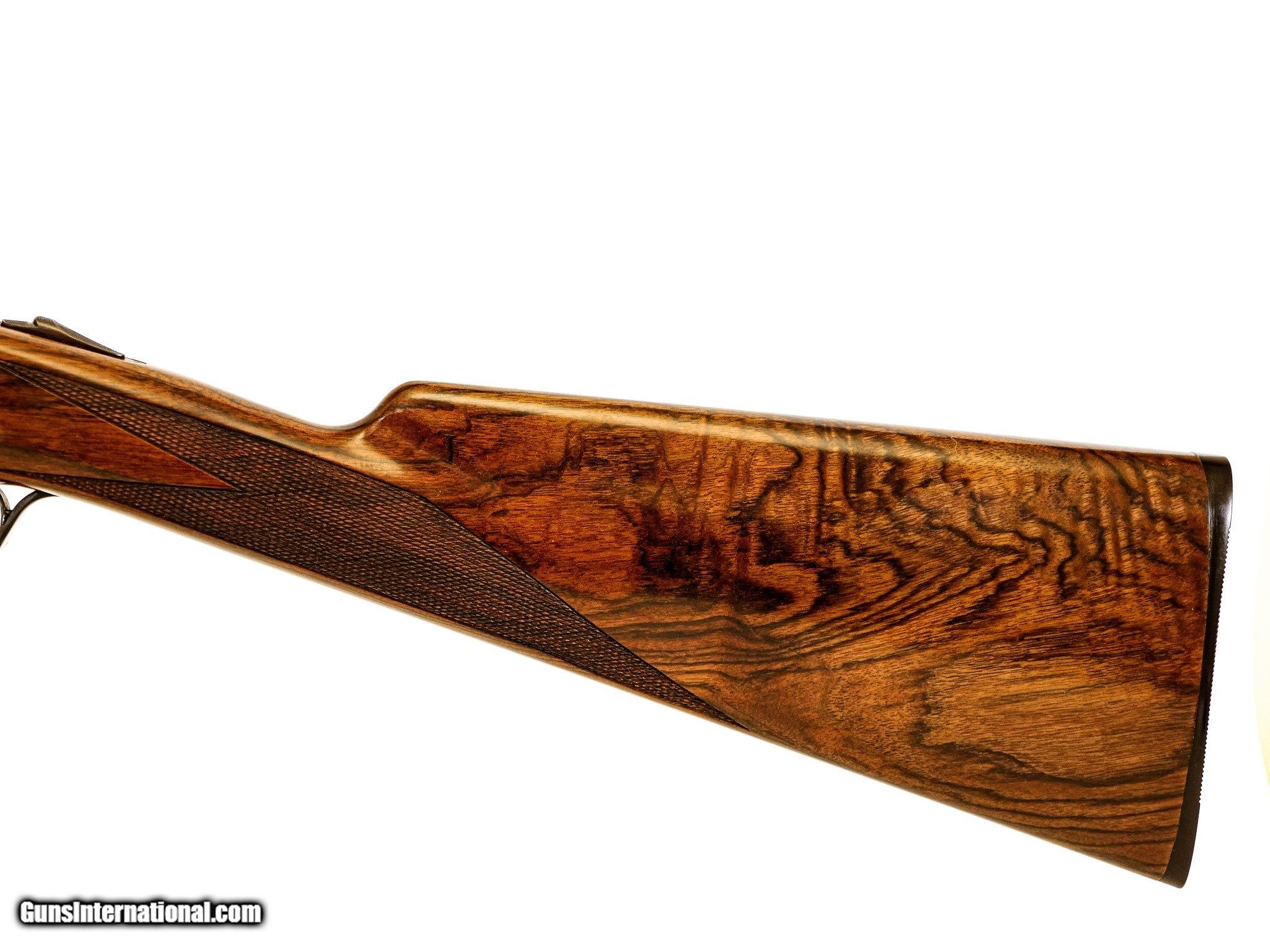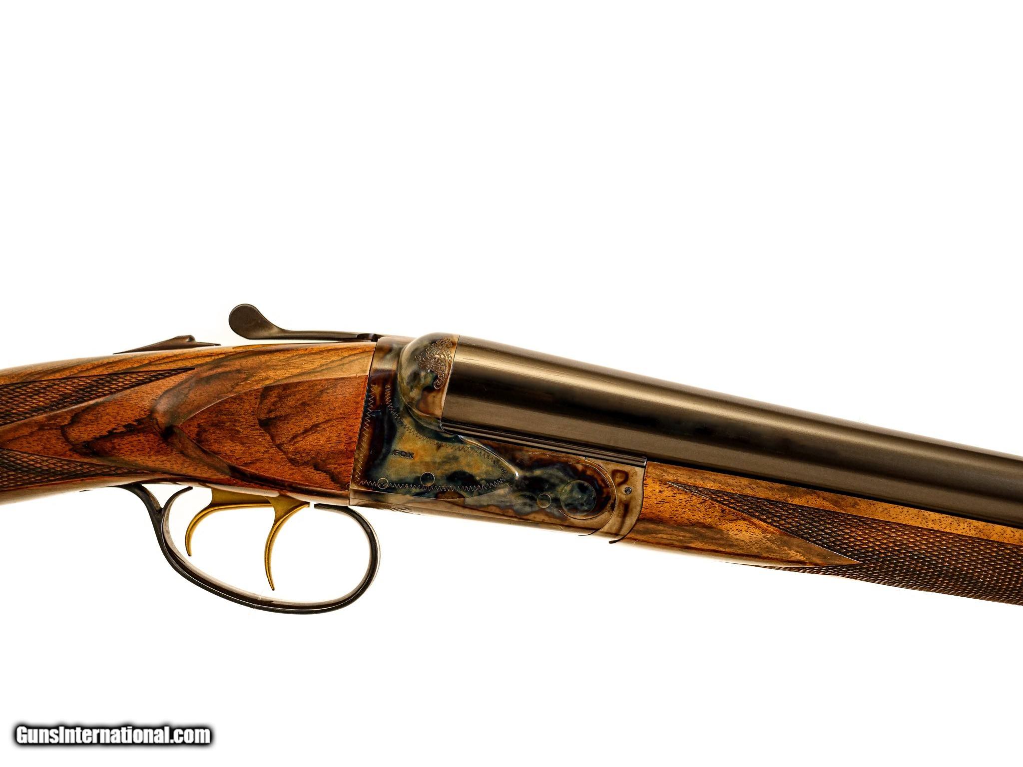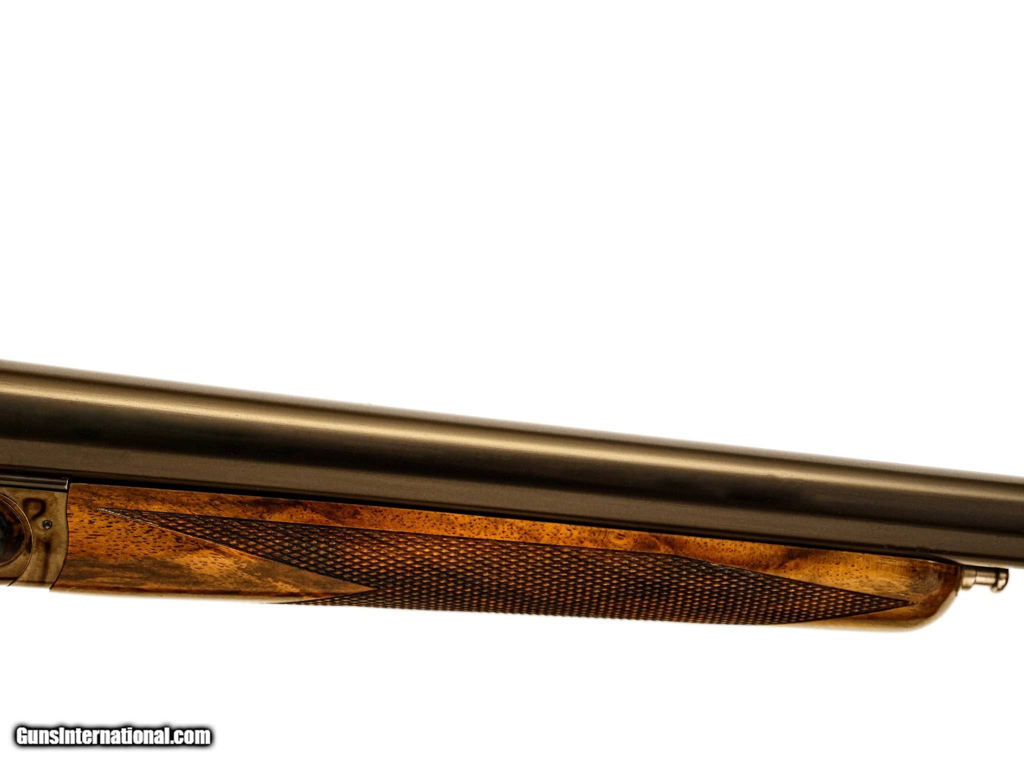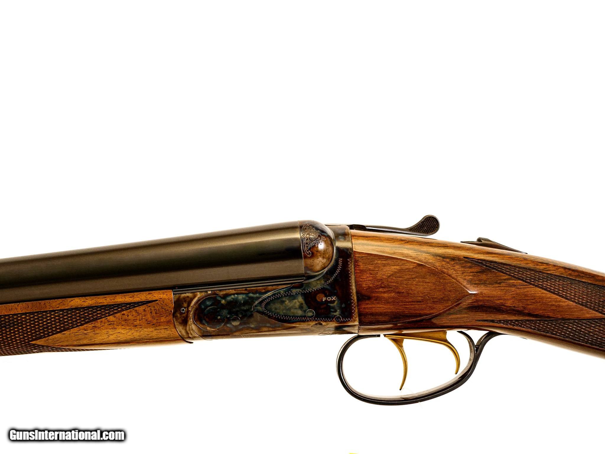 Description: SAVAGE – Fox A Grade, 12ga. 26” Barrels with Factory Screw-in Choke Tubes. Highly figured Turkish circassian walnut straight grip stock, factory butt plate, game rib, gold double triggers, automatic ejectors, A grade engraving over magnificent traditional bone and charcoal case coloring, 2 point checkering, rare opportunity, factory new and unfired, cased, available for immediate delivery. S & H - $50.00. Inv: 52117 6 lbs. 14 oz. 14 1/2” x 1 1/8” x 2” $4,250.00 SOLD |