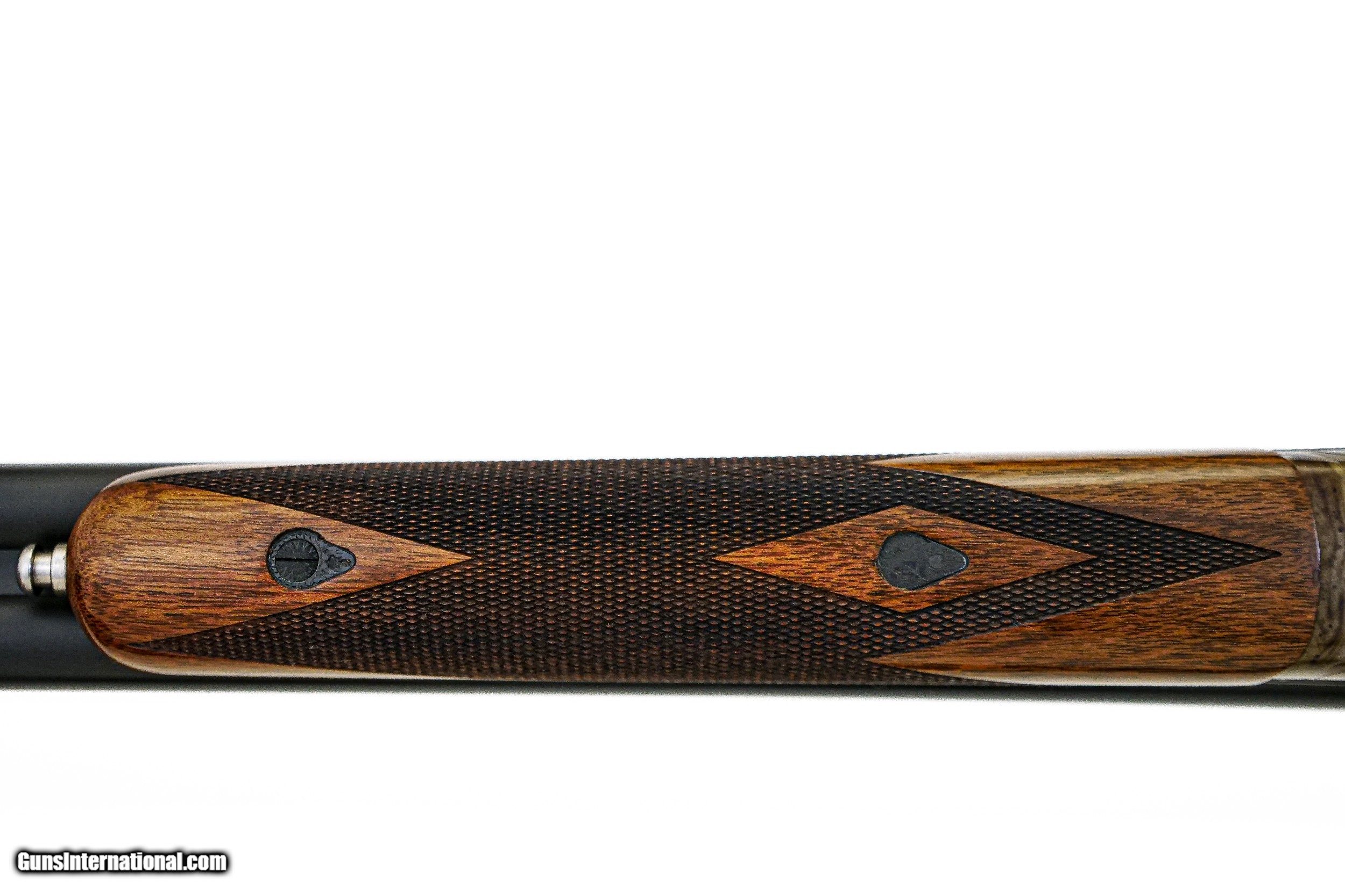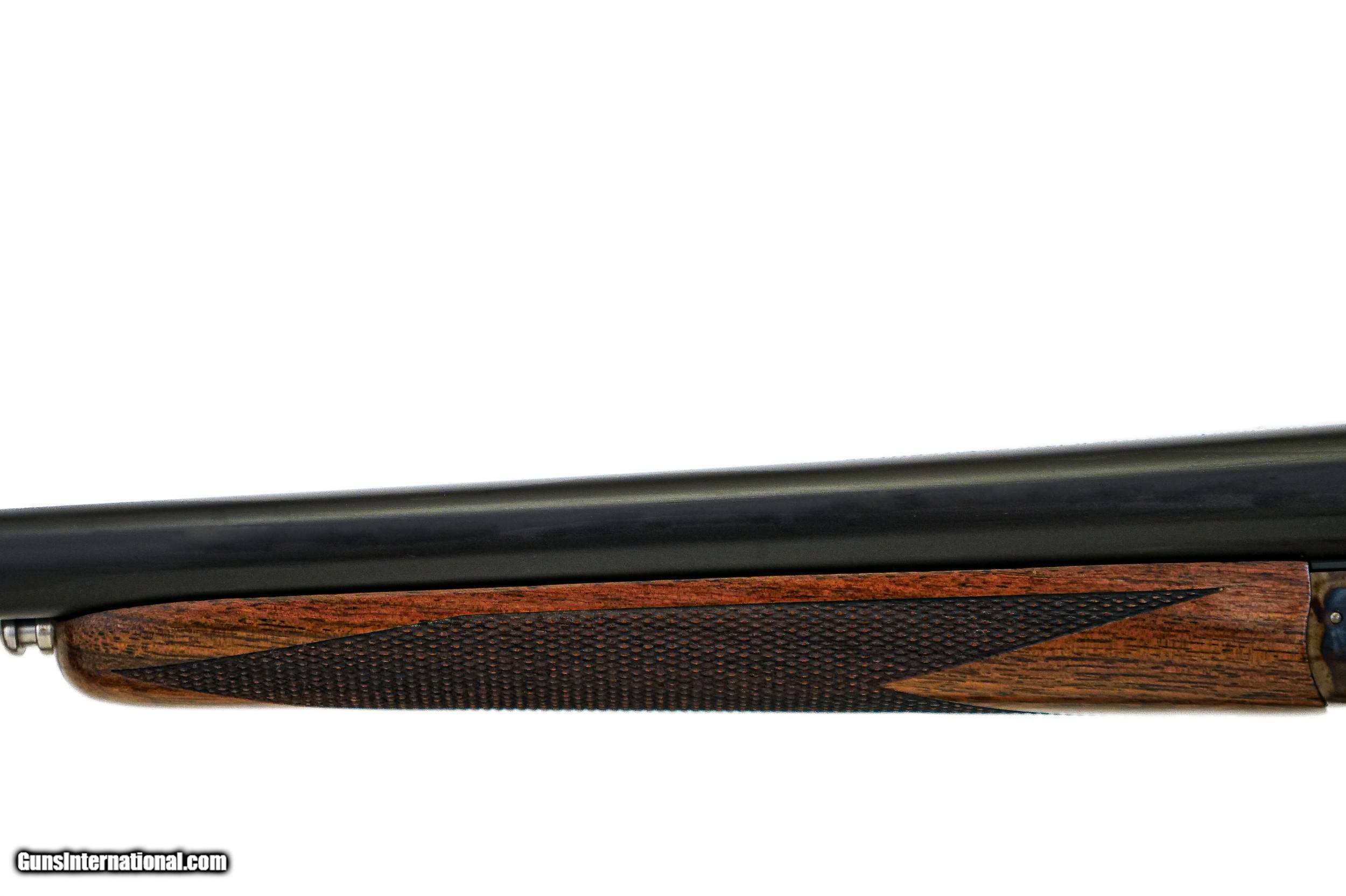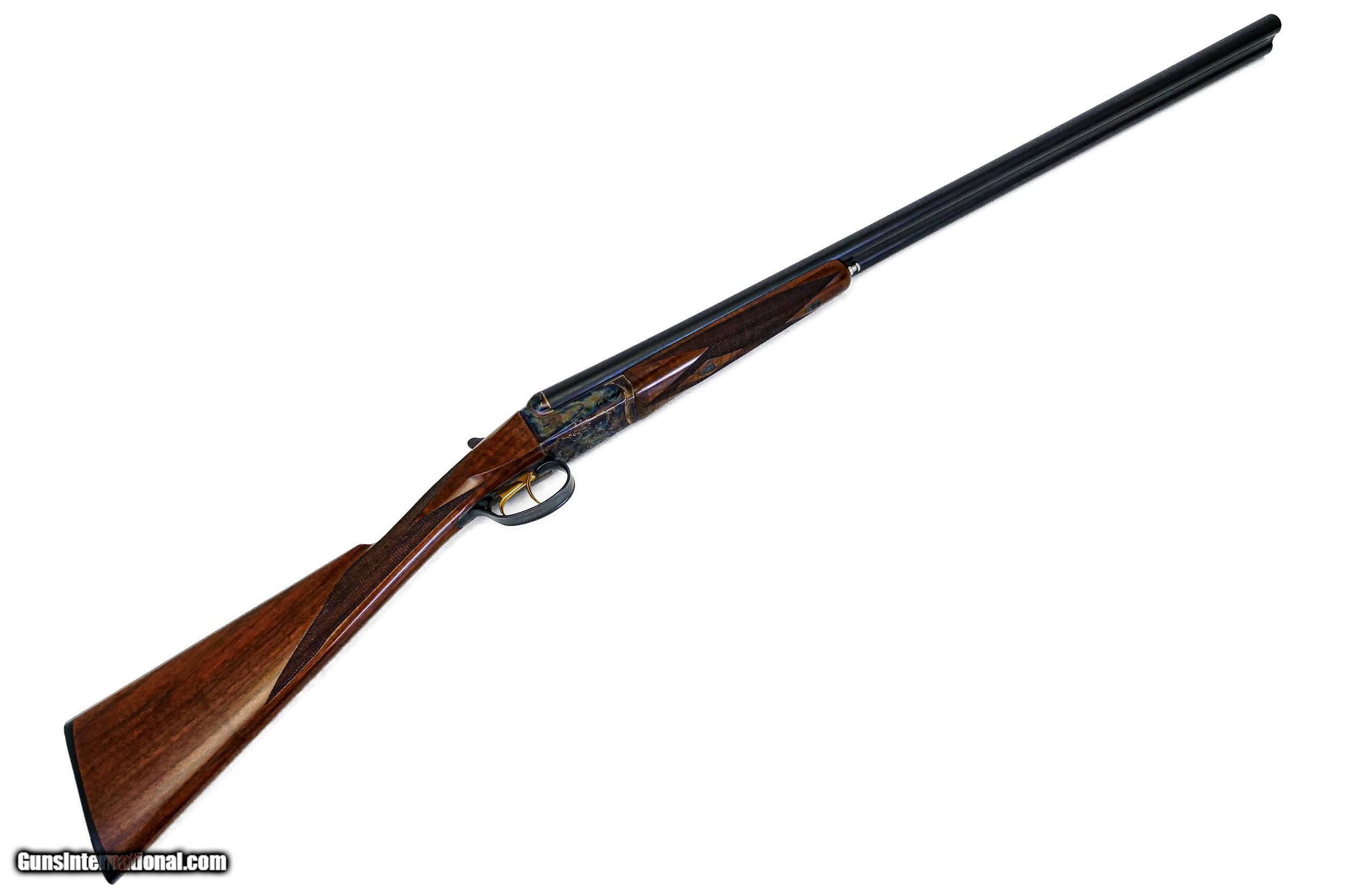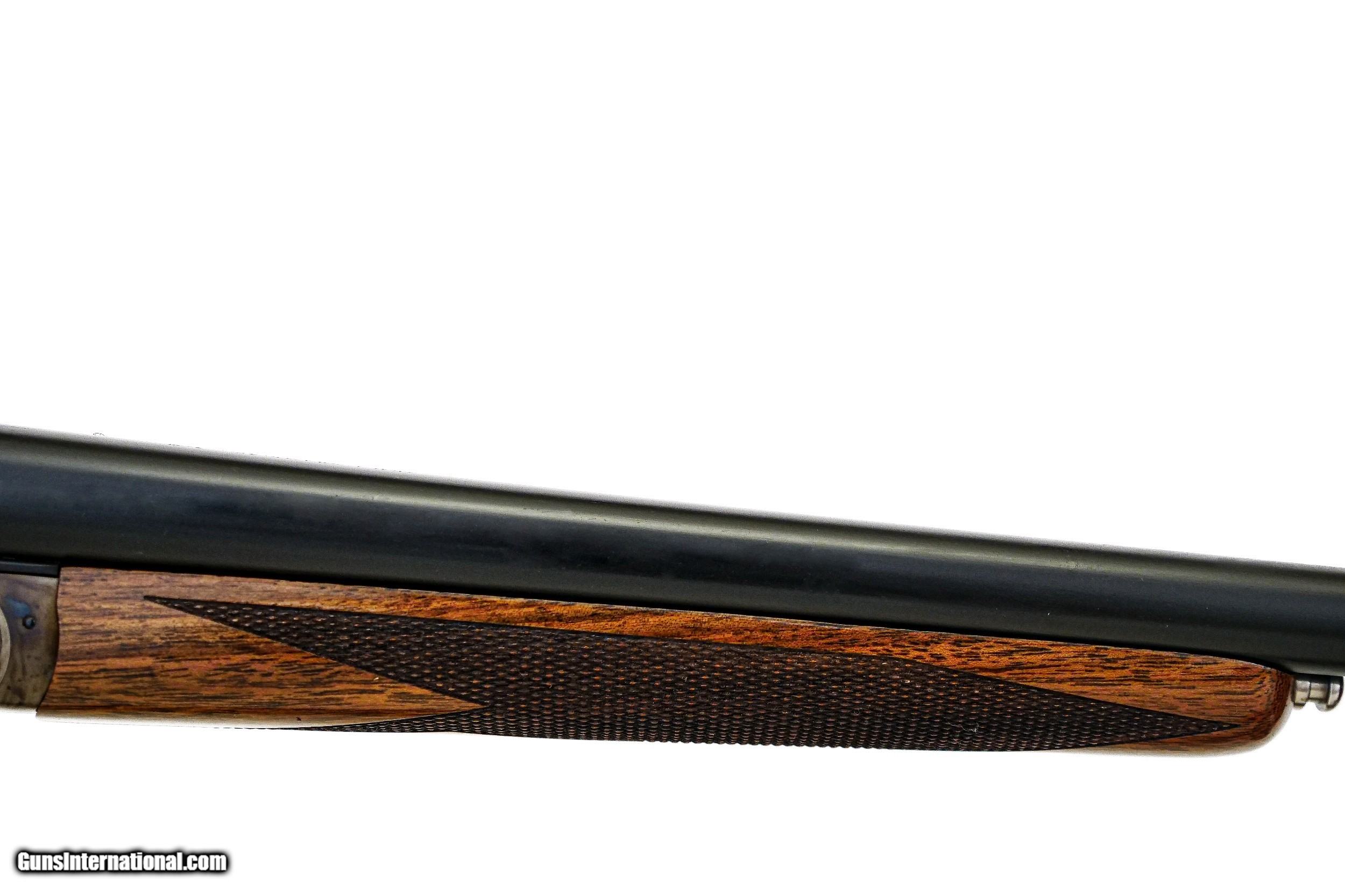 Description: SAVAGE - Fox A Grade, 20ga. 26” Barrels with Factory Screw-in Choke Tubes. Nicely figured deluxe American walnut straight grip stock, factory butt plate, game rib, gold double triggers, splinter forend, automatic ejectors, A grade engraving over magnificent traditional bone and charcoal case coloring, 2 point checkering, rare opportunity, factory new and unfired, cased, available for immediate delivery. S & H - $50.00. Inv: 51189 5 lbs. 10 oz. 14 3/8” x 1 ½” x 2 ¼” $4,250.00 SOLD |