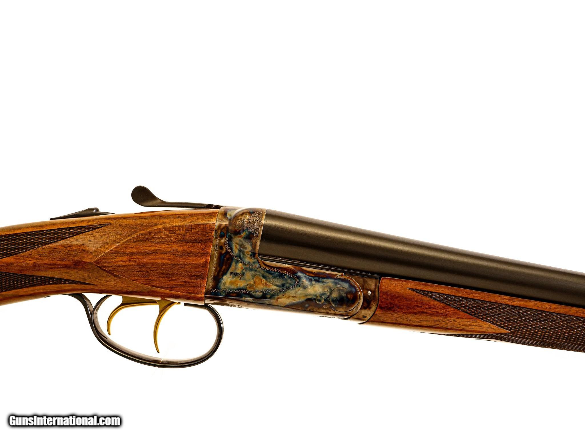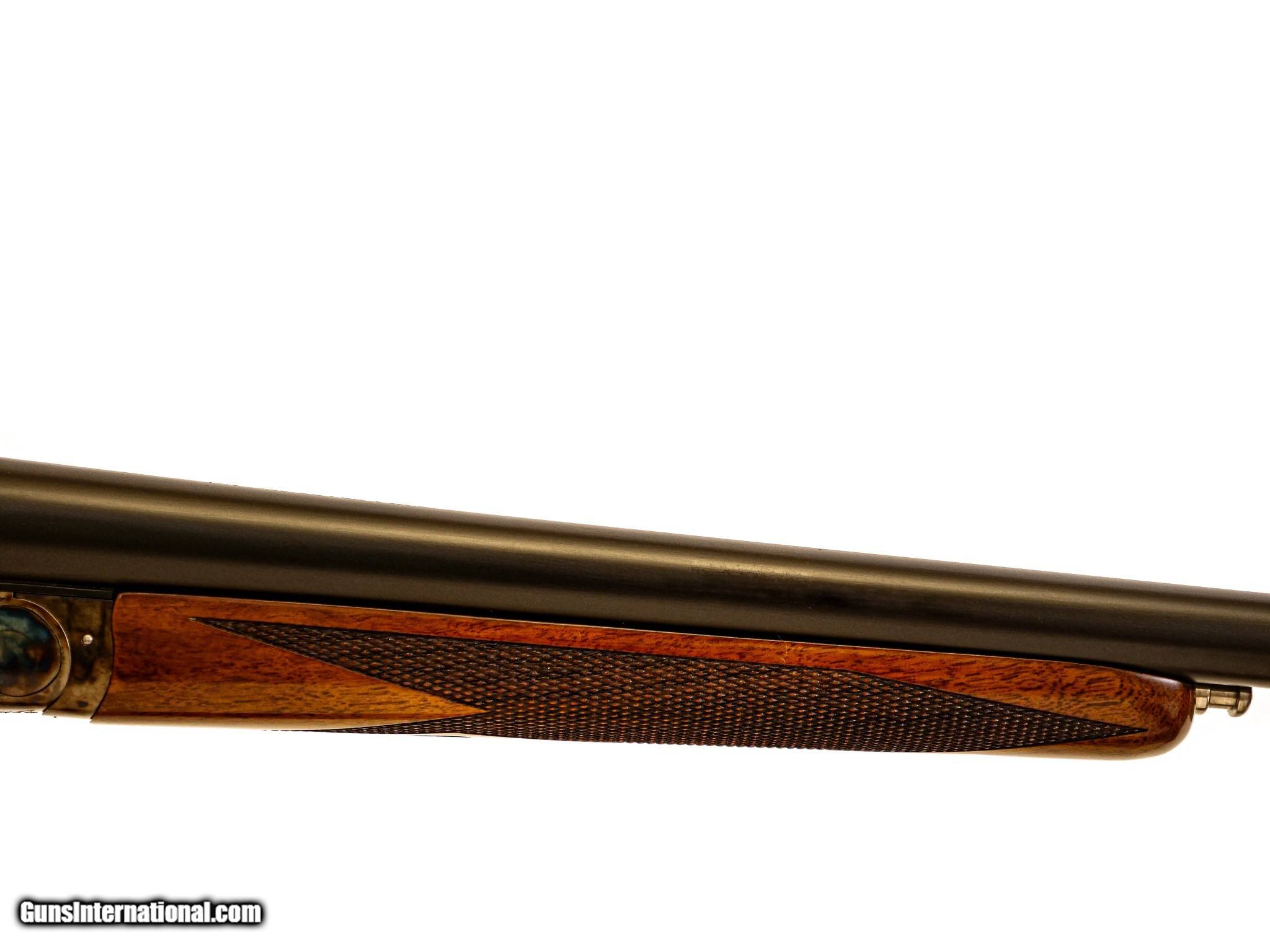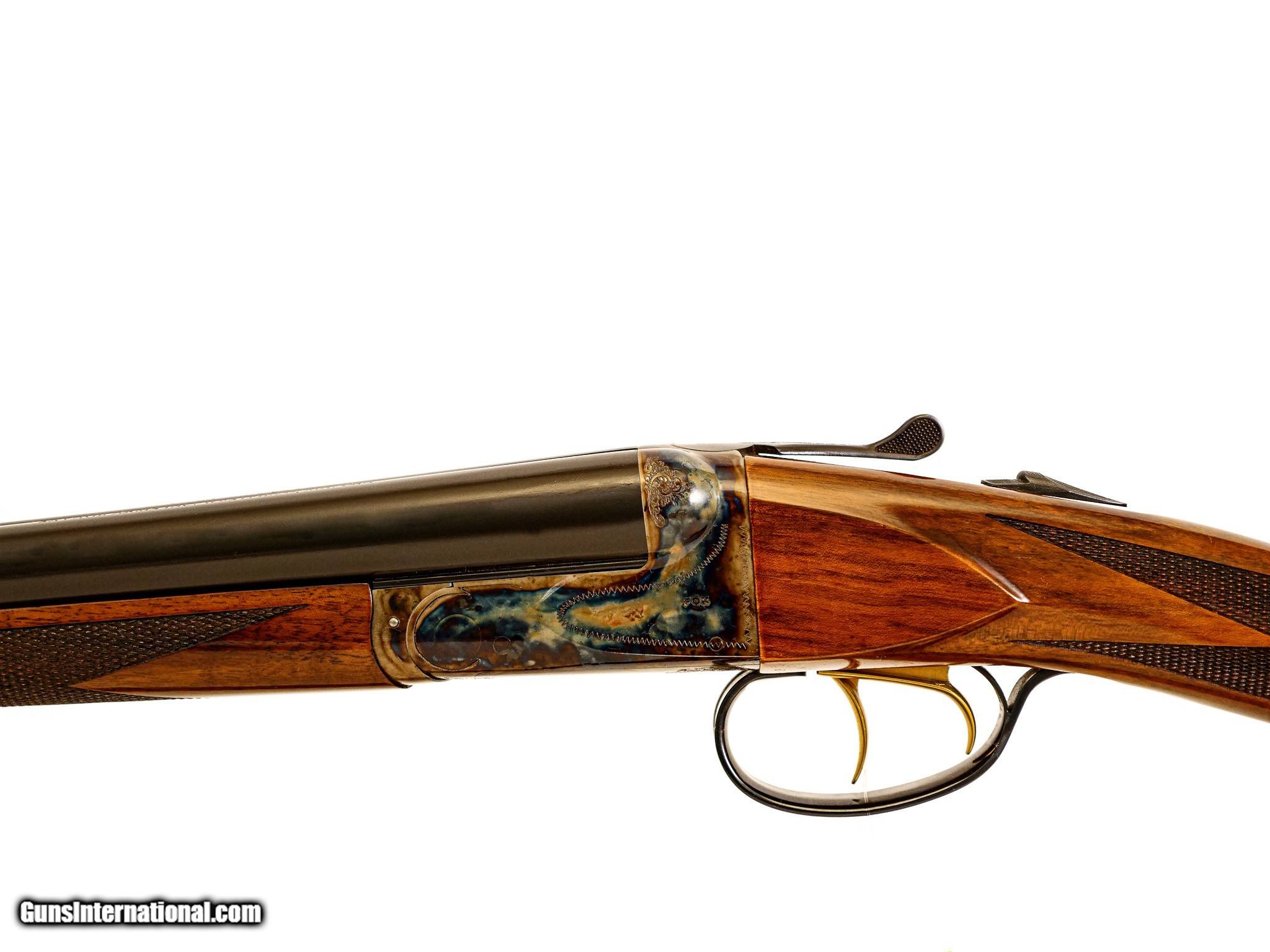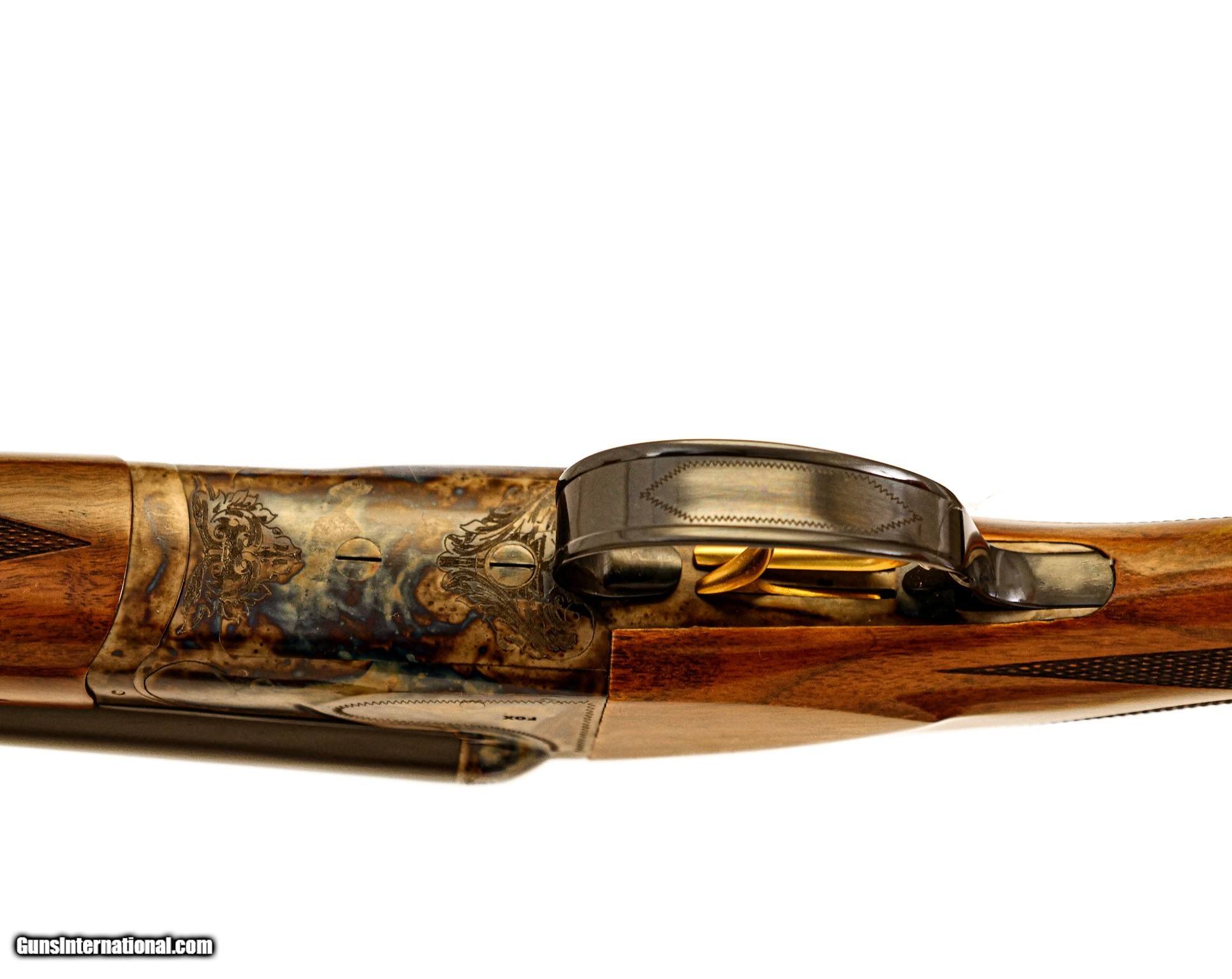 Description: SAVAGE - Fox A Grade, 20ga. 28" Barrels with Factory Screw-in Choke Tubes. Nicely figured walnut straight grip stock, factory butt plate, game rib, gold double triggers, automatic ejectors, A grade engraving over magnificent traditional bone and charcoal case coloring, 2 point checkering, rare opportunity, factory new and unfired, cased, available for immediate delivery. S & H - $50.00. Inv: 52104 5 lbs. 12 oz. 14 3/8” x 1 1/2 ” x 2 3/8” $4,250.00 SOLD |