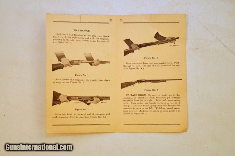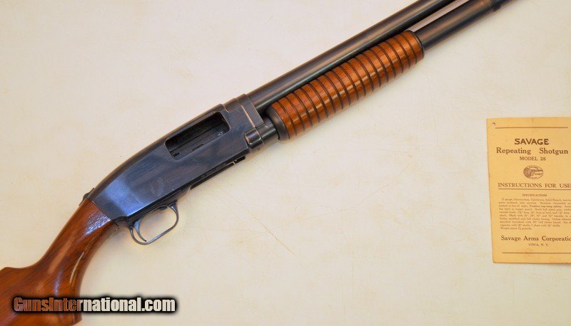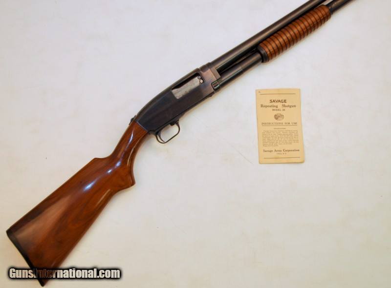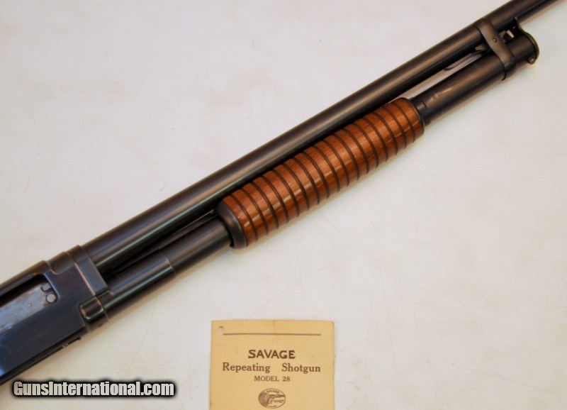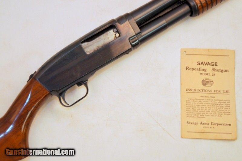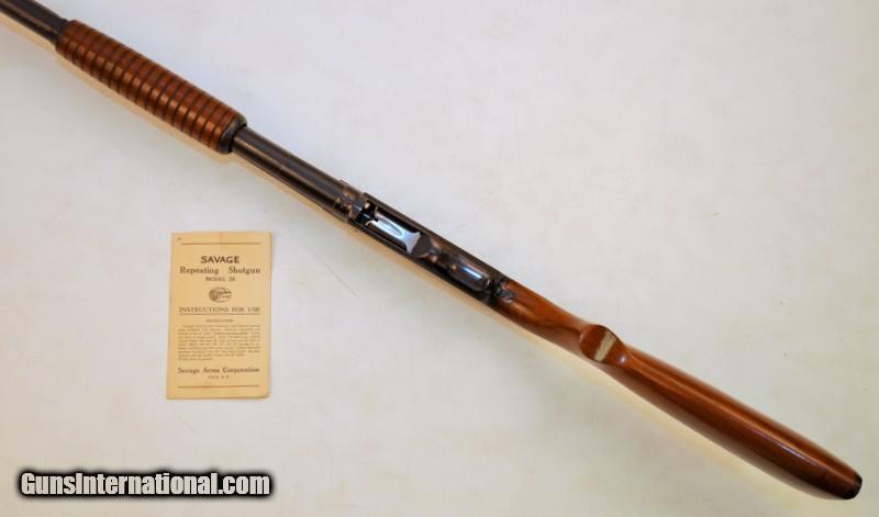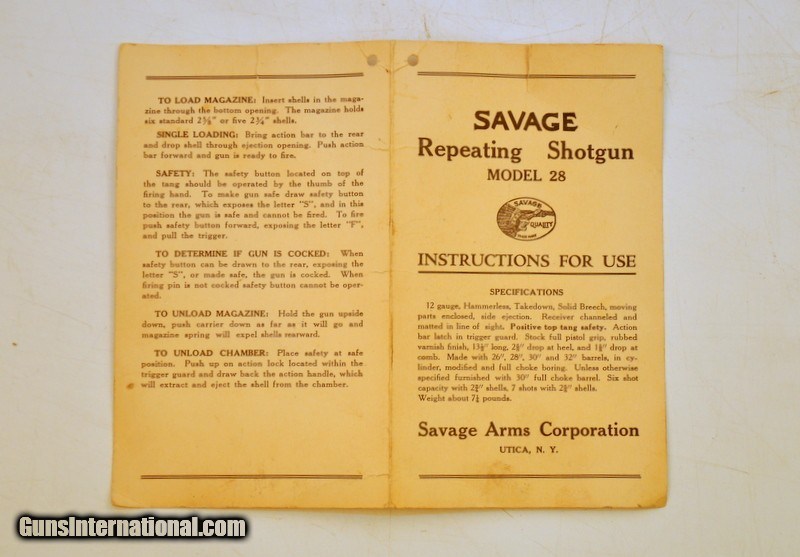 Description: High quality shotgun mfg. 1927-1934. Designed to look like & compete with the Winchester M12. 12 gauge 2-3/4". SN190XX. 28" plain bbl. with fixed Full choke & steel bead. Barrel assembly has take down & design features similar to the M12. The action contours also resemble the M12 with the addtion of a sliding top safety. Grooved walnut forend & pistol grip black walnut with original Savage Indian Chief buttplate. Includes original instruction brochure. Very nice & all original retaining over 90% blue. showing light edge wear with a few scractches on action. Wood finsh shows scattered handling marks. Sound mechanics. Very good bright bore. Instruction booklet has a slightly age yellowed appearance & a small tear at top. These guns are seldom found in good condition. Priotiy mail to FFL or C&R $25.00 SOLD Curio/Relic: Yes |
