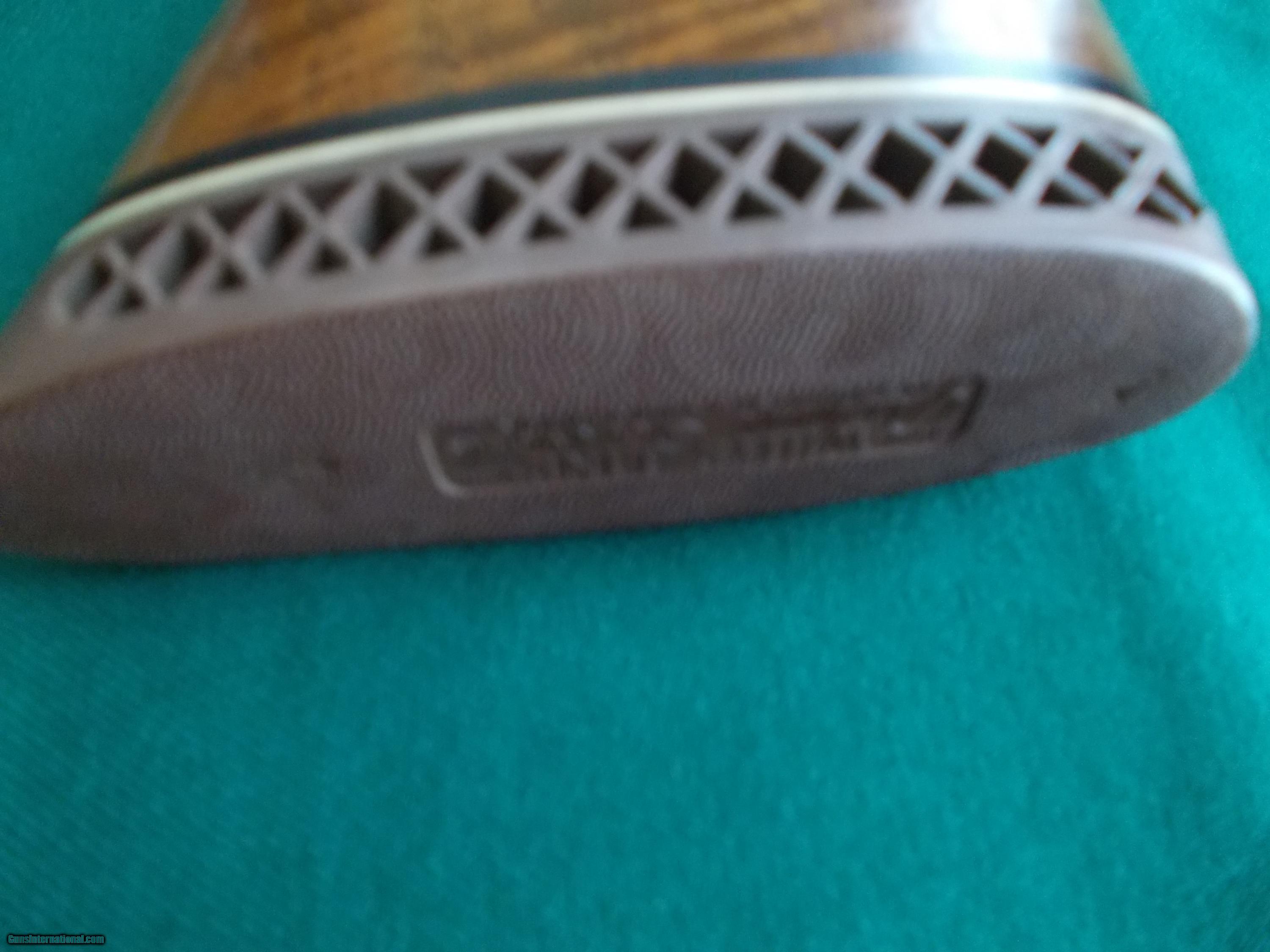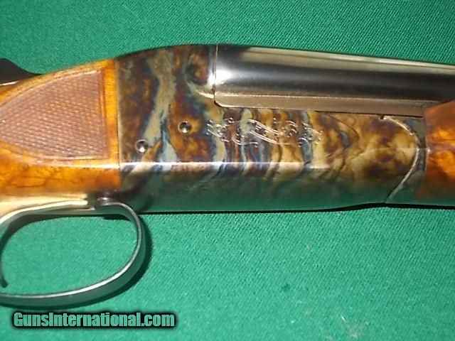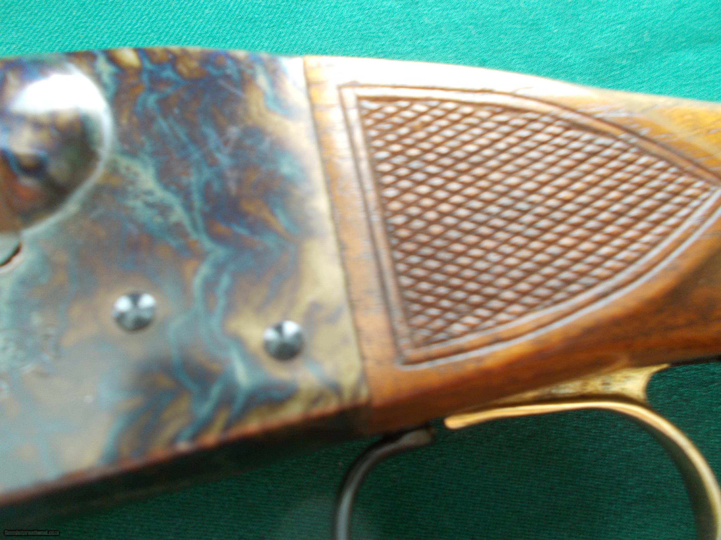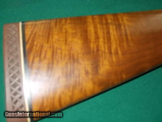Description: 26" vent rib choked IC/M, twin sight beads, single trigger, duck s in flight gamescenes in marsh bog habitat, a most exotic of checkered American walnut PG stock & beavertail forearm, checkered sidepanels, 13 3/4" LOP from a single trigger over 1" vented pad, (This 20ga. SxS is verturally NEW condition!!) SOLD |
