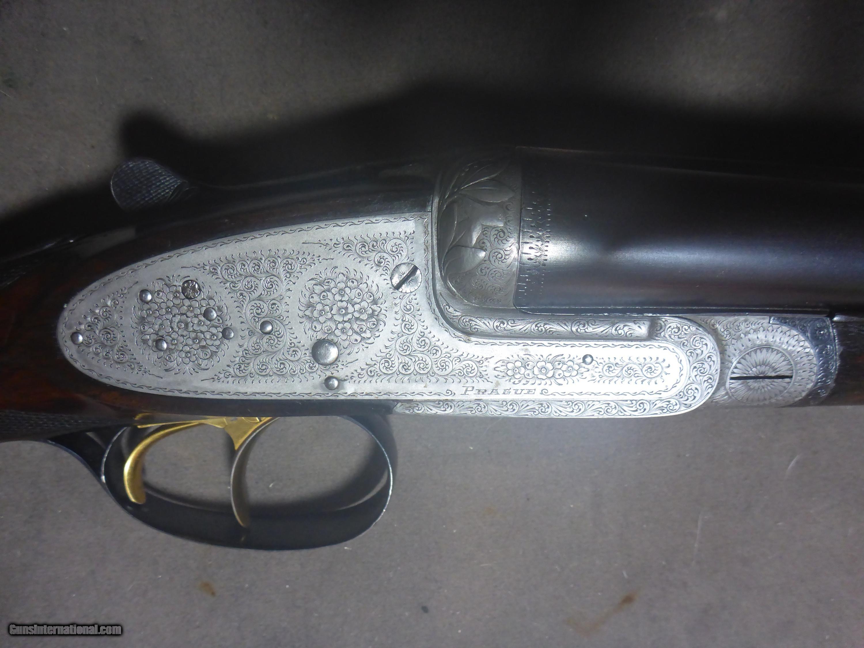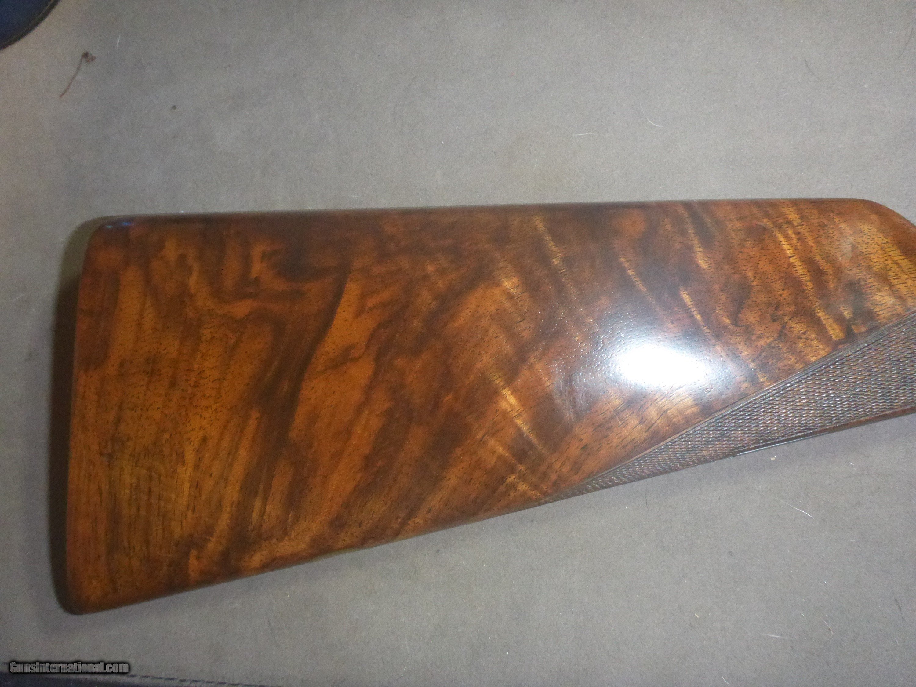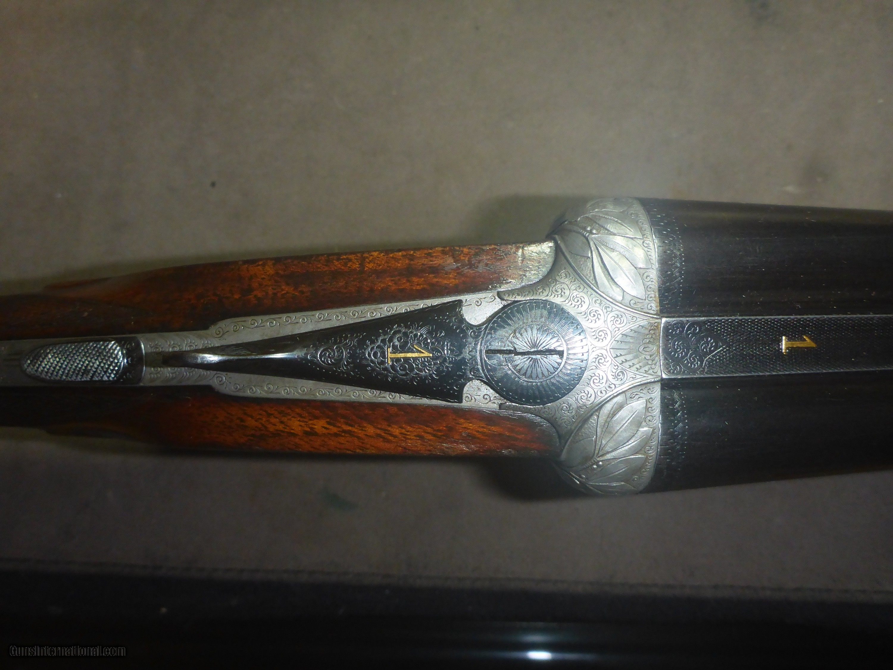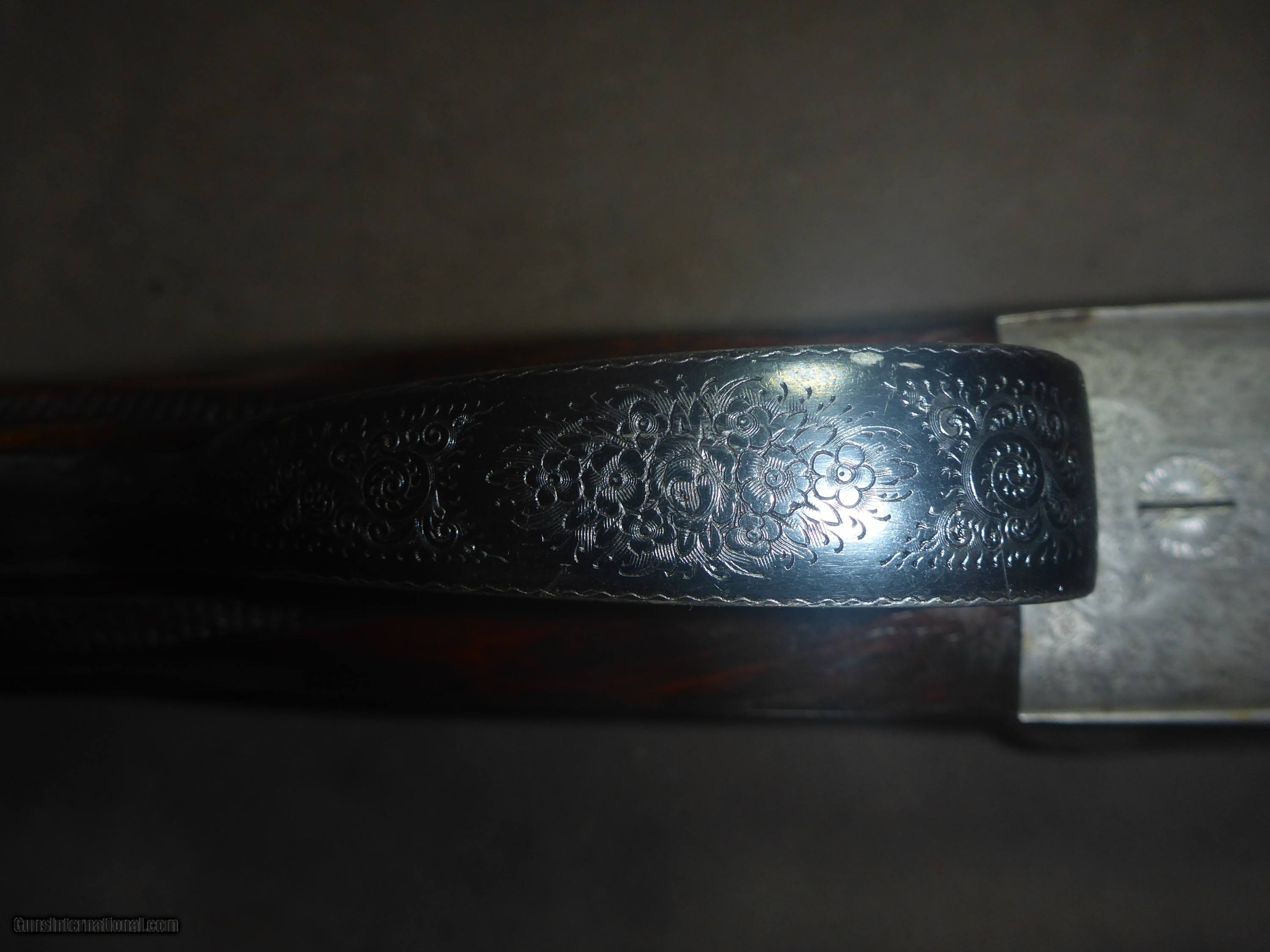 Description: A wonderful Faulkner 16 gauge for sale. This is one of a pair VERY high end gun built in Prague between the wars. Gold washed triggers (front articulated) and internals. Beautifully figured wood with NO bashed checkering and checked butt. LOP is 14 1/4" (could use a pad if desired) Forend also in excellent condition with perfect checkering. Outstanding hand cut Purdey style Rose & Scroll with carved leaves on balls and French Grey finish make this a very handsome gun. The fit and finish of this gun is as good or better than an English gun of the same class and at a price less than most Spanish Doubles !! $3000 FIRM plus FREE shipping to your FFL. If this gun had an British name, it would cost you twice as much !! The quality is every bit as good and perhaps better than many !!! Don't let this one away...it truly is a bargan SOLD Shotgun Gauge: 16 Gauge Manufacturer: Faulkner Model: Sidelock Serial Number: 7828 Barrel Length: 28 Bore: 16 Chambers: 2 1/2" Long forcing cones which can shoot light 2 3/4 Ejectors: Yes Condition: Very good Metal Condition: Very good Wood Condition: Excellent Bore Condition: Excellent Barrel Type: double Action: Sidelock Triggers: Double Stock: Figured Walnut Stock Drop: 2 1/4 Stock Comb: 1 3/8 Stock Heel: 2 1/2 Stock Cast: 1/8 cast off Fore End: splinter LOP: 14 1/4 Rib: Game Finish: Oil Weight: 6 lbs 2 oz Sights: single bead Manufacture Date: Approx 1928 Choke Left: Mod Choke Right: Light IC (skeet) Engraving: 90 % coverage Case: no Item Location: Montana Proof:Nitro: Yes Minimum Wall Thickness Left: .024 Minimum Wall Thickness Right: .023 |