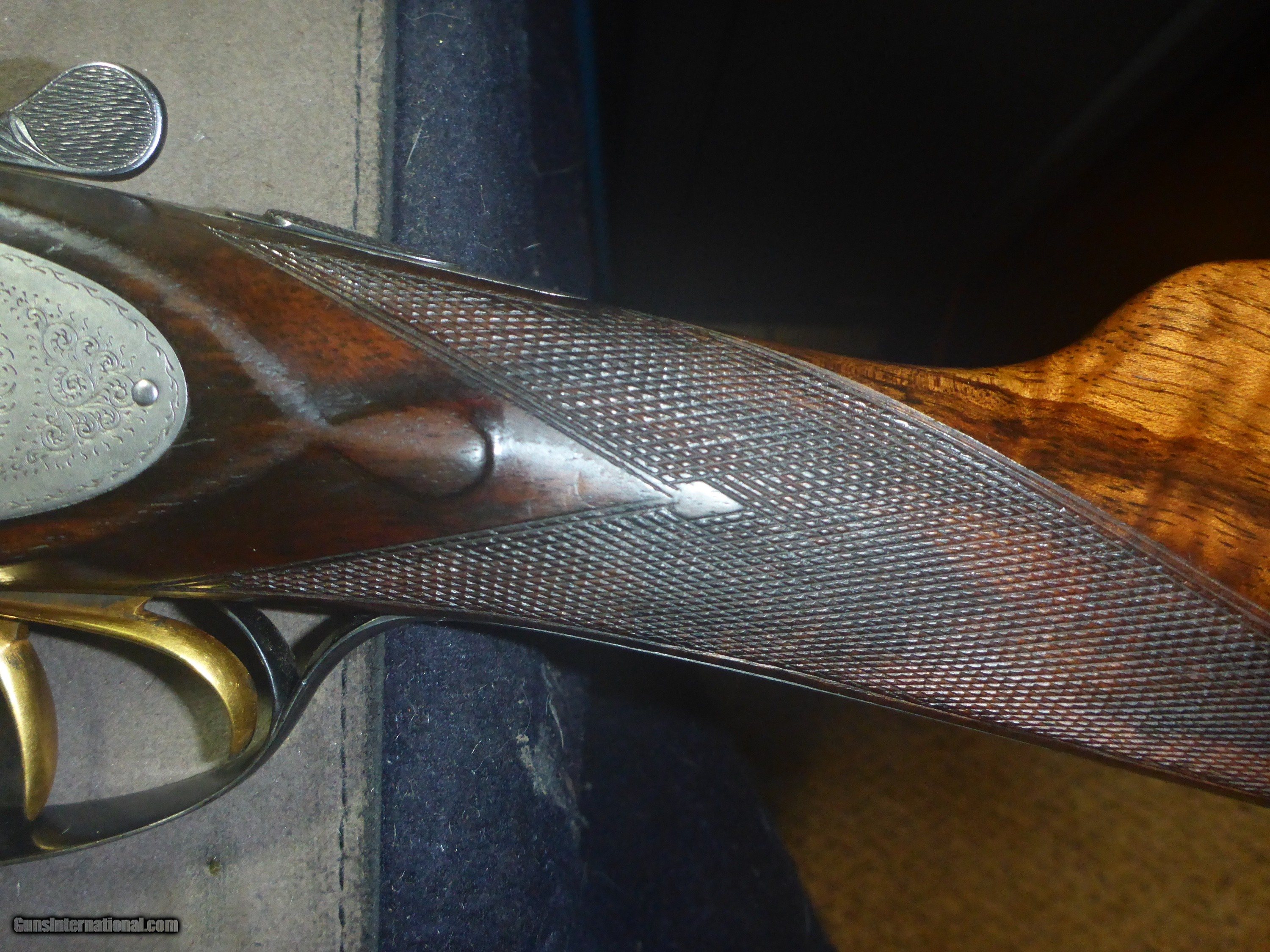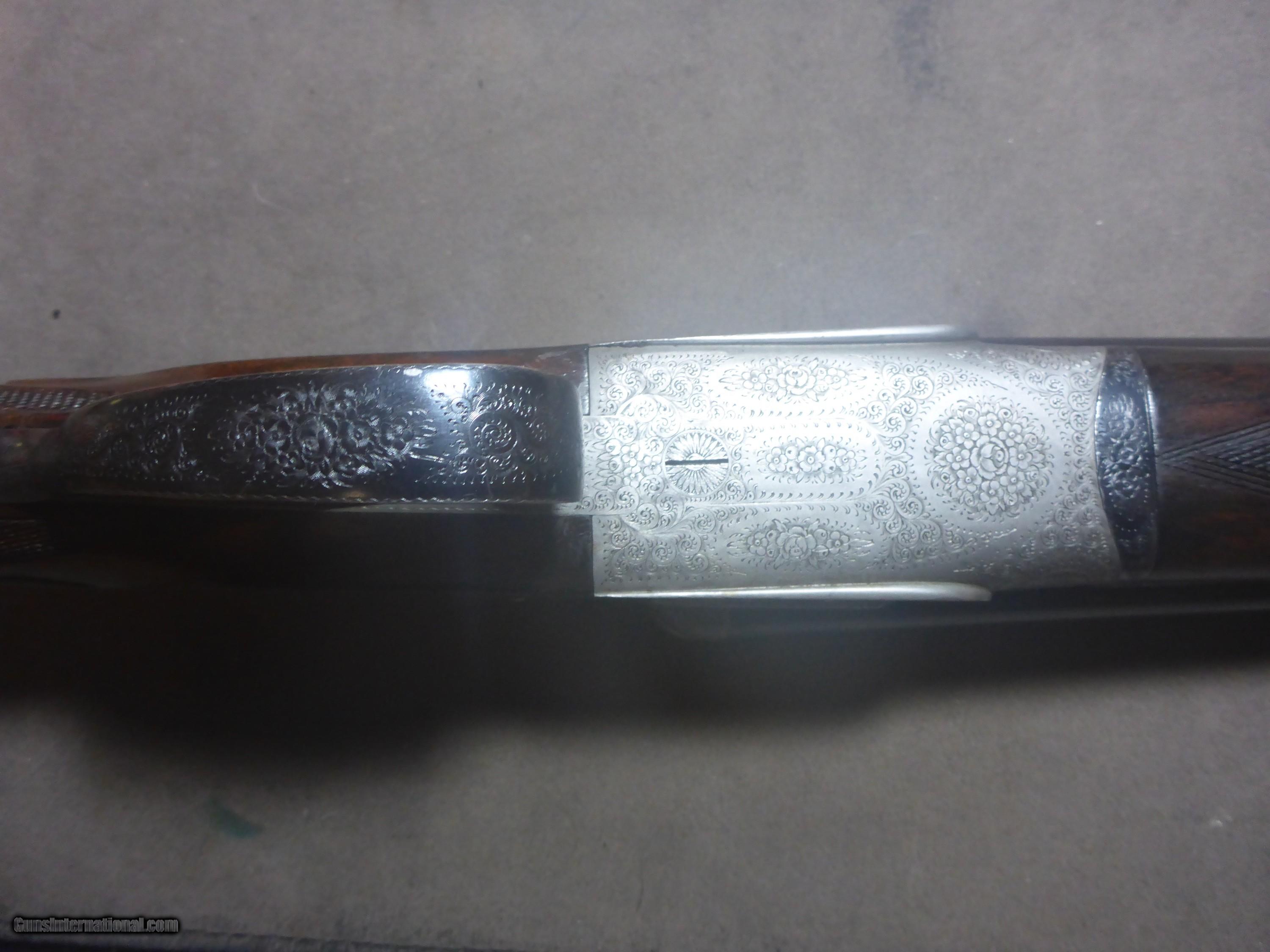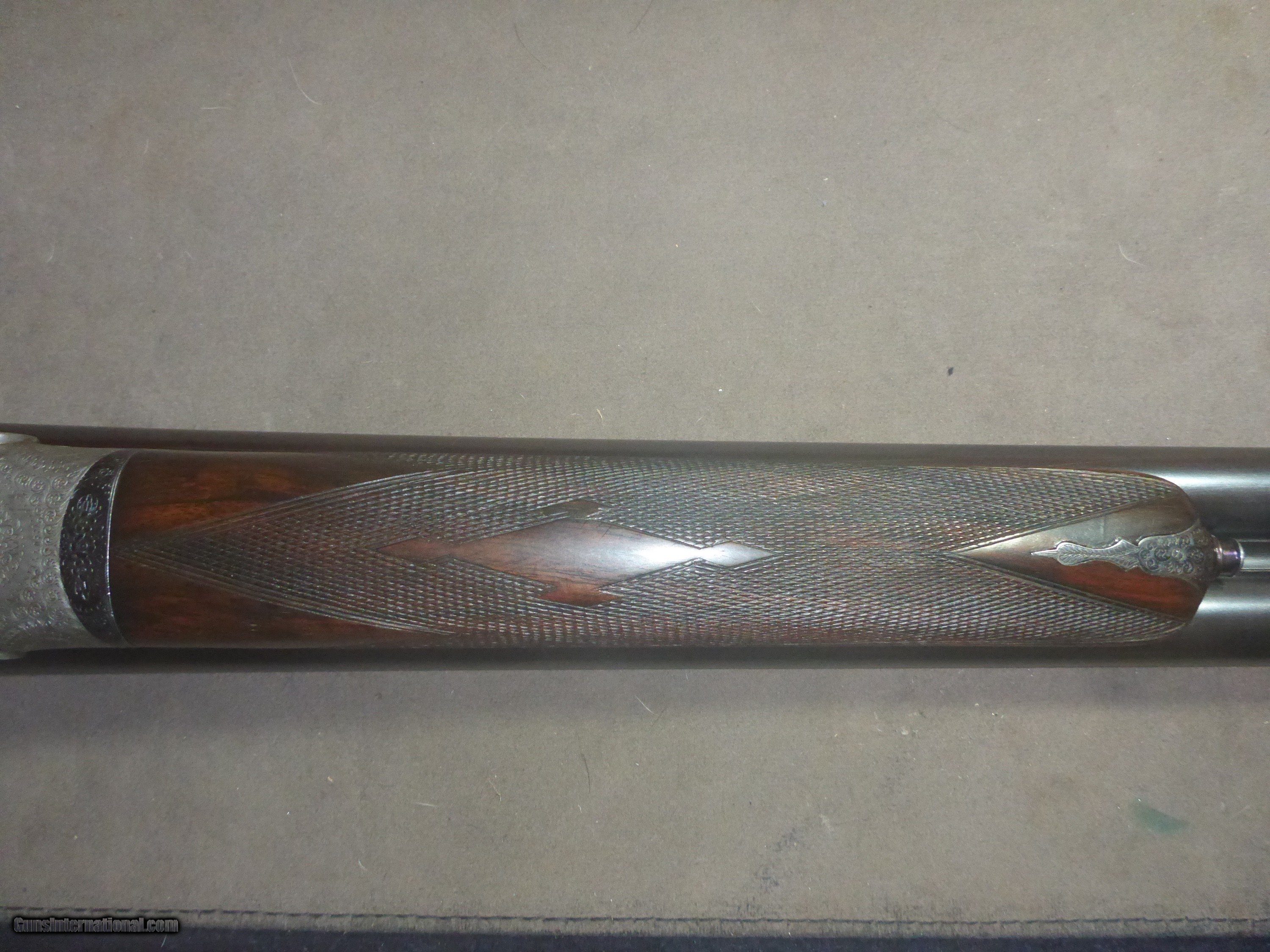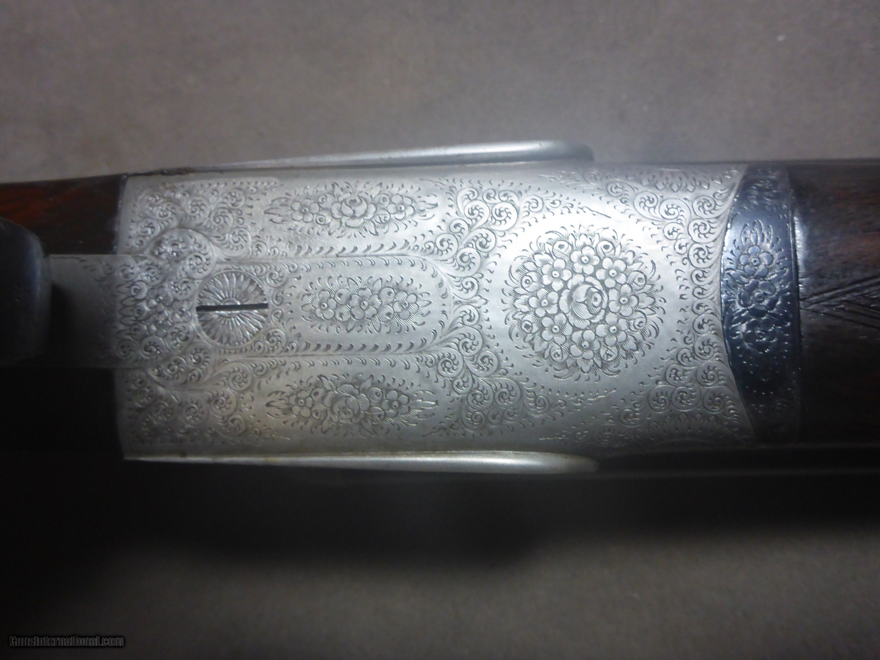 Description: A wonderful Faulkner 16 gauge for sale. This is one of a pair VERY high end gun built in Prague between the wars. Gold washed triggers (front articulated) and internals. Beautifully figured wood with NO bashed checkering and checked butt. LOP is 14 1/4" (could use a pad if desired) Forend also in excellent condition with perfect checkering. Outstanding hand cut Purdey style Rose & Scroll with carved leaves on balls and French Grey finish make this a very handsome gun. The fit and finish of this gun is as good or better than an English gun of the same class and at a price less than most Spanish Doubles !! $3000 FIRM plus FREE shipping to your FFL. If this gun had an British name, it would cost you twice as much !! The quality is every bit as good and perhaps better than many !!! Don't let this one away...it truly is a bargan SOLD Shotgun Gauge: 16 Gauge Manufacturer: Faulkner Model: Sidelock Serial Number: 7828 Barrel Length: 28 Bore: 16 Chambers: 2 1/2" Long forcing cones which can shoot light 2 3/4 Ejectors: Yes Condition: Very good Metal Condition: Very good Wood Condition: Excellent Bore Condition: Excellent Barrel Type: double Action: Sidelock Triggers: Double Stock: Figured Walnut Stock Drop: 2 1/4 Stock Comb: 1 3/8 Stock Heel: 2 1/2 Stock Cast: 1/8 cast off Fore End: splinter LOP: 14 1/4 Rib: Game Finish: Oil Weight: 6 lbs 2 oz Sights: single bead Manufacture Date: Approx 1928 Choke Left: Mod Choke Right: Light IC (skeet) Engraving: 90 % coverage Case: no Item Location: Montana Proof:Nitro: Yes Minimum Wall Thickness Left: .024 Minimum Wall Thickness Right: .023 |