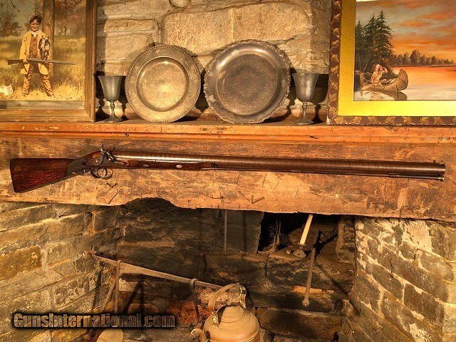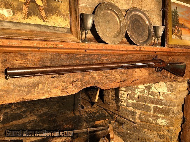 Description: Jeremiah Johnson Trading is one of the most experienced and trusted dealers of antique arms with over 40 years of collecting. We also specialize in antique cars & petroliana, Revolutionary and Civil War artifacts, 19th century nautical & western memorabilia, early Bowie and folding knives, American folk art, and colonial era furnishings. Visit us online at JeremiahJohnsonTrading or find us on Facebook. Our shop is located at 1618 Saybrook Rd. Haddam, CT. Look for the gold '55 Chevy road sign! ~Trades and offers are always considered~ Very Rare High Condition Massive American Made Flintlock "Punt Gun" Shotgun, Converted to Percussion, 4 Ga, mfg. ca. 1810. Directly from my long time personal collection of choice big bore shotguns. These intimidating weapons were preferred by commercial market hunters who made their living supplying local hotels and markets with as much waterfowl as they could harvest on a daily basis. The gun is unmarked and likely American made. It features a 43 5/8" long Damascus barrel fitted with a massive brass bead front sight. It is a true 4 Gauge with an inside muzzle diameter measuring over 1". Many so-called 4 Gauge guns encountered actually measure closer to 5 or 6 Gauge. It is very difficult to find a true 4 bore. Pictures do not do this gun justice, it's huge! The breech alone measures 1 3/4" wide and the overall weight is exactly 13 lbs. The barrel retains 80%+ vivid Damascus finish while the lock and furniture have faded to a rich plum patina. The stock is nicely figured and features a checkered wrist. It may been lightly refinished at some point long ago yet has a very attractive dark finish. Aside from an expertly refitted 1 1/2" x 3/4" piece of wood above the lock and some small repaired cracks around the lock screw the wood remains in great shape with no further damage or repairs. Original iron buttplate, triggerguard, wedges, and ramrod pipes with Silver wedge escutcheons and horn forend cap. Massive brass tipped wood ramrod. The action is crisp and functions flawlessly and the nipple is a perfectly clean original. The barrel is rock solid with no issues whatsoever. Excellent bore with just the slightest frosting. This gun is sound inside and out and I would personally not hesitate to shoot it regularly. Guns of this size and condition do not turn up often! An impressive statement in any antique arms collection. Jeremiah Johnson Trading sells antique firearms manufactured prior to 1899 and muzzleloading blackpowder reproductions only. For the purpose of these conditions the term "antique firearm" will hence include muzzleloading blackpowder reproductions. Buyers must be 21 years of age or older and have no felony convictions to purchase antique firearms. Antique firearms do not require Federal licensing and may be shipped directly to the buyer with the following exceptions. No antique firearms will be shipped to Washington D. C. or any of the five boroughs of New York City or residents thereof. Some restrictions may apply to antique firearms shipped to California and will be noted in the item description if applicable. Any handgun (antique or muzzleloading blackpowder reproduction) shipped to New Jersey must ship to a licensed FFL holder. Any muzzleloading blackpowder reproduction rifle, shotgun, or handgun shipped to Illinois must ship to an FFL holder. No international sales of antique firearms which may fire conventional metallic cartridges or any reproductions regardless of ignition. Antique muzzleloaders, or antiques which fire obsolete cartridges, may be shipped internationally however it is the responsibility of the buyer to know and abide by their local laws and provide proof that the antique arm is legal to receive and own. Absolutely no sales of items containing antique ivory to New York, New Jersey, or California. No sales of bear parts to Alaska, California, Georgia, Kentucky, Massachusetts, Mississippi, Nebraska, New Jersey, North Dakota, South Dakota, Oklahoma, Oregon, Virginia, or West Virginia. Absolutely no international sales of knives or animal parts including items which contain antique ivory. Payment can be made by way of money order, banker's check, or personal check (Please allow 7-10 days for clearance on personal checks). Credit cards accepted for antique arms (no additional fees). If not satisfied with an item within 3 days of receiving it, simply return the item in the same condition as shipped for a full refund, minus return shipping costs. Cleaning, disassembly, or altering of a firearm in any way will void inspection privileges. Layaway may be allowed upon negotiation, but will void inspection privileges. Buyer pays actual shipping & insurance costs. Occasionally a post-1898 firearm from my personal collection may be sold under this account however it will be noted that any such transaction is a personal sale in no way affiliated with our business. Any such arm will be shipped to a licensed FFL or C&R holder in accordance with Federal law. All firearms are sold as collector's items and are not warranted safe for shooting. Please consult a competent gunsmith prior to shooting any firearm. Message or call with any questions about this firearm, or any of our other items at 860-873-1092 (office) or 860-345-2100 (shop). SOLD Antique: Yes Model: Punt Gun Barrels: 43 5/8 Gauge Info: 4 Weight: 13 lbs Manufacture Date: Circa 1810 |
