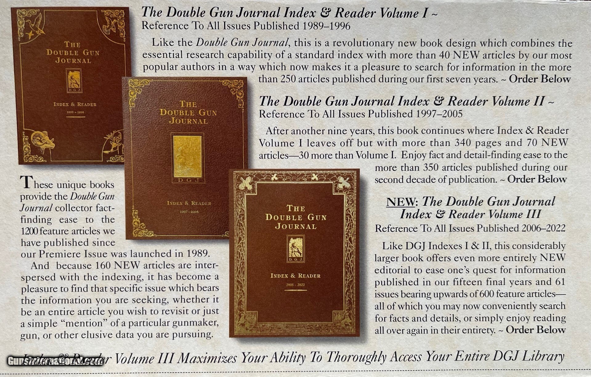 Description: TOLLEY & CO. " The Times Gun", 20-bore, true sidelock action. BOOK : Our new "Double Gun Journal Index & Reader Vol. III" Barrel legend: "Tolley & Co. Makers. Loveday St., Birmingham" 456 pages provide easy research to our last 16 years, Barrels: 26-3/16", IC/Mod., LOP: 13-7/8", DAC: 1-7/16", DAH:2-1/4" Plus : 44 new articles by DGJ authors & 13 classic stories and Weight: 4 lbs.-- 12.2 Oz.. editorial from century old sporting periodicals of the golden era J & W Tolley was one of the first manufacturers of sidelock guns in provide the kind of DGJ reading pleasure you enjoyed for 32 years. England, and was famous for the production of rifles for dangerous ***************** game until the younger brother, Henry, founded Tolley & Co. in 1880. Trade Edition (shown): $150 Limited Edition: $500 Ppd. to U.S. $ 4500 *** See "Notice" bottom left. See Photos of this gun and note Picture 14 describes Index & Readers I, II, & III Questions / Orders/ Offers: Please call 800- 447-1658 *** Notice (Or message us via Guns International Messaging Service.) Purchase Volumes I, II, or III and discount book('s) cost from price of gun. Thank you for your consideration, ( Call Us 800.447.1658 If You Have Any Questions.) Daniel & Joanna Côté The Double Gun Journal 1989--2022 Curio/Relic: Yes Manufacturer: Tolley & Co. Bore Info: 20 Condition: VERY GOOD Barrel Type: Fluid Steel Price: $4,500.00 Buy Now Contact Seller |