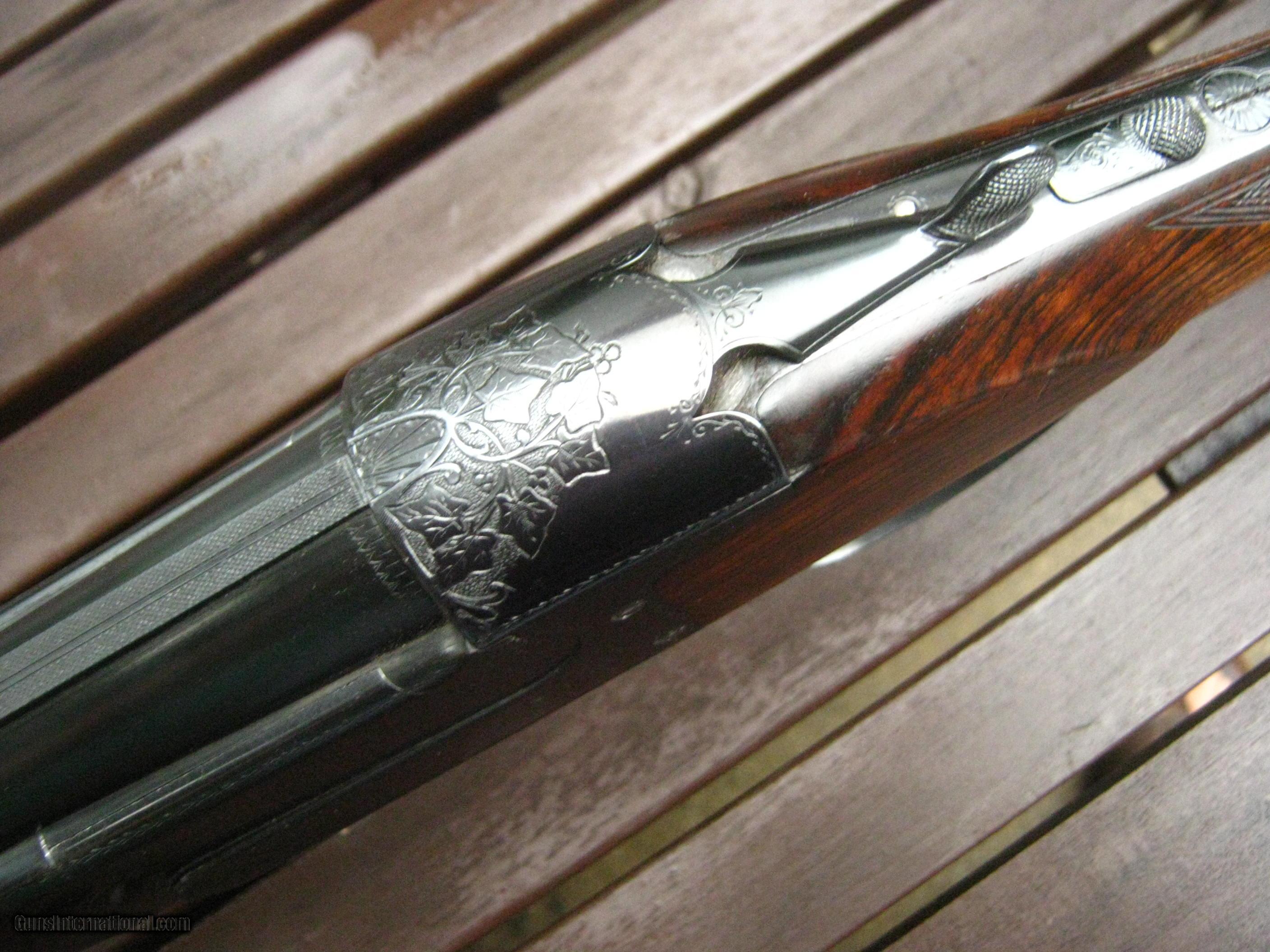 Description: Gastinne Renette 12ga 70mm, ejector ,canon plume , made in Saint Etienne by Damon in the 60s for the prestigious parisian maker and dealer Gastine Renette , same art deco fonts than used by Damon . Patented by Boniface Petrik in 1920 the system have been picked up by Dupont Remington then Krieghoff . Valmet kept the no-hinge-pin system on its double rifles . When Damon closed , Jolivet picked up the production . In 2004 Darne added the production of the Petrik as the Darne O/U . Because it is a so good and strong design . It is rare to see a Damon Petrik that nice , nice filing of the receiver , art-nouveau ivy engraving and nice wood . Very clean . NB stock have a hard to see crack on the left grip , fixed , due to stock bending to the right . barrels: 27''1/2 Plume construction, imported steel " Acier Nickel LLH L Lochet & Habrant " Liege St Etienne triple proof . 1150kg / cm2 or 16,356 psi ch 70mm LOP center buttplate 13'' 3/4 barrels thickness .26 choke IC & extra full 6lbs 7.4oz 2930 gr drop at heel 2 '' 3/8 cast , right about 10mm 3/8'' SOLD Manufacturer: Damon Model: Petrik Caliber Info: 12 Ejectors: yes Gauge Info: 12 Engraving: yes |