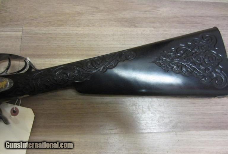 Description: Khezi & Iaehimek Varsovie Faubourg De Eracovie, the very finest percussion 10ga. Shotgun. Double trigger, straight stock, carved ebony wood, depicting gold raised hunting scenes, men, hounds, boar, and fox. This is the very finest high art shotgun to come to market, with every conceivable tool and accessory, in its magnificent wood case with all precious metal inlays, with cherubs, crowns and enameling to the very highest level of workmanship. Extremely ornate with the highest level detailed engraving ever seen on a gun of this era. The gun remains virtually new and unused, not retouched or refinished in its French Fitted case. Inv# 11811 POR SOLD |